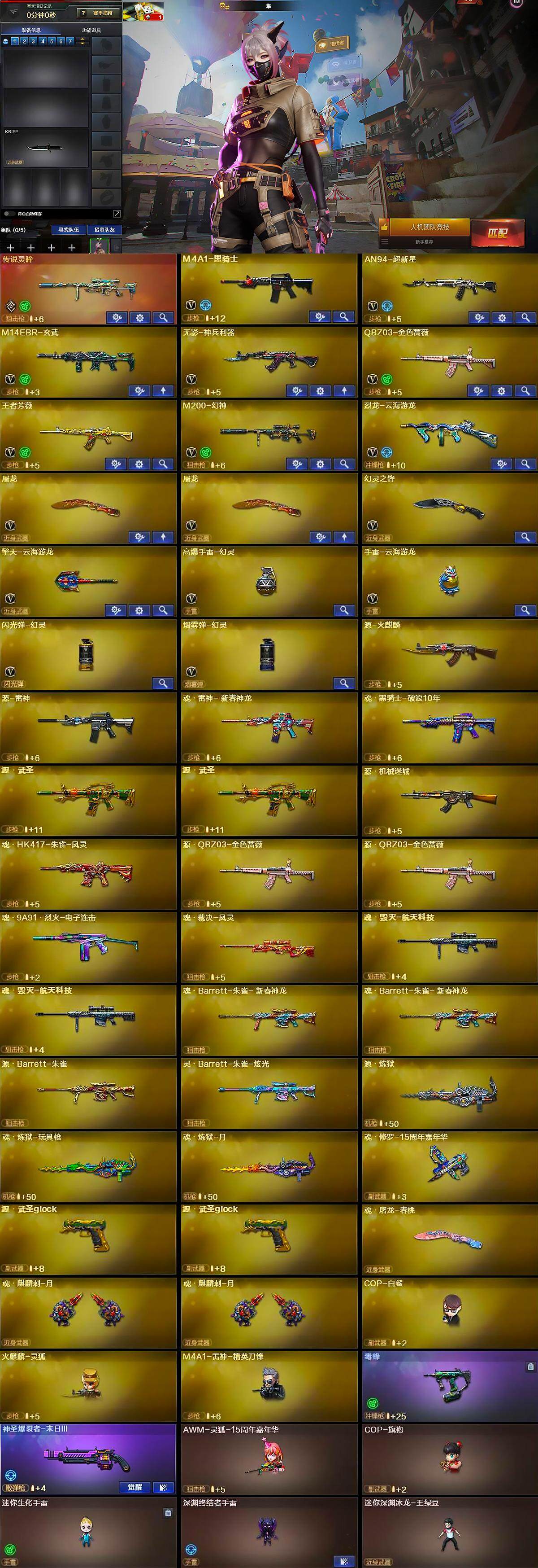 - [15242586]江西一区-52V-11王者-4炫金 【热门武器】:HK417-朱雀,M4A1-青龙,M200-幻神,死亡之眼,炼狱-迷你小钢,M4A1-黑骑士*3,汤姆逊-烈龙*3,RPK-盘龙*4,加特林-炼狱*2,降世魔童,沙鹰-修罗*4,金刚伞 【王者炫金武器】:王者之鲨,王者之戮,王者之翼,王者之怒,炼狱-悦蓝*2,炫金骑士*2,炫金无影,炫金修罗 【音效卡】:Barrett-毁灭音效卡,AWM-昌龙-怀旧音效卡 【皮肤】:雷神-星空,火麒麟-雷神,火麒麟-冠军之心,毁灭耀金皮肤*2,毁灭-星空,毁灭-英雄计划 皮肤,黑龙-能量核心,黑骑士耀金皮肤,无影耀金皮肤*2,天龙-能量核心,极光-能量核心,炼狱-星空 【角色】:瞳,鹰,战地猎狐,王者-瞳-闭月羞花,奇洋探员,乔伊教练,云海玲珑,初恋灵狐,芳心审判者,风暴女,嘉年华灵狐,兰-新年限定,麻雀,曼陀罗-X,潘多拉-X,雪莉杨 【人偶武器】:火麒麟-灵狐,M4A1-雷神-精英刀锋,炼狱-迷你小钢,AWM-灵狐-15周年嘉年华,迷你深渊冰龙,迷你牛魔王,灵狐娃娃手雷,降世魔童 【暴走生化】:死亡之眼 【挑战大师】:神圣爆裂者III,AK47-冰龙粉碎者,冰龙粉碎者-白马银枪,激光毁灭者III 【英雄级武器】:M4A1-千变,AK47-火麒麟,M4A1-雷神*3,M4A1-黑骑士*3,AK47-无影,AK47-黑武士*6,M4A1-龙血*2,M4A1-青龙,HK417-朱雀,M4A1-玫瑰精灵,王者冰魄-觉醒版,AWM-天龙*5,Barrett-毁灭,Barrett-极光,AWM-裁决,M200-幻神,RPK-盘龙*4,加特林-炼狱*2,汤姆逊-烈龙*3,烈龙-悦心-觉醒版*3,AA-12-雷霆,沙鹰-修罗*4,沙鹰-天神,屠龙*2,麒麟刺,M4A1-赤狱骑士,M4A1-苍鸣雷神,AWM-昌龙 【道具】:云山科技背包,亚洲杯纪念炫彩背包,炫彩背包-诺拉,背包-洛丽塔,黑桃战神背包,女皇终结者-魔龙之吻,救世主-黑桃战神,黄金生化钩,绿色巨人,灵魂忍者,变异宝贝,迷雾幽灵,生化弹匣,夺命之镰,防化服*3,金色流光-枪王排位,星辰流光-枪王排位,流光-再燃火线,枪王排位28赛季金色流光,枪王排位29赛季金色流光,电玩兔兔表情,热带奇洋表情,动感闪耀表情,云海游龙表情,EP战队名片,防弹头盔*5,防弹衣*4,C4工具钳*4,手雷包