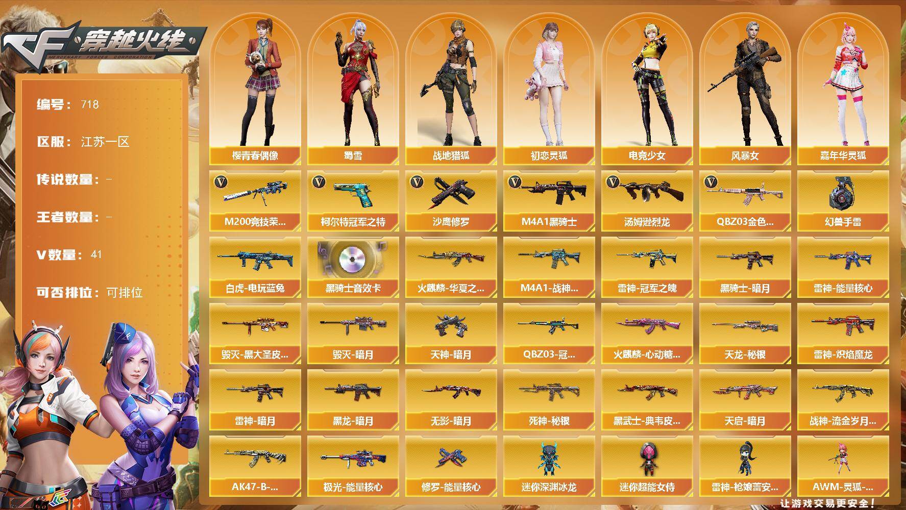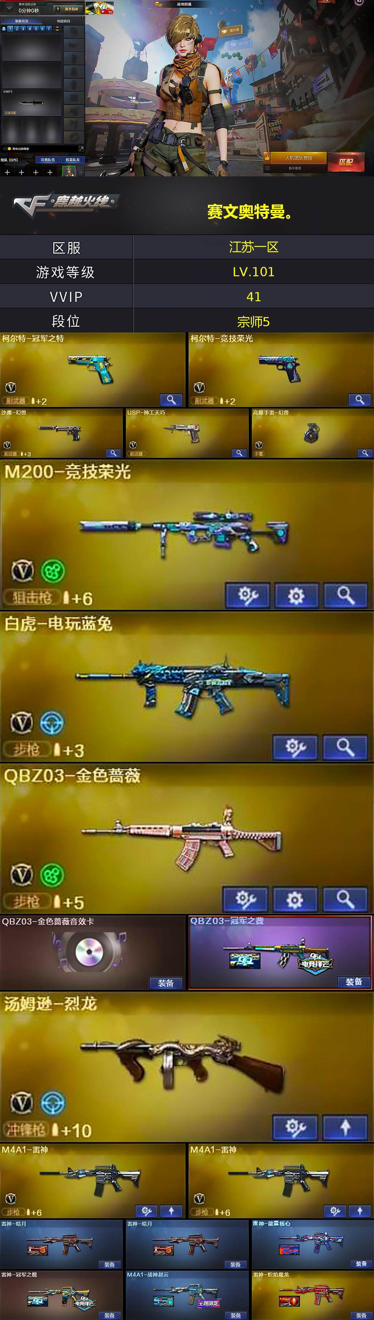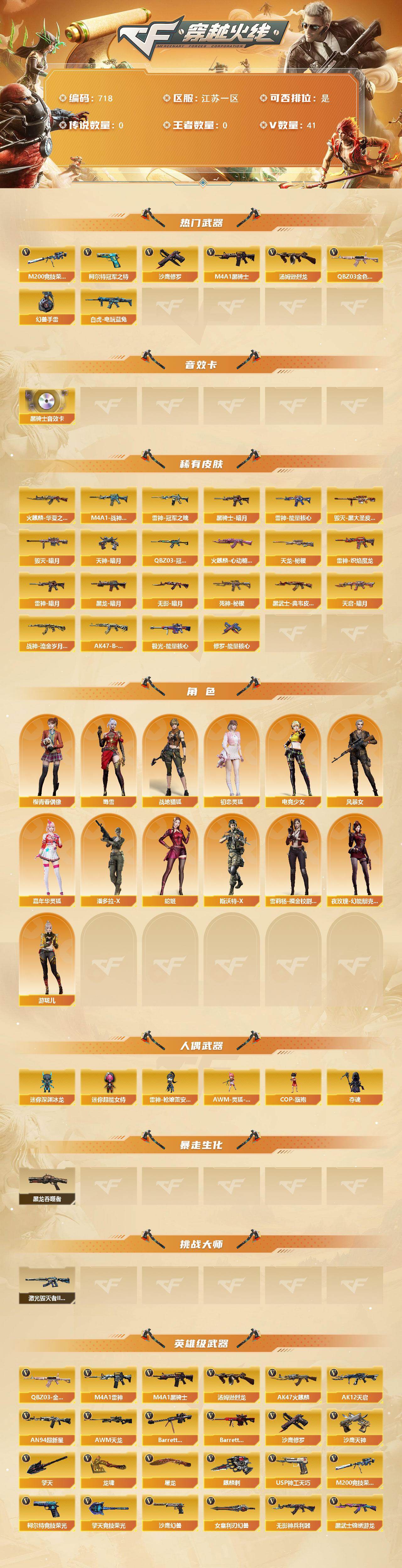 [15314381]江苏一区-41V-0王者-0炫金 【热门武器】:QBZ03-金色蔷薇,M200-竞技荣光,白虎-电玩蓝兔,柯尔特-冠军之特,M4A1-黑骑士,汤姆逊-烈龙,沙鹰-修罗,高爆手雷-幻兽 【音效卡】:M4A1-黑骑士音效卡 【皮肤】:QBZ03-冠军之薇,雷神-暗月*2,雷神-能量核心,雷神-冠军之魄,M4A1-战神赵云,雷神-炽焰魔龙,火麒麟-华夏之心,火麒麟-心动糖果,毁灭-暗月,毁灭-黑大圣皮肤,黑龙-暗月,黑骑士-暗月*3,无影-暗月,死神-秘银,黑武士-典韦皮肤,天启-暗月*2,战神-流金岁月皮肤*2,AK47-B-常胜将军-刘备,天龙-秘银,极光-能量核心,修罗-能量核心,天神-暗月*4 【角色】:战地猎狐,初恋灵狐,电竞少女,风暴女,嘉年华灵狐,潘多拉-X,蛇姬,斯沃特-X,蜀雪,雪莉杨-摸金校尉,夜玫瑰-幻能朋克,樱-青春偶像,游珑儿 【人偶武器】:雷神-枪娘蕾安娜,AWM-灵狐-15周年嘉年华,COP-旗袍,迷你深渊冰龙,夺魂,迷你超能女侍 【暴走生化】:黑龙吞噬者 【挑战大师】:激光毁灭者III-白马银枪 【英雄级武器】:AK47-火麒麟*2,M4A1-雷神*2,M4A1-黑骑士,AK12-天启,AN94-超新星,无影-神兵利器,黑武士-锦绣游龙,QBZ03-金色蔷薇,白虎-电玩蓝兔,AWM-天龙,Barrett-毁灭,Barrett-极光,M200-竞技荣光,汤姆逊-烈龙,沙鹰-修罗,沙鹰-天神,柯尔特-冠军之特,柯尔特-竞技荣光,沙鹰-幻兽,USP-神工天巧,屠龙,龙啸,擎天*2,麒麟刺,擎天-竞技荣光,女皇利刃-幻兽,高爆手雷-幻兽,高爆手雷-竞技荣光,闪光弹-幻兽,闪光弹-竞技荣光,烟雾弹-幻兽,烟雾弹-竞技荣光*3 【道具】:BS战队炫彩背包,全能枪王背包,古蛇迷踪炫彩背包,战舰背包,超级背包,救世主-黑桃战神,变异宝贝,生化弹匣,夺命之镰*2,防化服,金色流光-枪王排位*2,星辰流光-枪王排位,枪王排位28赛季金色流光,枪王排位29赛季金色流光,电玩兔兔表情,防弹头盔*7,防弹衣*7,C4工具钳*7,手雷包*7 【特殊枪械】:1黑骑士,1烈龙