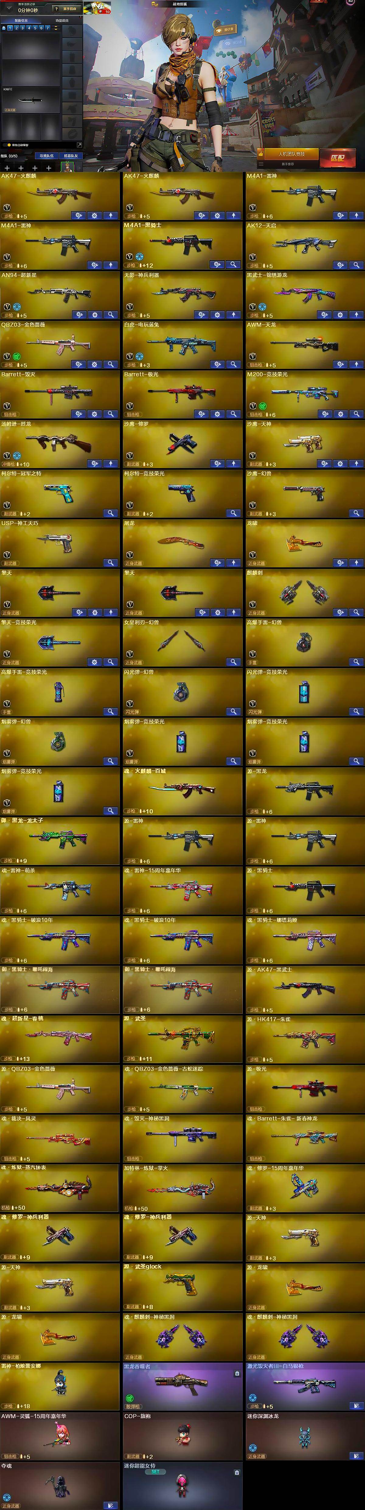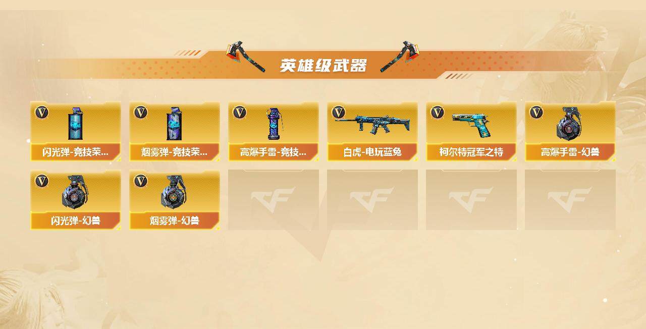 【英雄级武器】:AK47-火麒麟*2,M4A1-雷神*2,M4A1-黑骑士,AK12-天启,AN94-超新星,无影-神兵利器,黑武士-锦绣游龙,QBZ03-金色蔷薇,白虎-电玩蓝兔,AWM-天龙,Barrett-毁灭,Barrett-极光,M200-竞技荣光,汤姆逊-烈龙,沙鹰-修罗,沙鹰-天神,柯尔特-冠军之特,柯尔特-竞技荣光,沙鹰-幻兽,USP-神工天巧,屠龙,龙啸,擎天*2,麒麟刺,擎天-竞技荣光,女皇利刃-幻兽,高爆手雷-幻兽,高爆手雷-竞技荣光,闪光弹-幻兽,闪光弹-竞技荣光,烟雾弹-幻兽,烟雾弹-竞技荣光*3