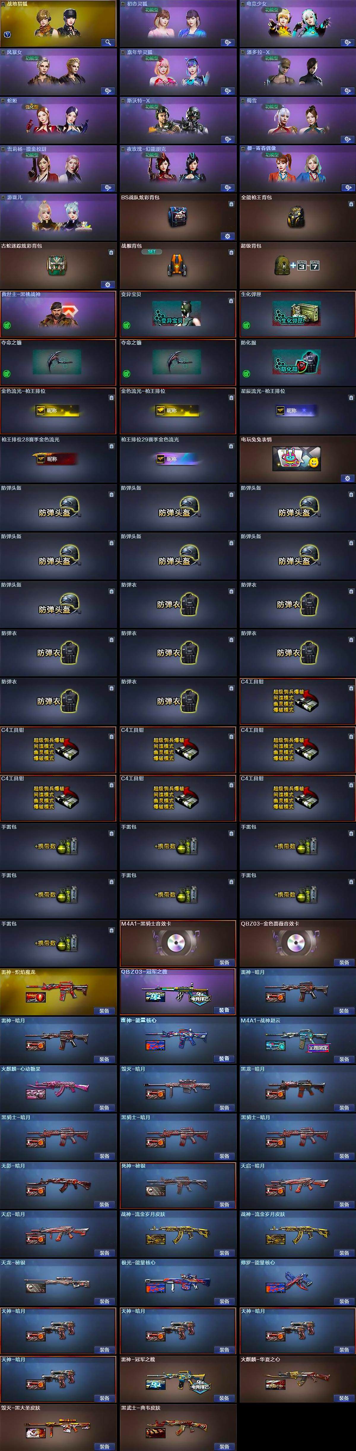 【道具】:BS战队炫彩背包,全能枪王背包,古蛇迷踪炫彩背包,战舰背包,超级背包,救世主-黑桃战神,变异宝贝,生化弹匣,夺命之镰*2,防化服,金色流光-枪王排位*2,星辰流光-枪王排位,枪王排位28赛季金色流光,枪王排位29赛季金色流光,电玩兔兔表情,防弹头盔*7,防弹衣*7,C4工具钳*7,手雷包*7