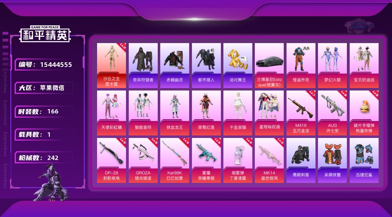 [15444555]可二次【店主推荐捡漏号!可直接换绑】素材号/地铁满天赋 苹果 微信-1神装-9粉装-9特效枪-1载具-3粉色飞行器-79063热力值-13王牌印记-166套装-242枪皮【红色神装等级】:沙丘之主-图卡盟(二级)【红色角色神装