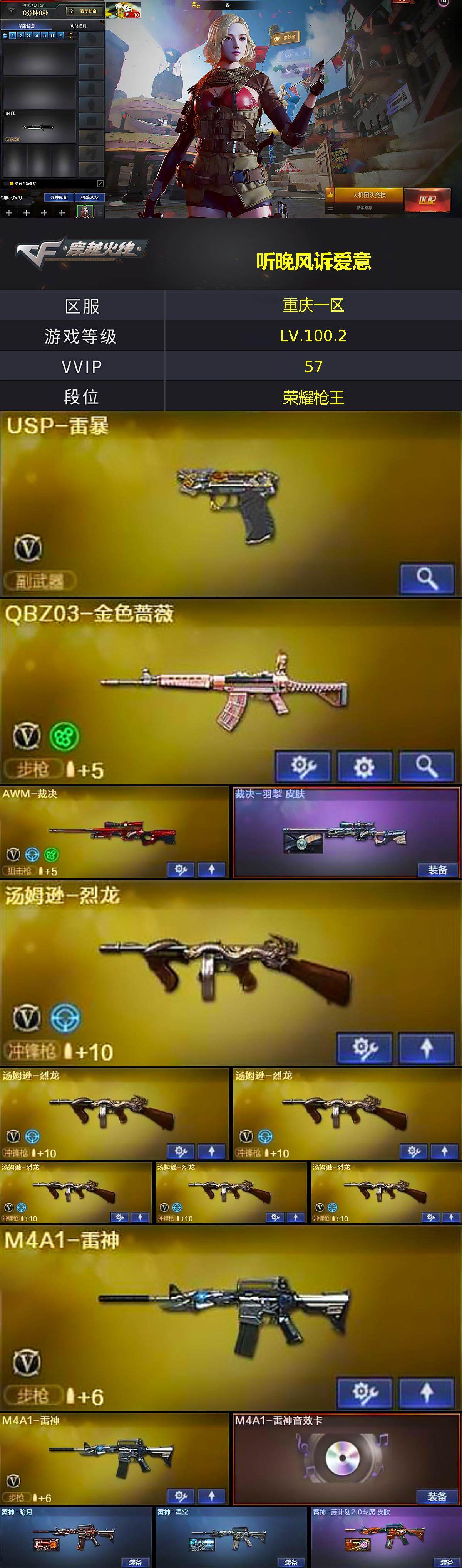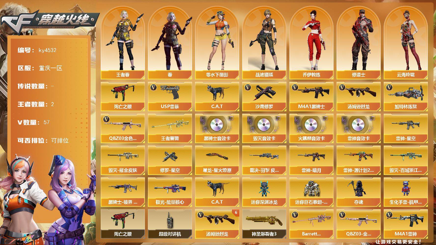 [15249112]重庆一区-57V-2王者-0炫金 【热门武器】:QBZ03-金色蔷薇,死亡之眼,C.A.T,M4A1-黑骑士,汤姆逊-烈龙*6,加特林-炼狱,USP-雷暴,沙鹰-修罗*4 【王者炫金武器】:王者蔷薇 【音效卡】:AK47-火麒麟音效卡,M4A1-雷神音效卡,M4A1-黑骑士音效卡,Barrett-毁灭音效卡 【皮肤】:裁决-羽掣 皮肤,雷神-暗月,雷神-星空,雷神-源计划2.0专属 皮肤,毁灭耀金皮肤,毁灭-百城浙江 皮肤,黑骑士-破界 皮肤,极光-能量核心,修罗-星空,屠龙-星火燎原 【角色】:春,战地猎狐,王者春,奇洋探员,乔伊教练,修道士,云海玲珑,飞虎队-X,猎狐者-追月,0号玩家,零-水下丽影,潘多拉-X,潘多拉-甜心教官,维纳斯,新娜塔莎,雪莉杨,雪莉杨-摸金校尉,夜玫瑰-宠粉,游珑儿,智影 【人偶武器】:C.A.T,迷你深渊冰龙,夺魂,生化手雷-机甲核心,迷你巨石泰坦-魔花研究所 【暴走生化】:死亡之眼,超级对讲机 【挑战大师】:神圣爆裂者III 【英雄级武器】:AK47-火麒麟,M4A1-雷神*2,M4A1-黑骑士,AK12-天启,AK47-雷暴,黑武士-锦绣游龙,QBZ03-金色蔷薇,王者之圣-觉醒版,Barrett-毁灭,Barrett-极光,AWM-裁决,Barrett-金色蔷薇,加特林-炼狱,汤姆逊-烈龙*6,沙鹰-修罗*4,沙鹰-天神*2,USP-雷暴,屠龙*2,龙啸,擎天*2,麒麟刺,斩神刀-雷暴,高爆手雷-雷暴*7,高爆手雷-云龙,闪光弹-雷暴*7,烟雾弹-雷暴*6,M4A1-赤狱骑士,AWM-昌龙 【道具】:BS战队炫彩背包,CFS限定背包,亚洲杯纪念炫彩背包,次元之矛-背包,炫彩背包-诺拉,炫彩背包,背包-洛丽塔,超级背包,女皇终结者-魔龙之吻,救世主-黑桃战神,绿色巨人,灵魂忍者,变异宝贝,迷雾幽灵,生化弹匣*2,夺命之镰,防化服*3,星辰流光-枪王排位,流光-再燃火线,枪王排位28赛季金色流光,枪王排位29赛季金色流光,循环实验表情,EP战队名片,EP战队喷图,防弹头盔*3,防弹衣*3,C4工具钳*3,手雷包*3 【特殊枪械】:1黑骑士,6烈龙,1炼狱