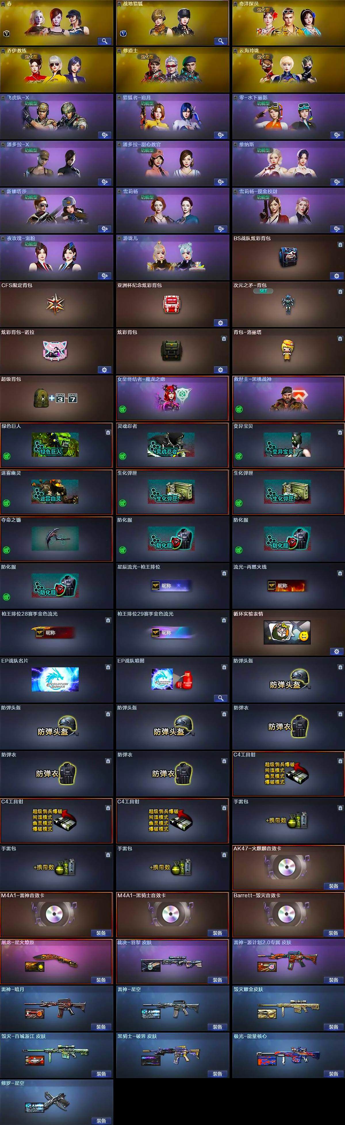 【道具】:BS战队炫彩背包,CFS限定背包,亚洲杯纪念炫彩背包,次元之矛-背包,炫彩背包-诺拉,炫彩背包,背包-洛丽塔,超级背包,女皇终结者-魔龙之吻,救世主-黑桃战神,绿色巨人,灵魂忍者,变异宝贝,迷雾幽灵,生化弹匣*2,夺命之镰,防化服*3,星辰流光-枪王排位,流光-再燃火线,枪王排位28赛季金色流光,枪王排位29赛季金色流光,循环实验表情,EP战队名片,EP战队喷图,防弹头盔*3,防弹衣*3,C4工具钳*3,手雷包*3