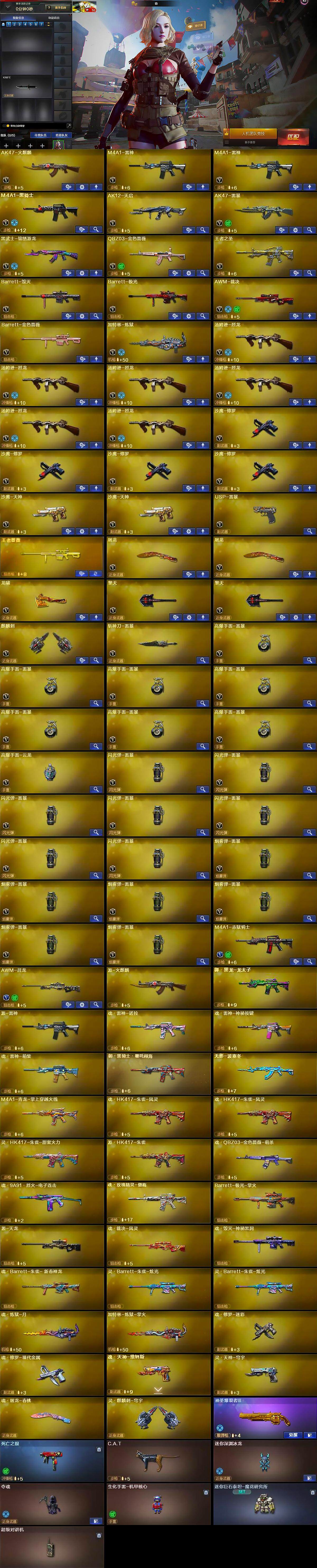 【英雄级武器】:AK47-火麒麟,M4A1-雷神*2,M4A1-黑骑士,AK12-天启,AK47-雷暴,黑武士-锦绣游龙,QBZ03-金色蔷薇,王者之圣-觉醒版,Barrett-毁灭,Barrett-极光,AWM-裁决,Barrett-金色蔷薇,加特林-炼狱,汤姆逊-烈龙*6,沙鹰-修罗*4,沙鹰-天神*2,USP-雷暴,屠龙*2,龙啸,擎天*2,麒麟刺,斩神刀-雷暴,高爆手雷-雷暴*7,高爆手雷-云龙,闪光弹-雷暴*7,烟雾弹-雷暴*6,M4A1-赤狱骑士,AWM-昌龙