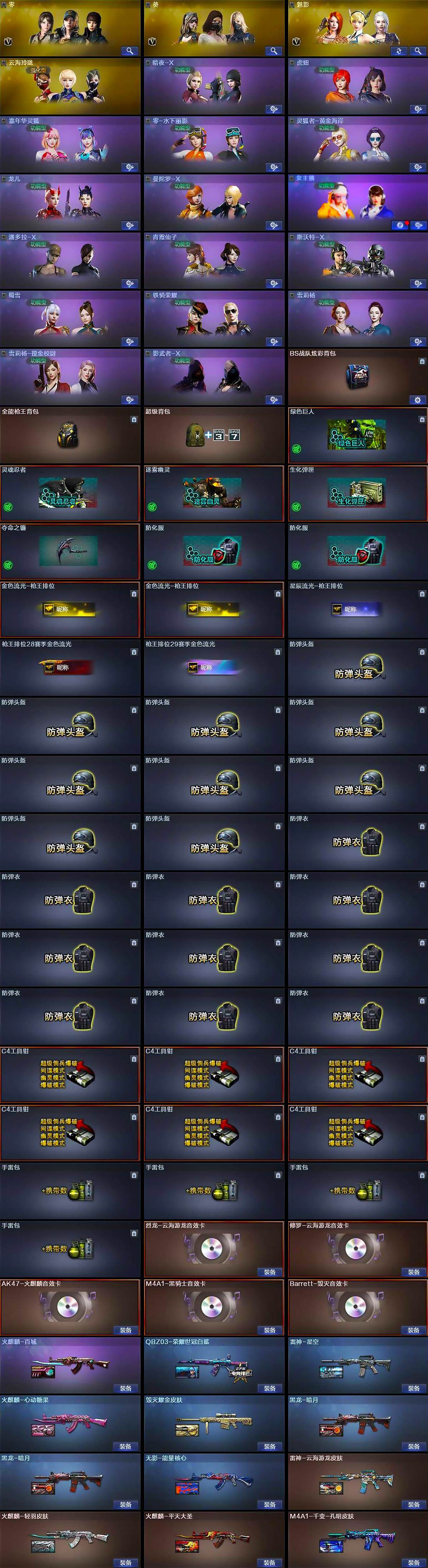 【道具】:BS战队炫彩背包,全能枪王背包,超级背包,绿色巨人,灵魂忍者,迷雾幽灵,生化弹匣,夺命之镰,防化服*2,金色流光-枪王排位*2,星辰流光-枪王排位,枪王排位28赛季金色流光,枪王排位29赛季金色流光,防弹头盔*9,防弹衣*10,C4工具钳*6,手雷包*4