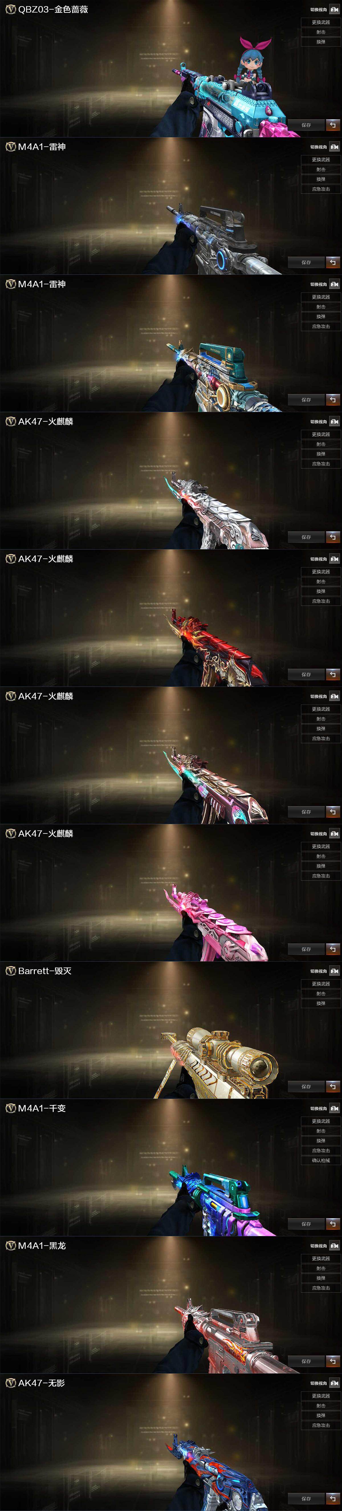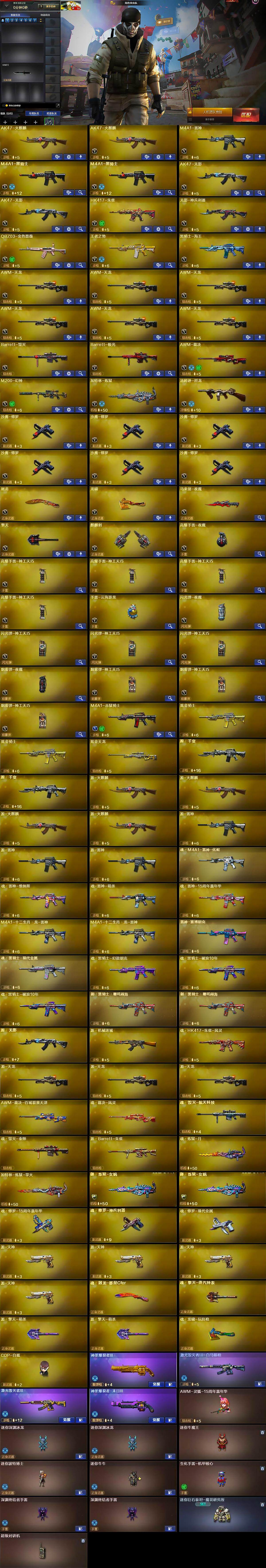 【英雄级武器】:AK47-火麒麟*2,M4A1-雷神,M4A1-黑骑士*2,AK47-无影*2,HK417-朱雀,无影-神兵利器,QBZ03-金色蔷薇,王者之势-觉醒版,黑骑士-海王,AWM-天龙*6,Barrett-毁灭,Barrett-极光,AWM-裁决,M200-幻神,加特林-炼狱,汤姆逊-烈龙,沙鹰-修罗*6,屠龙,龙啸,马来剑-夜魔,擎天,麒麟刺,高爆手雷-夜魔,高爆手雷-神工天巧*4,手雷-云海游龙,闪光弹-夜魔,闪光弹-神工天巧*3,烟雾弹-夜魔,烟雾弹-神工天巧*3,M4A1-赤狱骑士