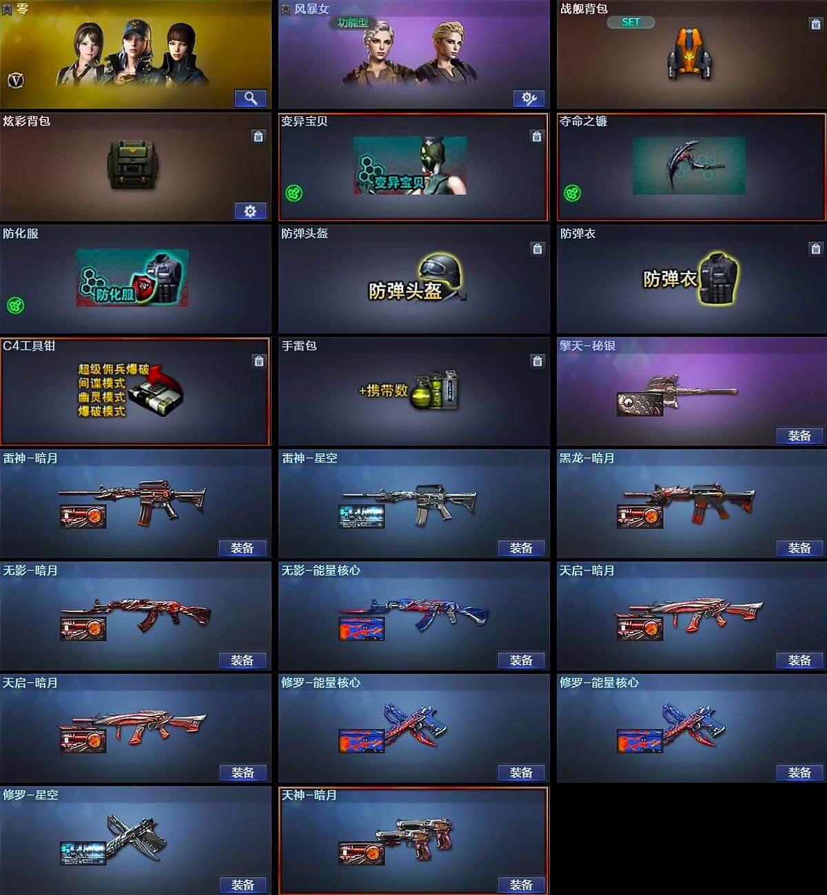 【道具】:战舰背包,炫彩背包,变异宝贝,夺命之镰,防化服,防弹头盔,防弹衣,C4工具钳,手雷包