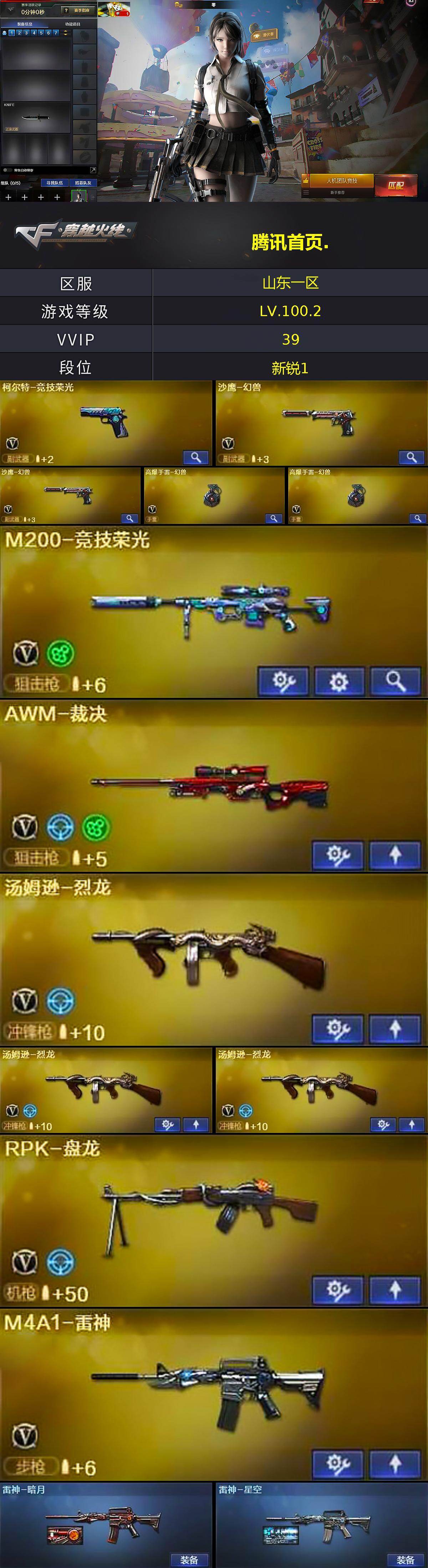 [15314339]山东一区-39V-3王者-1炫金 【热门武器】:M200-竞技荣光,死亡之眼,M4A1-黑骑士,汤姆逊-烈龙*3,RPK-盘龙,沙鹰-修罗*2,高爆手雷-幻兽*2 【王者炫金武器】:王者之怒,炼狱-悦蓝,王者之魂,炫金毁灭 【皮肤】:雷神-暗月,雷神-星空,黑龙-暗月,无影-暗月,无影-能量核心,天启-暗月*2,修罗-能量核心*2,修罗-星空,天神-暗月,擎天-秘银 【角色】:零,风暴女 【人偶武器】:M4A1-刀锋 【暴走生化】:死亡之眼 【英雄级武器】:AK47-火麒麟,M4A1-雷神,M4A1-黑骑士,AK47-无影,M4A1-武圣,Barrett-毁灭,AWM-裁决,M200-竞技荣光,RPK-盘龙,汤姆逊-烈龙*3,沙鹰-修罗*2,沙鹰-天神*2,柯尔特-竞技荣光,沙鹰-幻兽*2,屠龙,龙啸,擎天*2,麒麟刺,擎天-竞技荣光*2,女皇利刃-幻兽,高爆手雷-幻兽*2,高爆手雷-竞技荣光,闪光弹-幻兽*2,闪光弹-竞技荣光*2,烟雾弹-幻兽*2,烟雾弹-竞技荣光*2 【道具】:战舰背包,炫彩背包,变异宝贝,夺命之镰,防化服,防弹头盔,防弹衣,C4工具钳,手雷包 【特殊枪械】:1黑骑士,3烈龙,1盘龙
