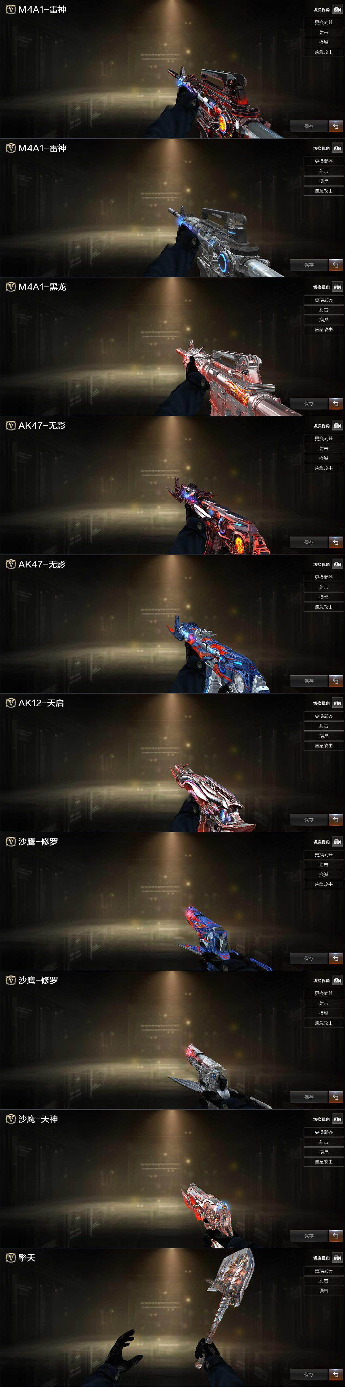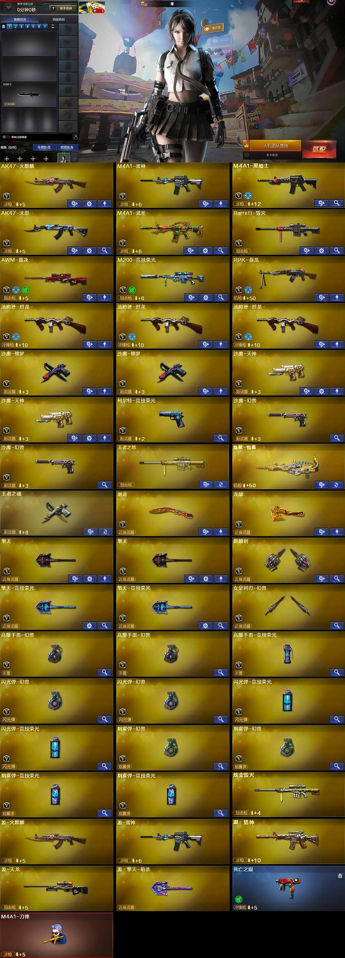 【英雄级武器】:AK47-火麒麟,M4A1-雷神,M4A1-黑骑士,AK47-无影,M4A1-武圣,Barrett-毁灭,AWM-裁决,M200-竞技荣光,RPK-盘龙,汤姆逊-烈龙*3,沙鹰-修罗*2,沙鹰-天神*2,柯尔特-竞技荣光,沙鹰-幻兽*2,屠龙,龙啸,擎天*2,麒麟刺,擎天-竞技荣光*2,女皇利刃-幻兽,高爆手雷-幻兽*2,高爆手雷-竞技荣光,闪光弹-幻兽*2,闪光弹-竞技荣光*2,烟雾弹-幻兽*2,烟雾弹-竞技荣光*2