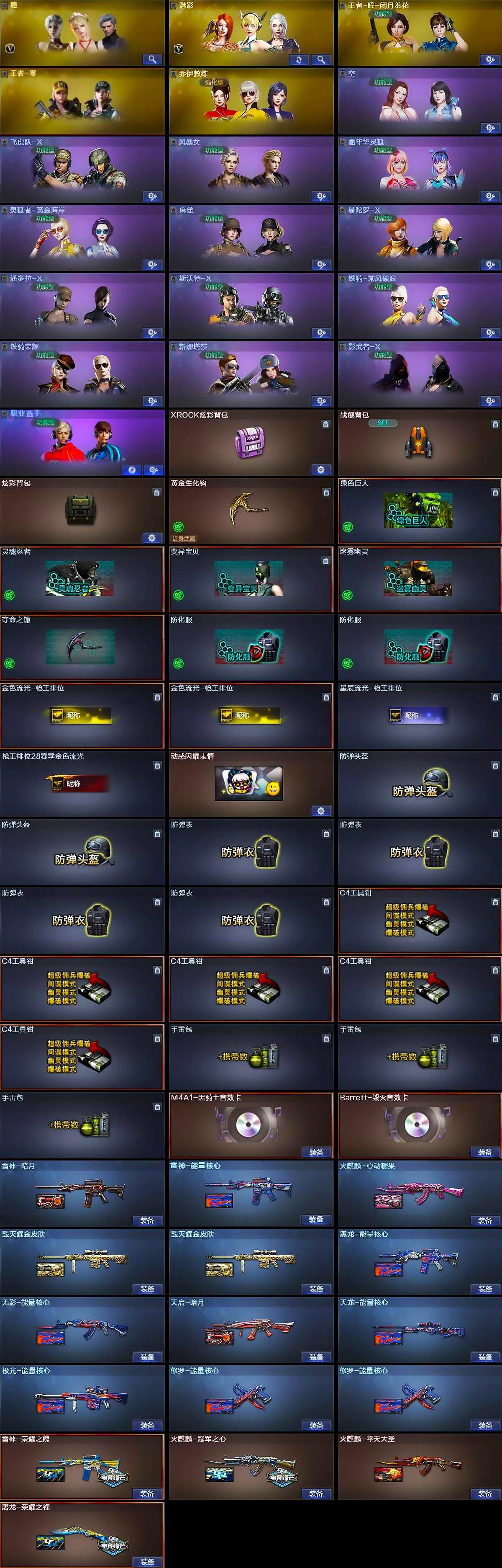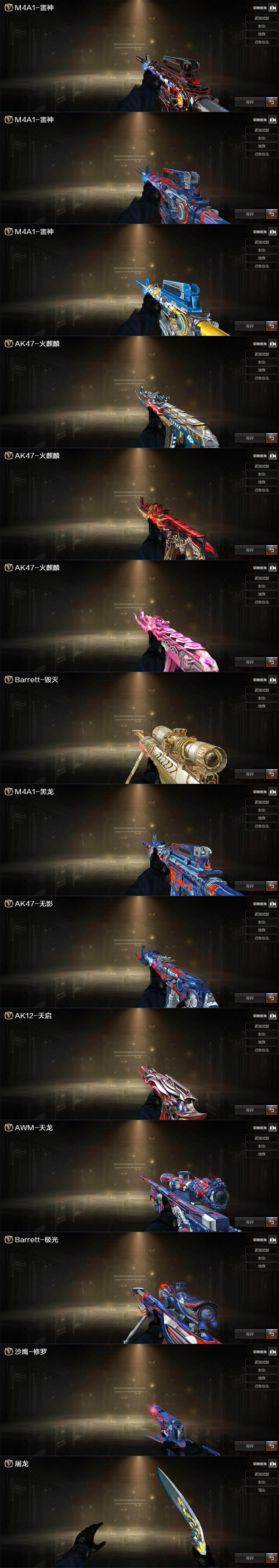 【英雄级武器】:M4A1-千变,AK47-火麒麟*5,AK47-麒麟,M4A1-黑龙,M4A1-雷神*2,M4A1-黑骑士*3,AK47-无影*2,AK47-黑武士,AK12-天启,M4A1-武圣,AK47-机械迷城*2,AK47-黑鲨,HK417-朱雀,无影-神兵利器,黑武士-锦绣游龙,M4A1-玫瑰精灵,QBZ03-金色蔷薇,M4A1-猎神,烈火-动感闪耀,王者之武-觉醒版,王者之魄-觉醒版,王者之幻-觉醒版,AK-47-猩红传说,AWM-天龙*6,Barrett-毁灭*4,Barrett-极光,AWM-裁决,M200-幻神,Barrett-金色蔷薇,RPK-盘龙,汤姆逊-烈龙*5,AA-12-雷霆,沙鹰-修罗*10,沙鹰-天神*3,Glock18-武圣,天神-动感闪耀,屠龙*3,龙啸,擎天*2,麒麟刺*2,屠龙-动感闪耀,高爆手雷-雷霆,手雷-动感闪耀,高爆手雷-云龙,闪光弹-雷霆,闪光弹-云龙,烟雾弹-雷霆,烟雾弹-云龙*2