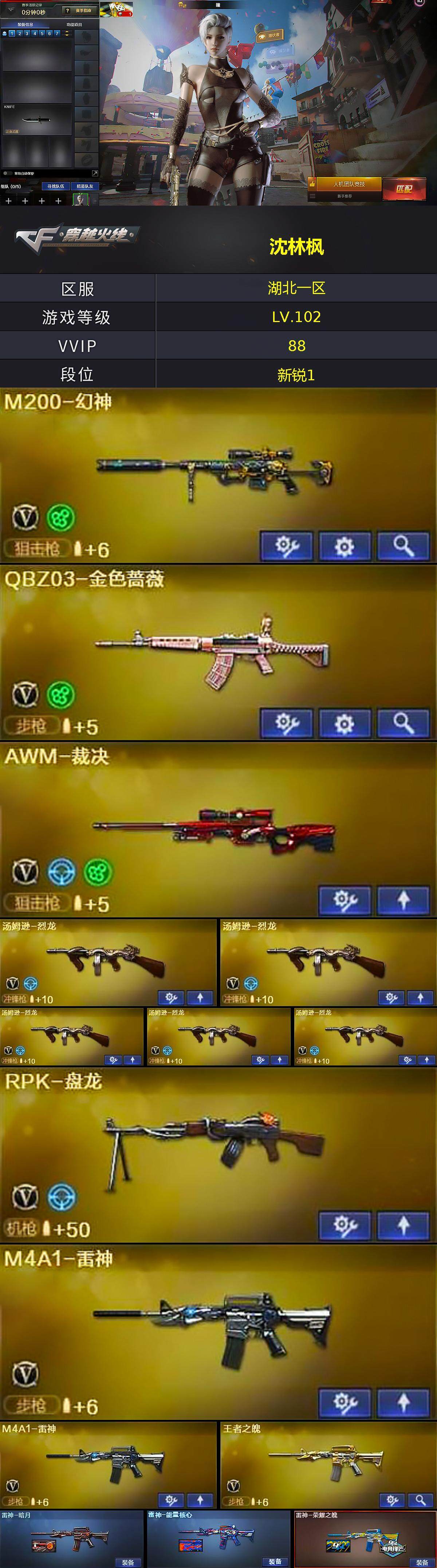 【热门武器】:QBZ03-金色蔷薇,HK417-朱雀,M200-幻神,死亡之眼,炼狱-迷你小钢,M4A1-黑骑士*3,汤姆逊-烈龙*5,RPK-盘龙,沙鹰-修罗*10