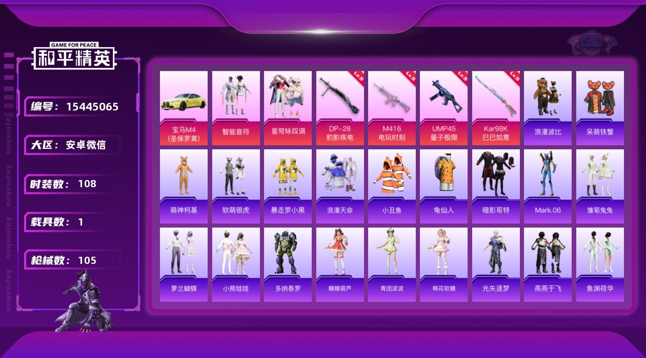 - [13246863]素材身法号 安卓 手Q-10粉装-7特效枪-7载具-4粉色飞行器-8.8w热力值-7王牌印记-162套装-265枪皮【热门品类】:套装-深海小丑鱼,套装-小丑鱼,角色-军刀雅典娜,套装-胖达圆圆,套装-龟仙人,套装-潮萌小黄鸭,套装-粉红小猪【粉色载具】:兰博基尼Aventador SVJ(翡翠绿),路特斯ELETRE(花绽灰),玛莎拉蒂Quattroporte(夜幕蓝),合金龙骨(绿),俏皮小熊猫,布尔玛摩托车,僚机-萌兔起飞【粉色套装】:粉装-宝贝奶油派,粉装-草莓生巧,角色-洛天依,粉装-花影阑珊,粉装-蓝莓炮弹,粉装-精灵娃娃,粉装-酣梦娃娃,粉装-第五大道,粉装-雪月幻音,角色-羊梦糖心【粉色枪皮等级】:AKM-梦之光华(五级),SCAR-L-纯梦嫁纱(四级),M416-五爪金龙(七级),M416-电玩时刻(五级),GROZA-香水柠檬(七级),Kar98K-未来歌姬(三级),DP-28-豹影疾电(二级)【粉色飞行器】:心之恋语飞行翼,齐天大圣飞行器,绯果甜心飞行器,时光之吻飞行器