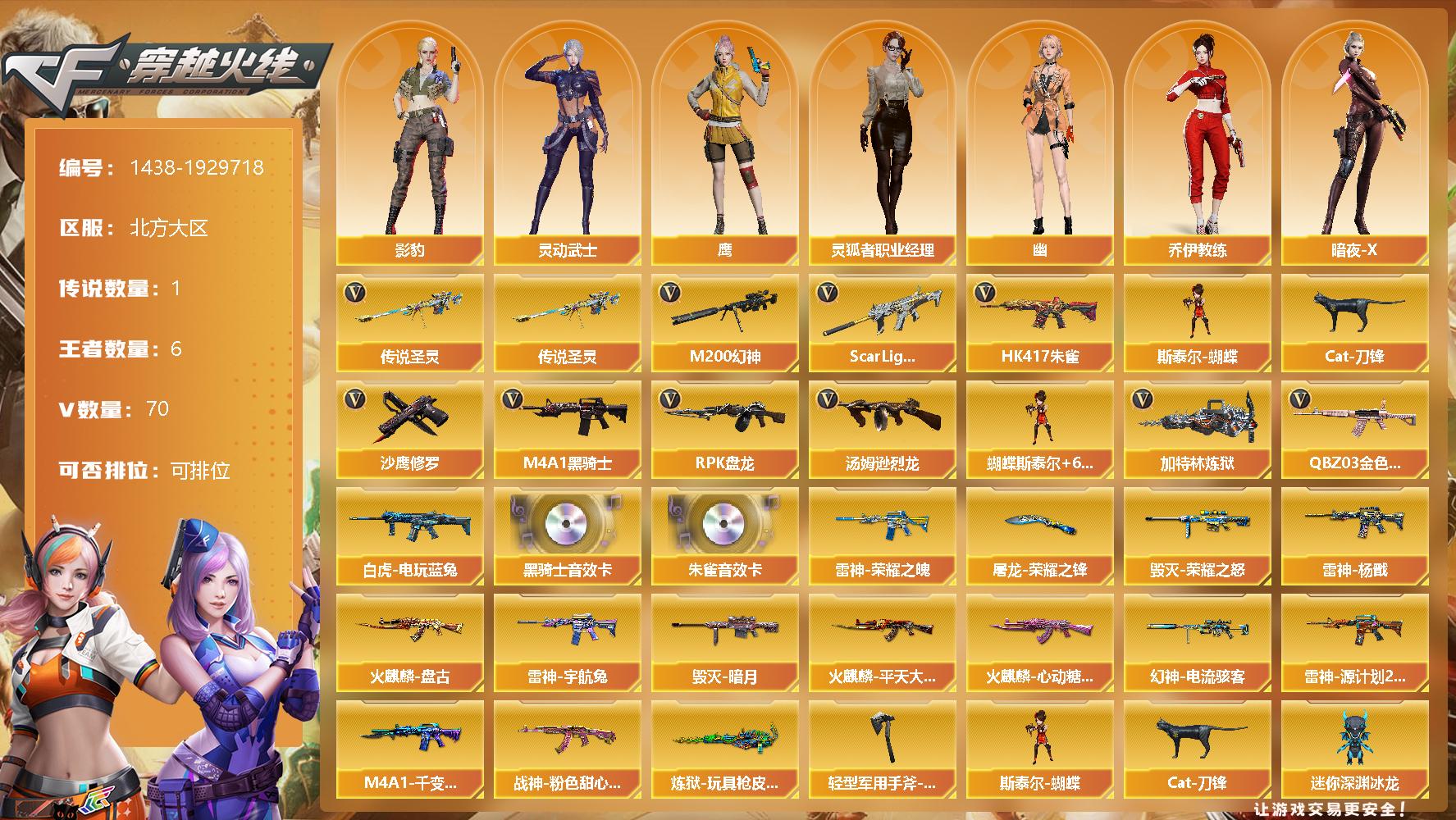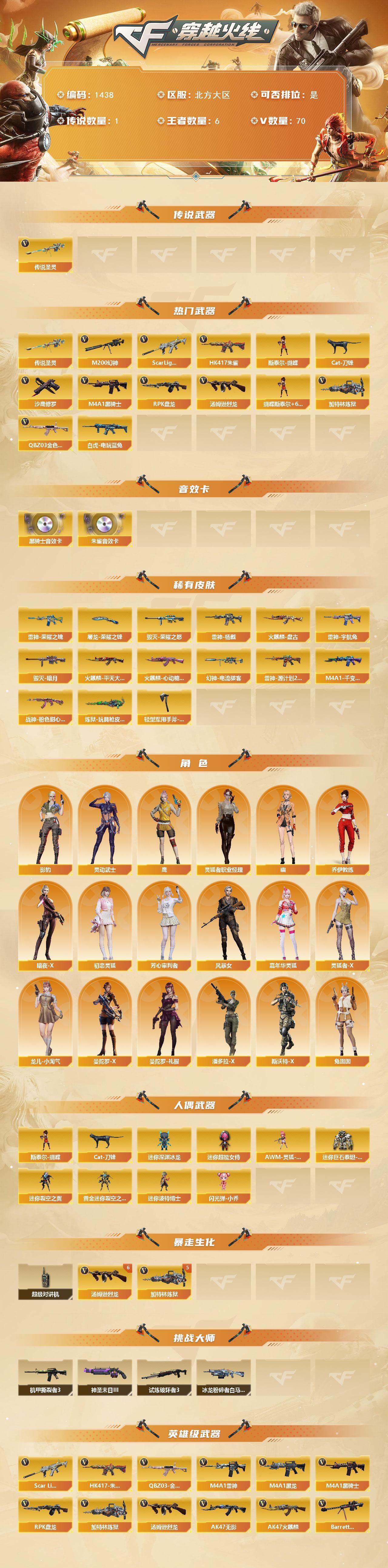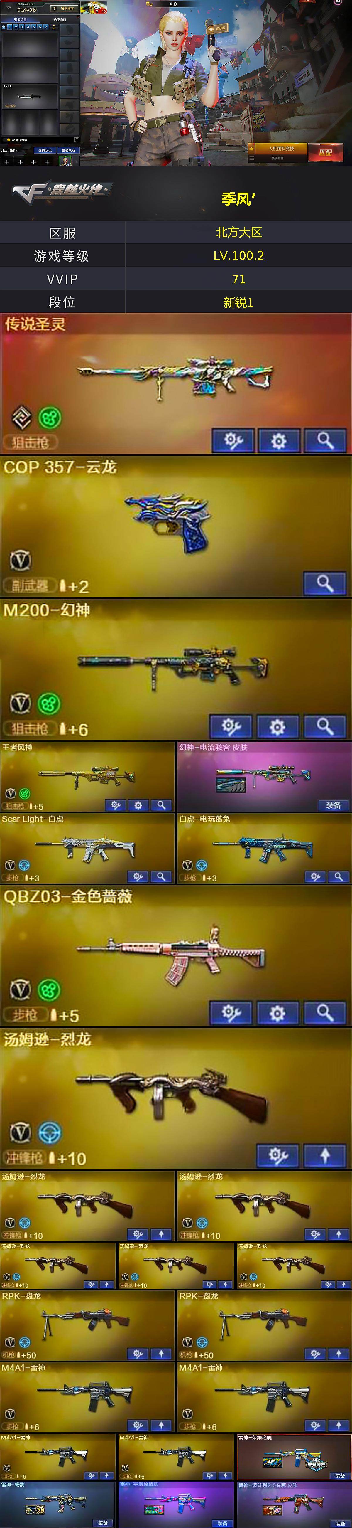 [15445155]北方大区-70V-6王者-0炫金 【传说武器】:传说圣灵 【热门武器】:传说圣灵,QBZ03-金色蔷薇,Scar Light-白虎,HK417-朱雀,M200-幻神,白虎-电玩蓝兔,Cat-刀锋,M4A1-黑骑士,汤姆逊-烈龙*6,RPK-盘龙*2,加特林-炼狱*5,斯泰尔-蝴蝶,沙鹰-修罗*3 【音效卡】:M4A1-黑骑士音效卡,HK417-朱雀音效卡 【皮肤】:幻神-电流骇客 皮肤,雷神-