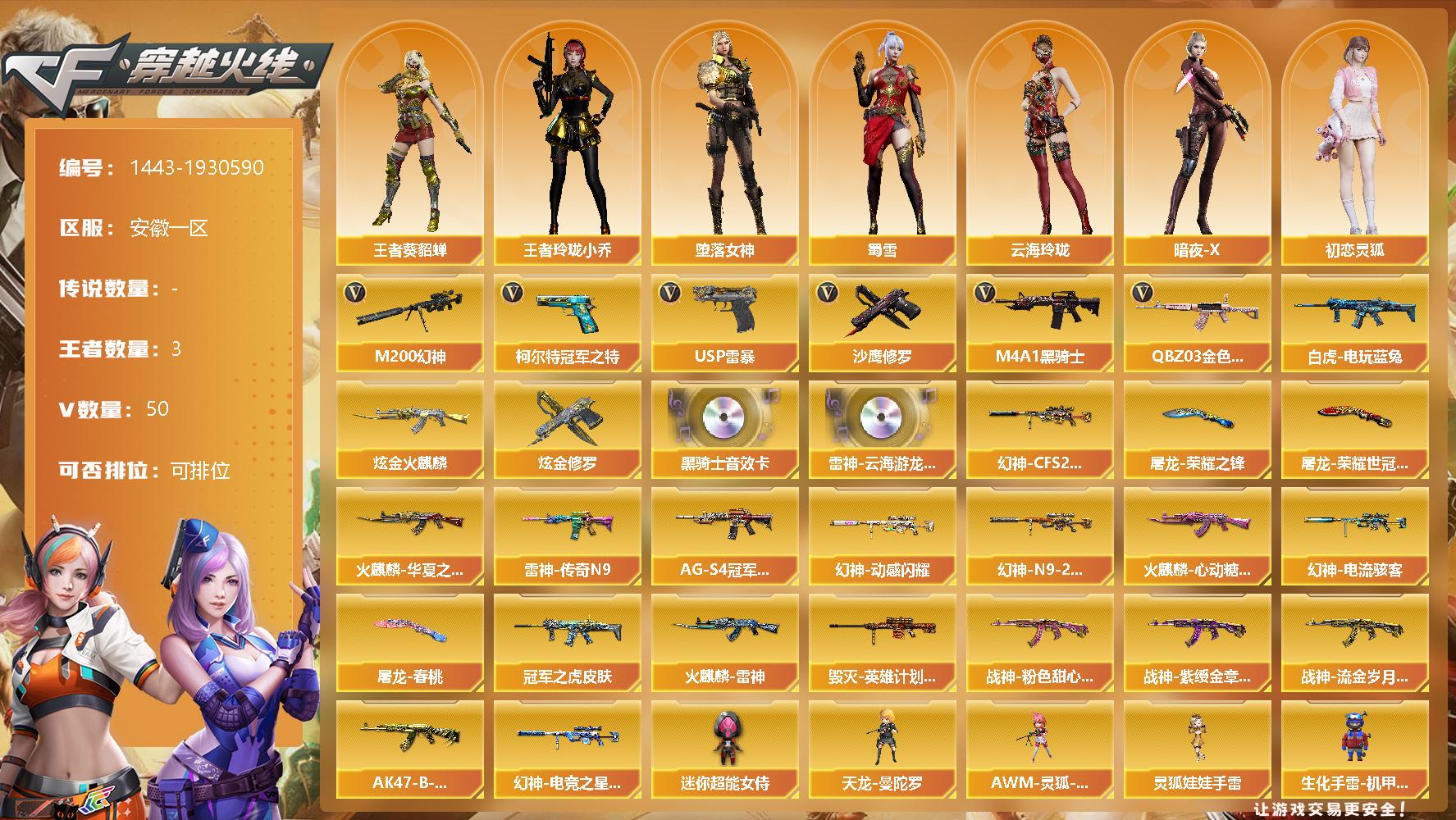[15446071]安徽一区-50V-3王者-2炫金 【热门武器】:QBZ03-金色蔷薇,M200-幻神,白虎-电玩蓝兔,柯尔特-冠军之特,M4A1-黑骑士,USP-雷暴,沙鹰-修罗 【王者炫金武器】:炫金火麒麟,炫金修罗 【音效卡】:M4A1-雷神-云海游龙音效卡,M4A1-黑骑士音效卡 【皮肤】:幻神-CFS2022,M200-幻神-N9-2022MVP,幻神-动感闪耀 皮肤,幻神-电流骇客 皮肤,幻神-电竞