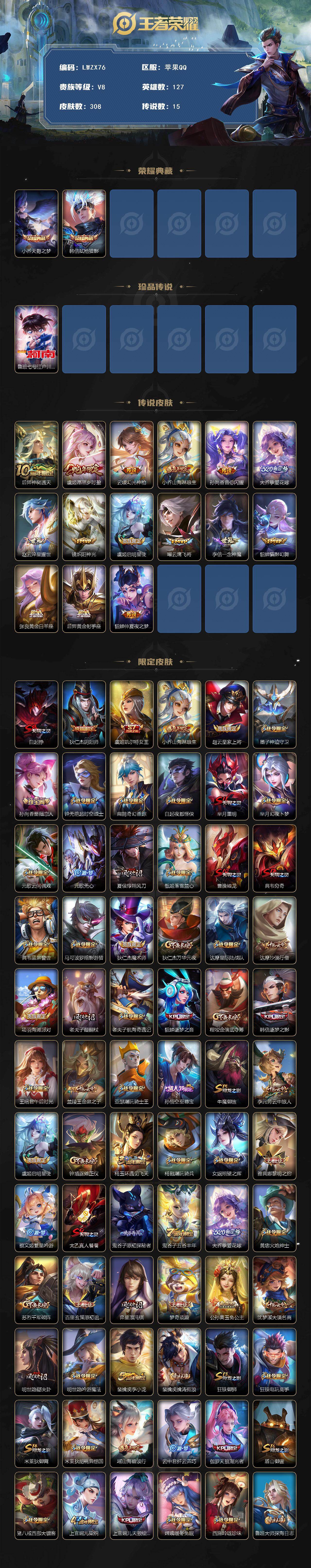 [15447441]【特价出售/店主推荐】苹果Q-V8-永恒钻石IV段位-127英雄-308皮肤-2典藏皮肤-1珍品传说-15传说-90史诗