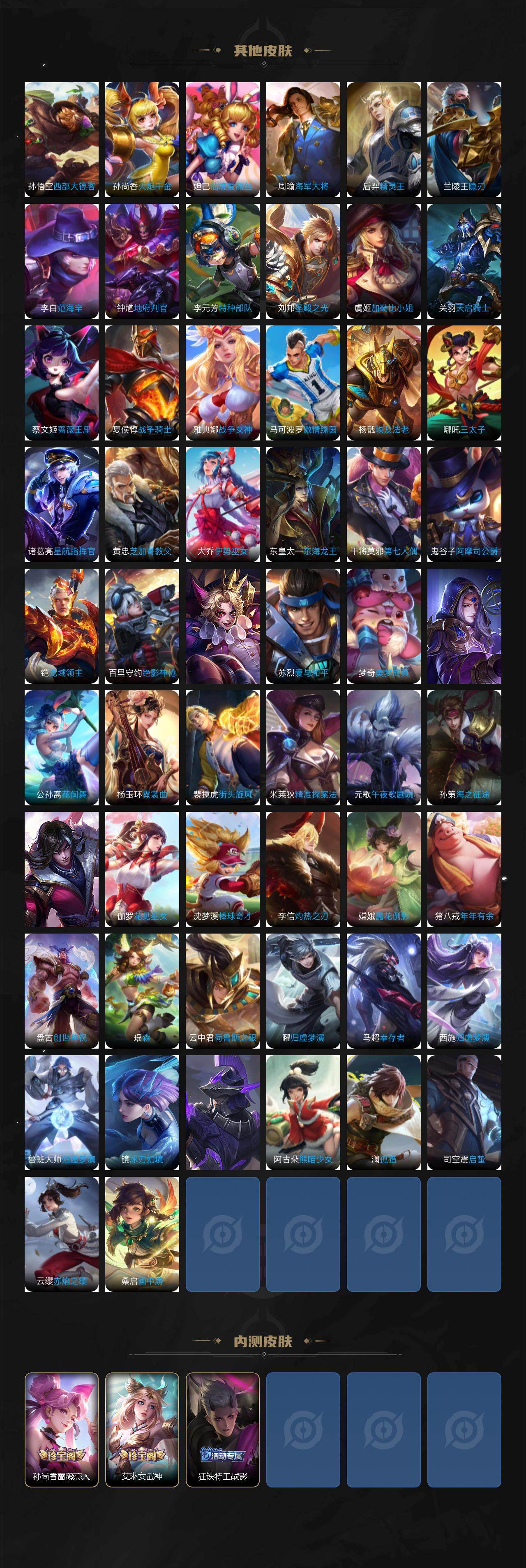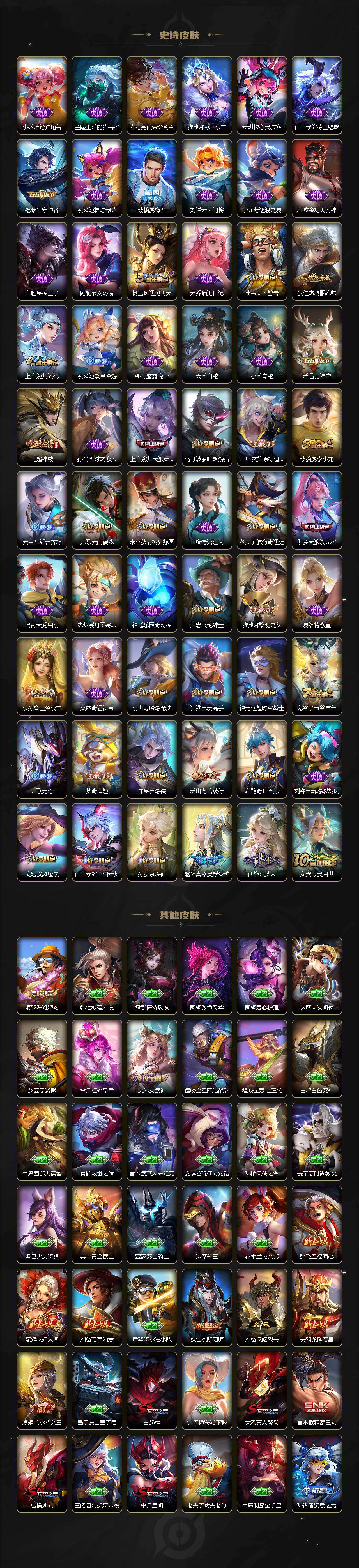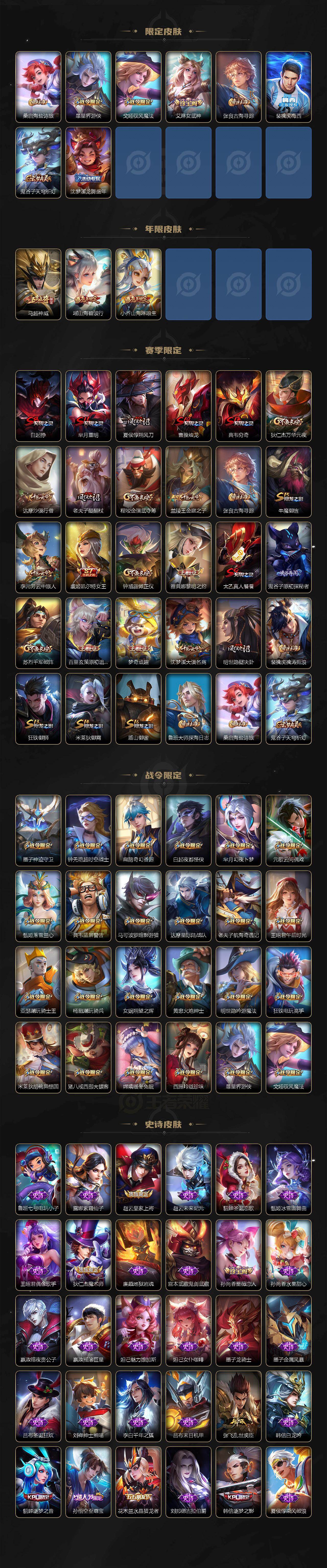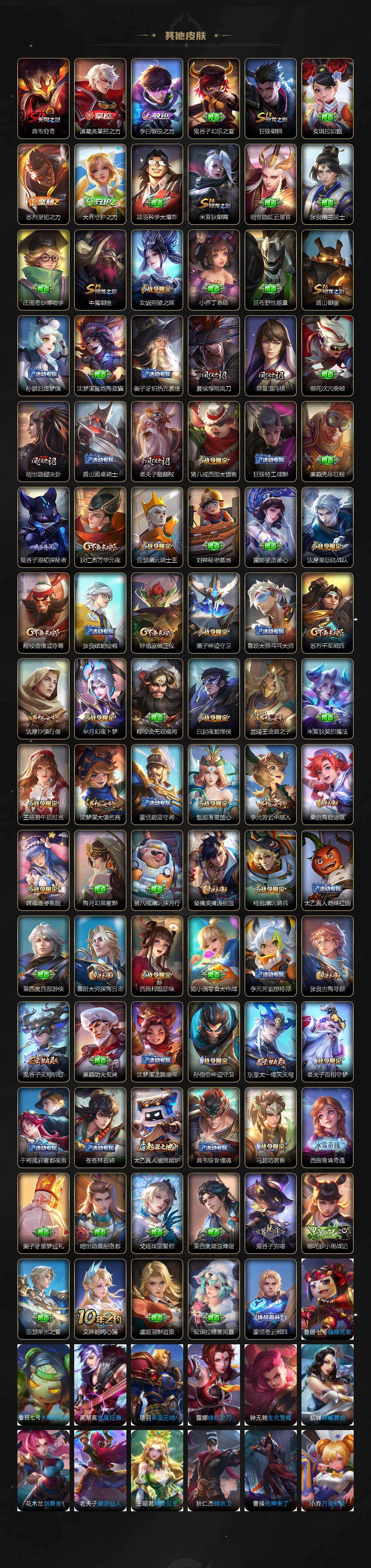 【限定皮肤】:白起狰,狄仁杰阴阳师,虞姬凯尔特女王,小乔山海琳琅生,赵云皇家上将,墨子神迹守卫,孙尚香蔷薇恋人,钟无艳超时空战士,扁鹊奇幻香踪,白起夜都怪侠,芈月重明,芈月幻夜卜梦,元歌云间偶戏,元歌无心,夏侯惇朔风刀,甄姬落雪兰心,曹操烛龙,典韦穷奇,典韦蓝屏警告,马可波罗暗影游猎,狄仁杰魔术师,狄仁杰万华元夜,达摩星际陆战队,达摩沙漠行僧,项羽海滩派对,老夫子醍醐杖,老夫子航海奇遇记,貂蝉逐梦之音,程咬金演武夺筹,韩信逐梦之影,王昭君午后时光,兰陵王金庭之子,亚瑟潮玩骑士王,孙悟空至尊宝,牛魔御旌,李元芳云中旅人,虞姬启明星使,钟馗驱傩正仪,杨玉环遇见飞天,杨戬潮玩骑兵,女娲朔望之晖,雅典娜黎明之约,蔡文姬繁星吟游,太乙真人饕餮,鬼谷子原初探秘者,鬼谷子五谷丰年,大乔挚爱花嫁,黄忠火炮绅士,苏烈千军破阵,百里玄策原初追逐者,弈星混沌棋,梦奇顽趣,公孙离玉兔公主,沈梦溪大漠名商,明世隐疑决卦,明世隐吟游魔法,裴擒虎李小龙,裴擒虎擒涛扼浪,狂铁御狮,狂铁电玩高手,米莱狄御霄,米莱狄胡桃异想国,瑶山海碧波行,云中君纤云弄巧,伽罗天狼溯光者,盾山御銮,猪八戒西部大镖客,上官婉儿梁祝,上官婉儿天狼绘梦者,嫦娥暖冬兔眠,西施玲珑珍味,鲁班大师探海日志,桑启海盐诗旅,暃星界游侠,戈娅驭风魔法,艾琳女武神,张良古海寻踪,裴擒虎梅西,鬼谷子天穹祈灯,沈梦溪龙舞盛年