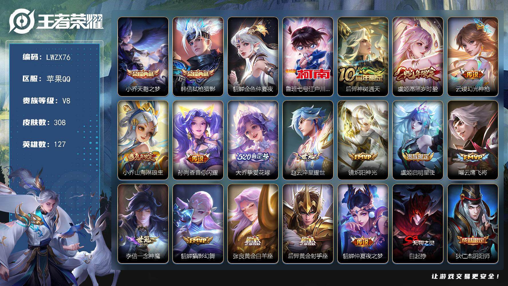 [15447441]【特价出售/店主推荐】苹果Q-V8-永恒钻石IV段位-127英雄-308皮肤-2典藏皮肤-1珍品传说-15传说-90史诗 【荣耀典藏】:小乔天鹅之梦,韩信弑枪猎影 【珍品传说】:鲁班七号江户川柯南 【传说皮肤】:后羿神树通天,虞姬愿照岁时盈,云缨幻光神枪,小乔山海琳琅生,孙尚香音你闪耀,大乔挚爱花嫁,赵云淬星耀世,镜炽阳神光,虞姬启明星使,曜云鹰飞将,李信一念神魔,貂蝉猫影幻舞,张良黄金白羊座,后羿黄金射手座,貂蝉仲夏夜之梦 【限定皮肤】:白起狰,狄仁杰阴阳师,虞姬凯尔特女王,小乔山海琳琅生,赵云皇家上将,墨子神迹守卫,孙尚香蔷薇恋人,钟无艳超时空战士,扁鹊奇幻香踪,白起夜都怪侠,芈月重明,芈月幻夜卜梦,元歌云间偶戏,元歌无心,夏侯惇朔风刀,甄姬落雪兰心,曹操烛龙,典韦穷奇,典韦蓝屏警告,马可波罗暗影游猎,狄仁杰魔术师,狄仁杰万华元夜,达摩星际陆战队,达摩沙漠行僧,项羽海滩派对,老夫子醍醐杖,老夫子航海奇遇记,貂蝉逐梦之音,程咬金演武夺筹,韩信逐梦之影,王昭君午后时光,兰陵王金庭之子,亚瑟潮玩骑士王,孙悟空至尊宝,牛魔御旌,李元芳云中旅人,虞姬启明星使,钟馗驱傩正仪,杨玉环遇见飞天,杨戬潮玩骑兵,女娲朔望之晖,雅典娜黎明之约,蔡文姬繁星吟游,太乙真人饕餮,鬼谷子原初探秘者,鬼谷子五谷丰年,大乔挚爱花嫁,黄忠火炮绅士,苏烈千军破阵,百里玄策原初追逐者,弈星混沌棋,梦奇顽趣,公孙离玉兔公主,沈梦溪大漠名商,明世隐疑决卦,明世隐吟游魔法,裴擒虎李小龙,裴擒虎擒涛扼浪,狂铁御狮,狂铁电玩高手,米莱狄御霄,米莱狄胡桃异想国,瑶山海碧波行,云中君纤云弄巧,伽罗天狼溯光者,盾山御銮,猪八戒西部大镖客,上官婉儿梁祝,上官婉儿天狼绘梦者,嫦娥暖冬兔眠,西施玲珑珍味,鲁班大师探海日志,桑启海盐诗旅,暃星界游侠,戈娅驭风魔法,艾琳女武神,张良古海寻踪,裴擒虎梅西,鬼谷子天穹祈灯,沈梦溪龙舞盛年 【年限皮肤】:马超神威,瑶山海碧波行,小乔山海琳琅生 【赛季限定】:白起狰,芈月重明,夏侯惇朔风刀,曹操烛龙,典韦穷奇,狄仁杰万华元夜,达摩沙漠行僧,老夫子醍醐杖,程咬金演武夺筹,兰陵王金庭之子,张良古海寻踪,牛魔御旌,李元芳云中旅人,虞姬凯尔特女王,钟馗驱傩正仪,雅典娜黎明之约,太乙真人饕餮,鬼谷子原初探秘者,苏烈千军破阵,百里玄策原初追逐者,弈星混沌棋,梦奇顽趣,沈梦溪大漠名商,明世隐疑决卦