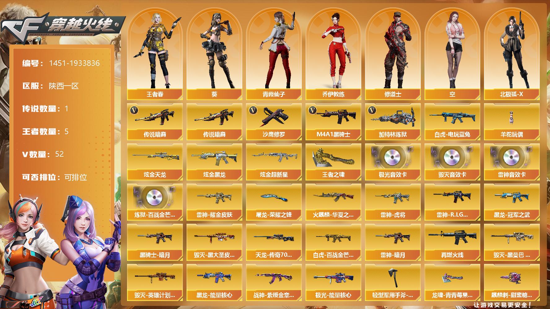 [15448393]陕西一区-52V-5王者-4炫金 【传说武器】:传说暗裔 【热门武器】:传说暗裔,白虎-电玩蓝兔,M4A1-黑骑士,加特林-炼狱*2,羊驼玩偶,沙鹰-修罗 【王者炫金武器】:王者之啸,炫金黑龙,炫金超新星,炫金天龙*2 【音效卡】:M4A1-雷神音效卡,Barrett-毁灭音效卡,Barrett-极光音效卡*2,炼狱-百战金芒-庆典舞曲音效卡 【皮肤】:白虎-百战金芒 皮肤,裁决-胜者为王 皮
