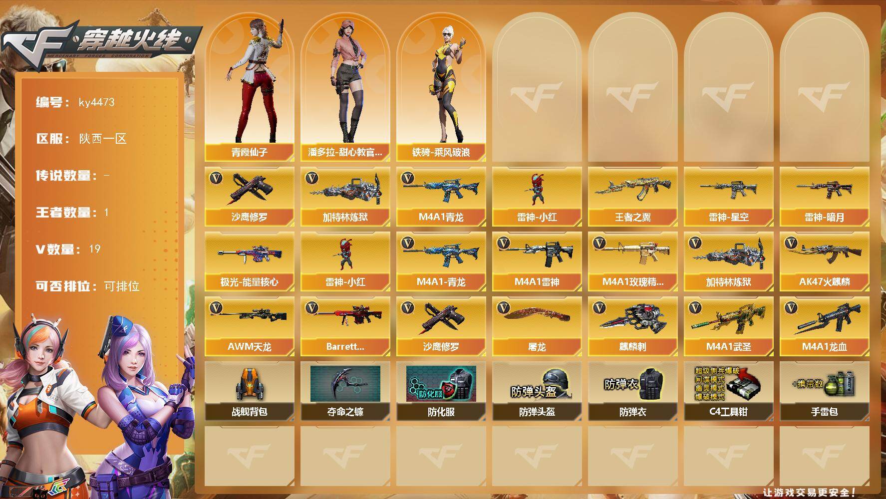 [15248424]陕西一区-19V-1王者-0炫金 【热门武器】:M4A1-青龙,加特林-炼狱,雷神-小红,沙鹰-修罗*3 【王者炫金武器】:王者之翼 【皮肤】:雷神-暗月,雷神-星空,极光-能量核心 【角色】:潘多拉-甜心教官,青霞仙子,铁骑-乘风破浪 【人偶武器】:雷神-小红 【英雄级武器】:AK47-火麒麟,M4A1-雷神,M4A1-武圣,M4A1-龙血,M4A1-青龙,M4A1-玫瑰精灵*2,AWM-天龙*2,Barrett-极光,加特林-炼狱,沙鹰-修罗*3,屠龙*2,麒麟刺 【道具】:战舰背包,夺命之镰,防化服,防弹头盔*3,防弹衣*2,C4工具钳,手雷包 【特殊枪械】:1炼狱