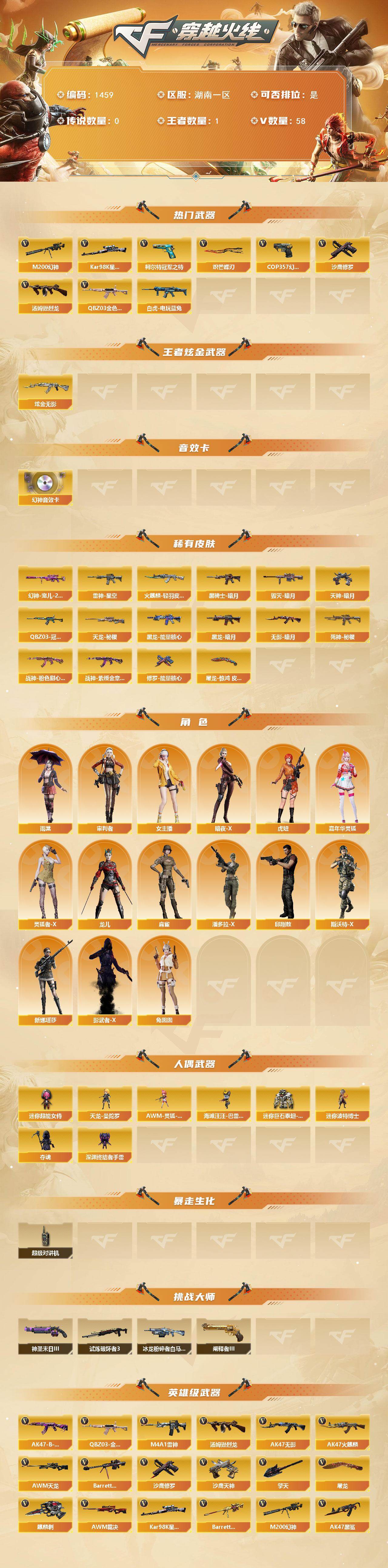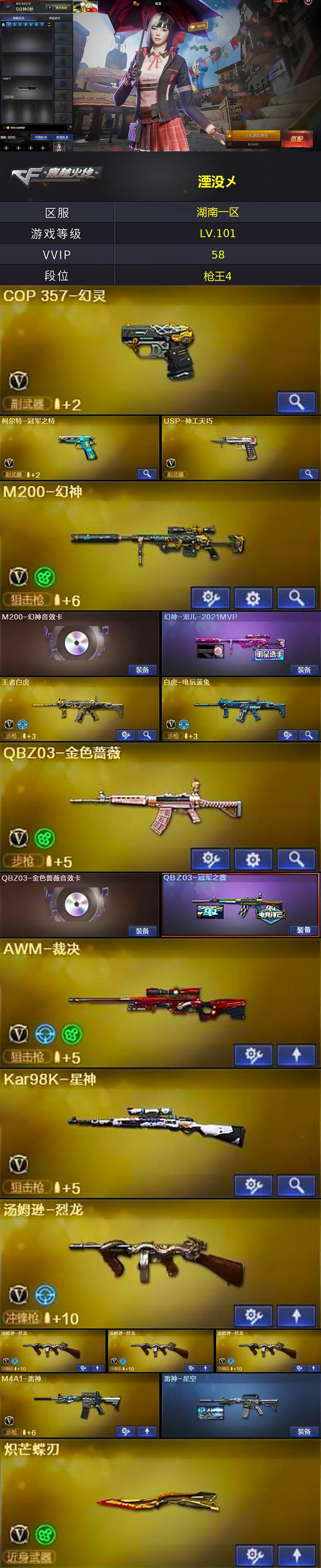 [15453004]湖南一区-58V-1王者-1炫金 【热门武器】:QBZ03-金色蔷薇,M200-幻神,白虎-电玩蓝兔,柯尔特-冠军之特,Kar98K-星神,汤姆逊-烈龙*4,COP 357-幻灵,沙鹰-修罗*2,炽芒蝶刃 【王者炫金武器】:炫金无影 【音效卡】:M200-幻神音效卡 【皮肤】:幻神-宠儿-2021MVP,QBZ03-冠军之薇,雷神-星空,火麒麟-轻羽皮肤,毁灭-暗月,黑龙-能量核心,黑龙-暗月