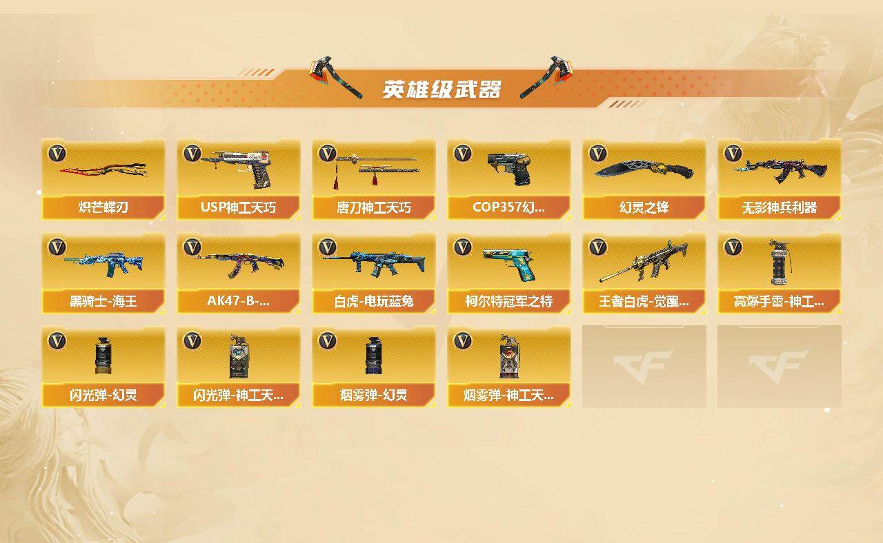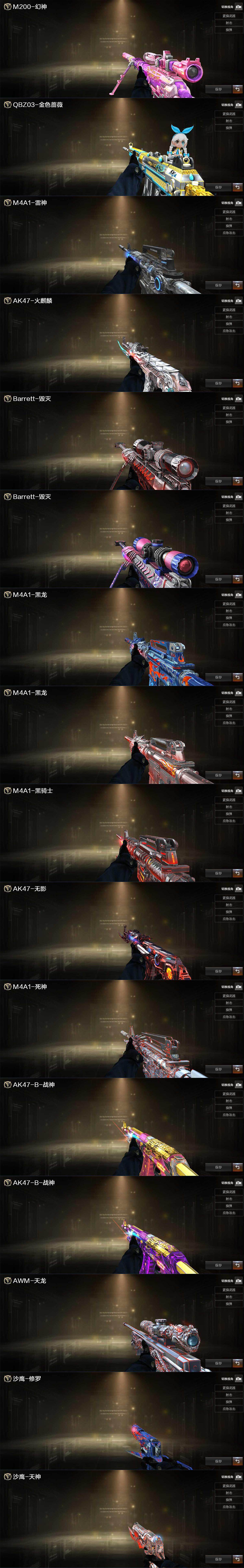 【热门武器】:QBZ03-金色蔷薇,M200-幻神,白虎-电玩蓝兔,柯尔特-冠军之特,Kar98K-星神,汤姆逊-烈龙*4,COP 357-幻灵,沙鹰-修罗*2,炽芒蝶刃
