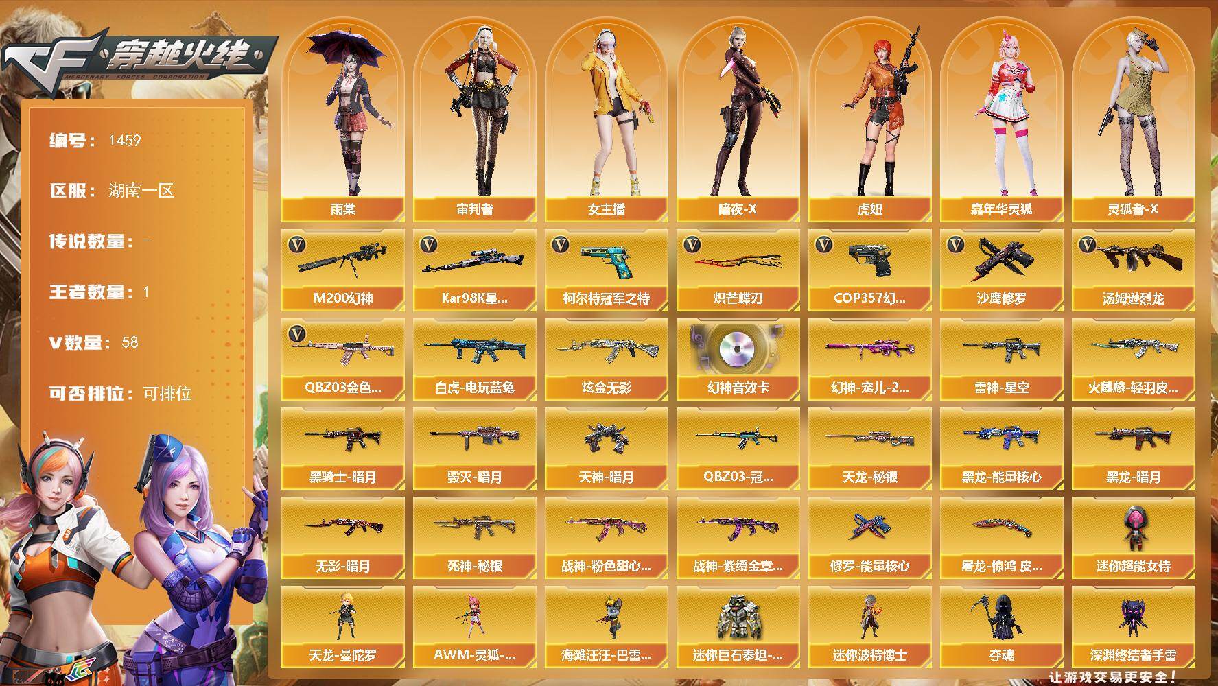 - [15635789]四川一区-55V-0王者-0炫金 【热门武器】:QBZ03-金色蔷薇,M4A1-青龙,M200-幻神,白虎-电玩蓝兔,柯尔特-冠军之特,Kar98K-星神,M4A1-黑骑士,黄金猫猫手套-白鲨 【音效卡】:Barrett-碧霄极光音效卡,白虎-盛典舞曲音效卡,炼狱-百战金芒-庆典舞曲音效卡,沙鹰-修罗-盛典舞曲音效卡,死神-雪域霜狐-怀旧音效卡,女战神梧桐语音包 【皮肤】:M200-幻神-黄忠皮肤,幻神-动感闪耀 皮肤,雷神-暗月,M4A1-战神赵云,M4A1-再燃火线,雷神-神秘按键 皮肤,火麒麟-百城,火麒麟-心动糖果,毁灭-暗月,毁灭-冠军之怒,毁灭-直播专属,毁灭-英雄计划 皮肤,战神-紫绶金章皮肤,AK47-B-常胜将军-刘备,AK47-B-常胜将军-孙权,轻型军用手斧-再燃火线 【角色】:雨棠,雪域霜狐,乔伊教练,云海玲珑,暗夜-X,初恋灵狐,芳心审判者,嘉年华灵狐,疾风,娟娟,兰-新年限定,灵狐者-X,龙儿-小淘气,麻雀,女主播,潘多拉-甜心教官,斯沃特-X,铁骑荣耀,新娜塔莎,雪莉杨-摸金校尉 【人偶武器】:AWM-灵狐-15周年嘉年华,迷你超能女侍 【挑战大师】:冰龙粉碎者-白马银枪,激光毁灭者III-白马银枪*3 【英雄级武器】:AK47-火麒麟*2,M4A1-雷神,M4A1-黑骑士,M4A1-青龙,QBZ03-天罚,无影-神兵利器,死神-雪域霜狐,QBZ03-金色蔷薇,AK-47-猩红传说,白虎-电玩蓝兔,Barrett-毁灭,M200-幻神,Kar98K-星神,炼狱-百战金芒,柯尔特-冠军之特,柯尔特-电竞装甲,柯尔特-百战金芒,天神-动感闪耀,屠龙,马来剑-夜魔,麒麟刺,屠龙-动感闪耀,麒麟刺-百战金芒,丛林匕首-玄豹,高爆手雷-夜魔*2,手雷-动感闪耀,高爆手雷-玄豹*3,闪光弹-夜魔,闪光弹-玄豹*3,烟雾弹-夜魔,烟雾弹-玄豹*3,M4A1-赤狱骑士,M4A1-苍鸣雷神,Barrett-碧霄极光 【道具】:AG战队炫彩背包,CFS限定背包,云山科技背包,亚洲杯纪念炫彩背包,炫彩背包-诺拉,百战金芒炫彩背包,超级背包,雪域霜狐炫彩背包,女皇终结者-魔龙之吻,救世主-黑桃战神,绿色巨人,灵魂忍者*3,变异宝贝,妖姬,迷雾幽灵*2,夺命之镰,防化服*3,金色流光-枪王排位*2,枪王排位28赛季金色流光,语音特效-盛典烟火,语音特效-怀旧,