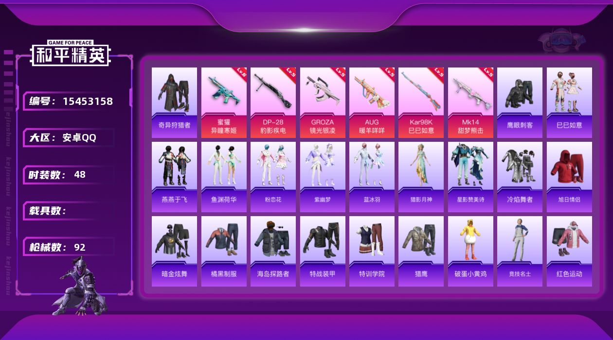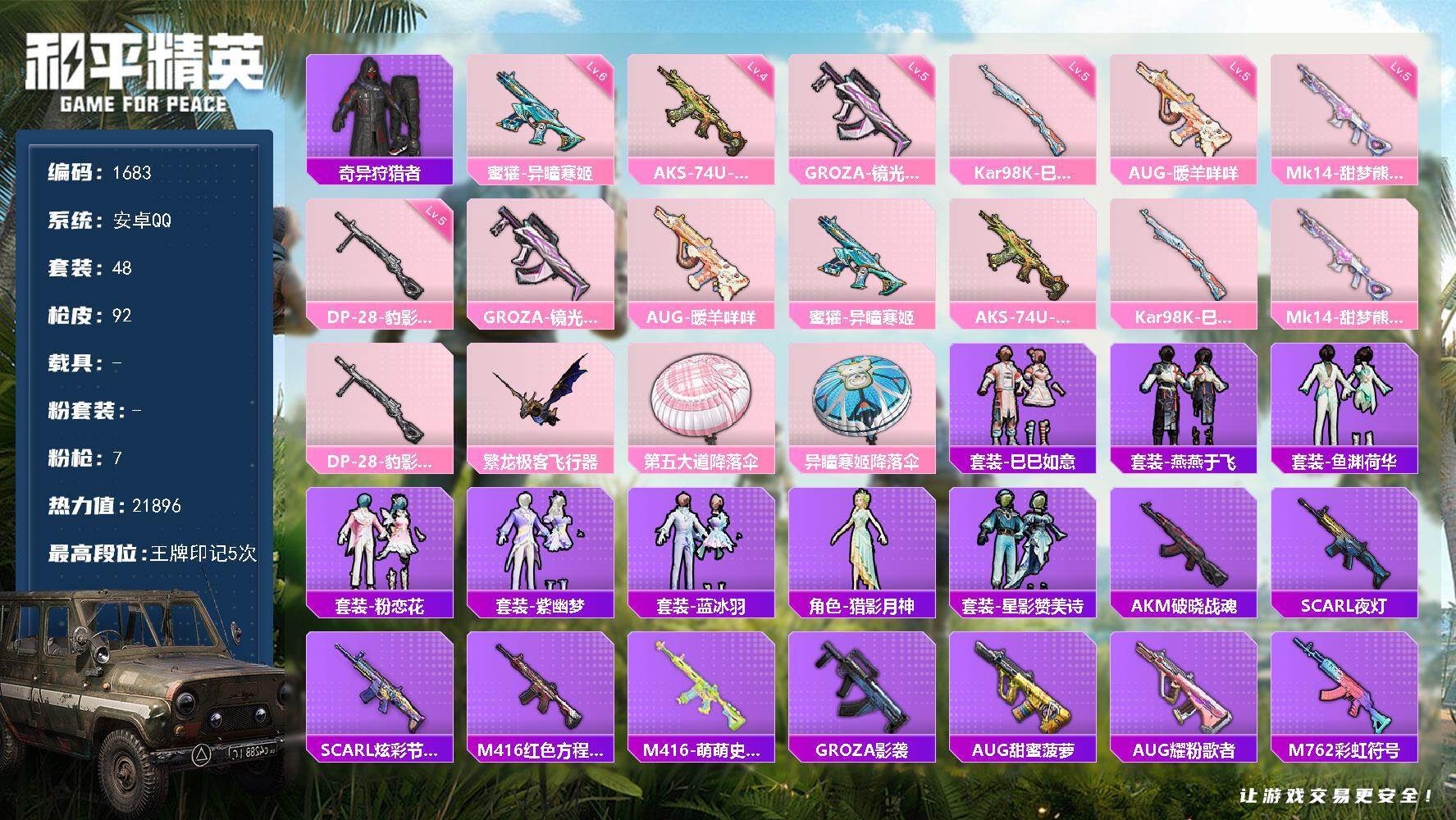 [15453158]【1683】安卓 手Q-0粉装-7特效枪-0载具-2粉色飞行器-21896热力值-5王牌印记-48套装-92枪皮