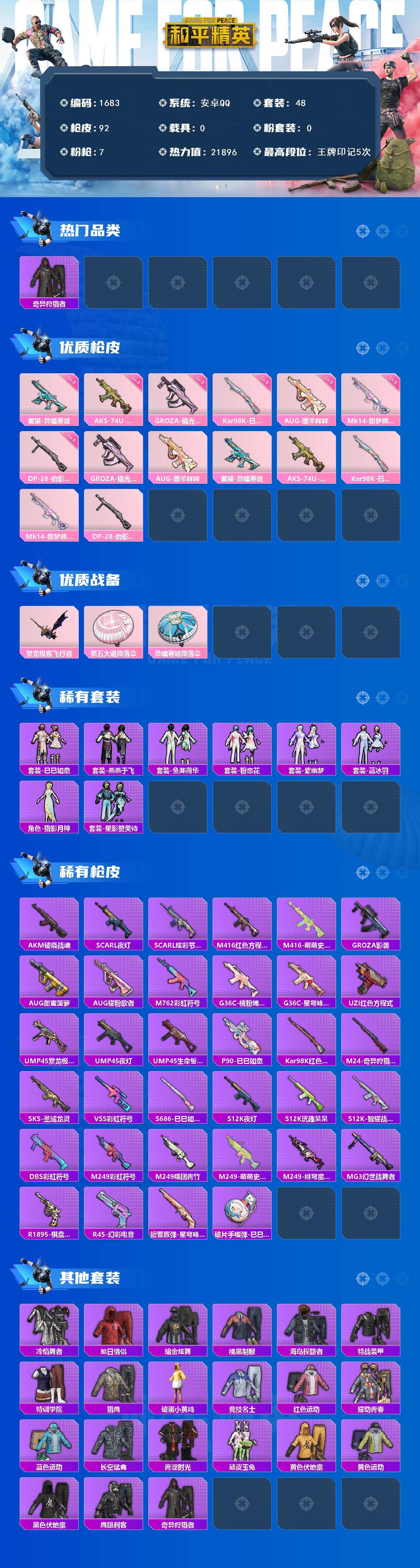 [15453158]【1683】安卓 手Q-0粉装-7特效枪-0载具-2粉色飞行器-21896热力值-5王牌印记-48套装-92枪皮 【热门品类】:套装-奇异狩猎者 【粉色枪皮等级】:GROZA-镜光银凌(五级),AUG-暖羊咩咩(五级),蜜獾-异瞳寒姬(六级),AKS-74U-森灵之息(四级),Kar98K-巳巳如意(五级),Mk14-甜梦熊击(五级),DP-28-豹影疾电(五级) 【粉色枪皮】:GROZA-镜光银凌,AUG-暖羊咩咩,蜜獾-异瞳寒姬,AKS-74U-森灵之息,Kar98K-巳巳如意,Mk14-甜梦熊击,DP-28-豹影疾电 【粉色飞行器】:繁龙极客飞行器 【粉色降落伞】:第五大道降落伞,异瞳寒姬降落伞,炫彩糖果降落伞 【稀有套装】:套装-巳巳如意,套装-雪国风尚,套装-燕燕于飞,套装-鱼渊荷华,套装-粉恋花,套装-紫幽梦,套装-蓝冰羽,角色-猎影月神,套装-星影赞美诗,套装-炫彩糖果 【稀有枪皮】:AUG-冰晶雪宝,AKM-破晓战魂,SCAR-L-夜灯,SCAR-L-炫彩节奏,M416-红色方程式,M416-萌萌史莱姆,GROZA-影袭,AUG-甜蜜菠萝,AUG-耀粉歌者,M762-彩虹符号,G36C-桃粉嫣然,G36C-星穹咏叹调,UZI-红色方程式,UMP45-繁龙极客,UMP45-夜灯,UMP45-生命誓言,P90-巳巳如意,Kar98K-红色方程式,M24-奇异狩猎者,SKS-圣域龙灵,VSS-彩虹符号,S686-巳巳如意,S12K-玩趣呆呆,S12K-夜灯,S12K-智耀战神,DBS-彩虹符号,M249-彩虹符号,M249-糯团青竹,M249-萌萌史莱姆,M249-绯穹魔姬,MG3-幻世战舞者,R1895-棋盘冕主,R45-幻彩电音,短管霰弹-星穹咏叹调,破片手榴弹-巳巳如意 【其他套装】:套装-冷焰舞者,套装-旭日情侣,套装-暗金炫舞,套装-橘黑制服,套装-海岛探路者,套装-特战装甲,套装-特训学院,套装-猎鹰,套装-破蛋小黄鸡,套装-竞技名士,套装-红色运动,套装-耀动青春,套装-蓝色运动,套装-长空猛禽,套装-青涩时光,套装-顽皮玉兔,套装-黄色伏地魔,套装-黄色运动,套装-黑色伏地魔,套装-鹰眼刺客,套装-奇异狩猎者 【稀有背包】:深海小丑鱼背包(3级),金羽特工背包(2级) 【营地ID】:973534940
