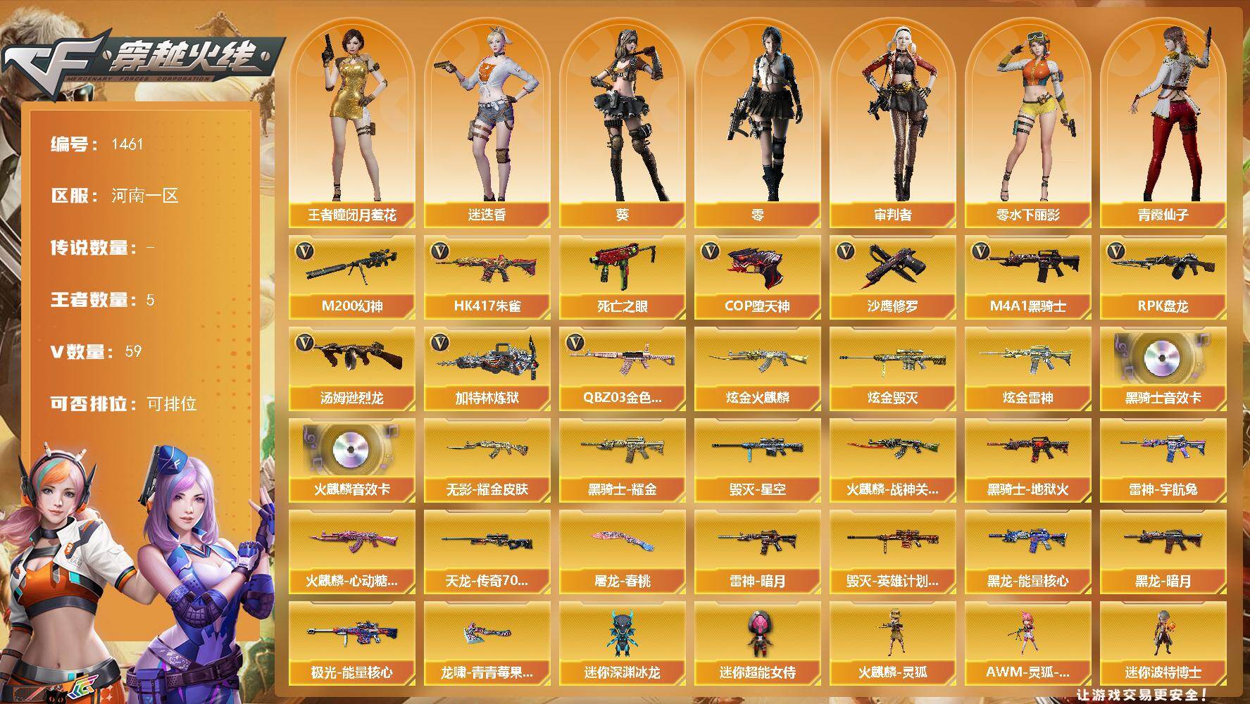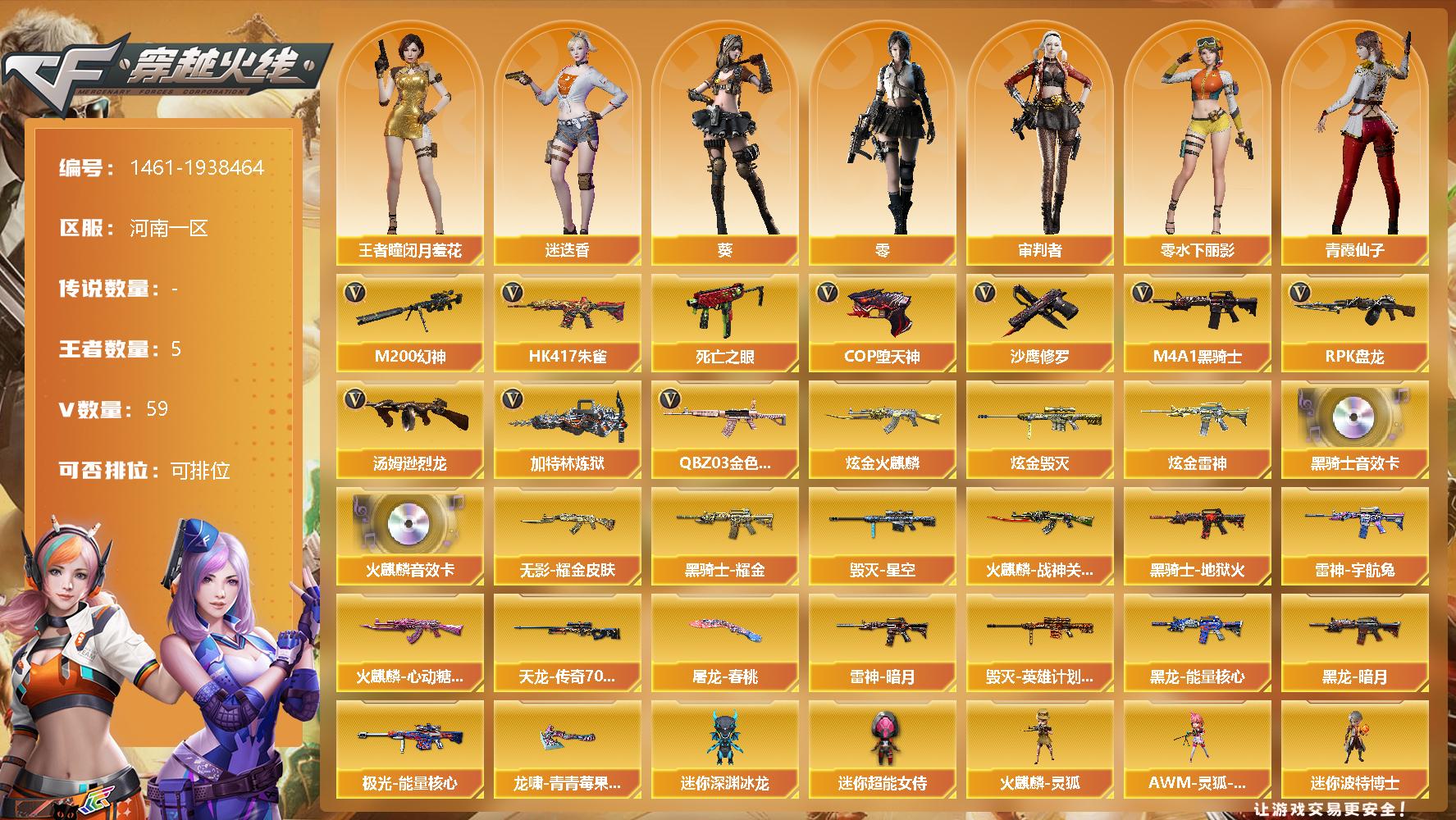 [15453172]河南一区-59V-5王者-5炫金 【热门武器】:QBZ03-金色蔷薇,HK417-朱雀,M200-幻神,死亡之眼,M4A1-黑骑士,汤姆逊-烈龙*6,RPK-盘龙*6,加特林-炼狱*2,COP-堕天神,沙鹰-修罗*3 【王者炫金武器】:炫金火麒麟,炫金雷神,炫金毁灭*3 【音效卡】:AK47-火麒麟音效卡,M4A1-黑骑士音效卡 【皮肤】:雷神-暗月,雷神-宇航兔皮肤,火麒麟-战神关羽*2,火
