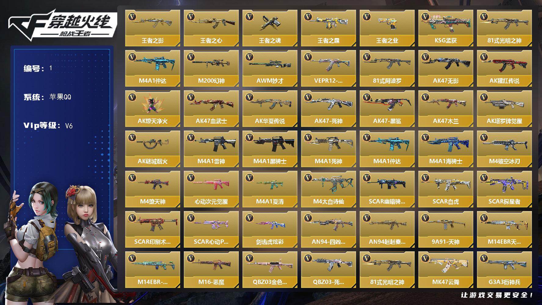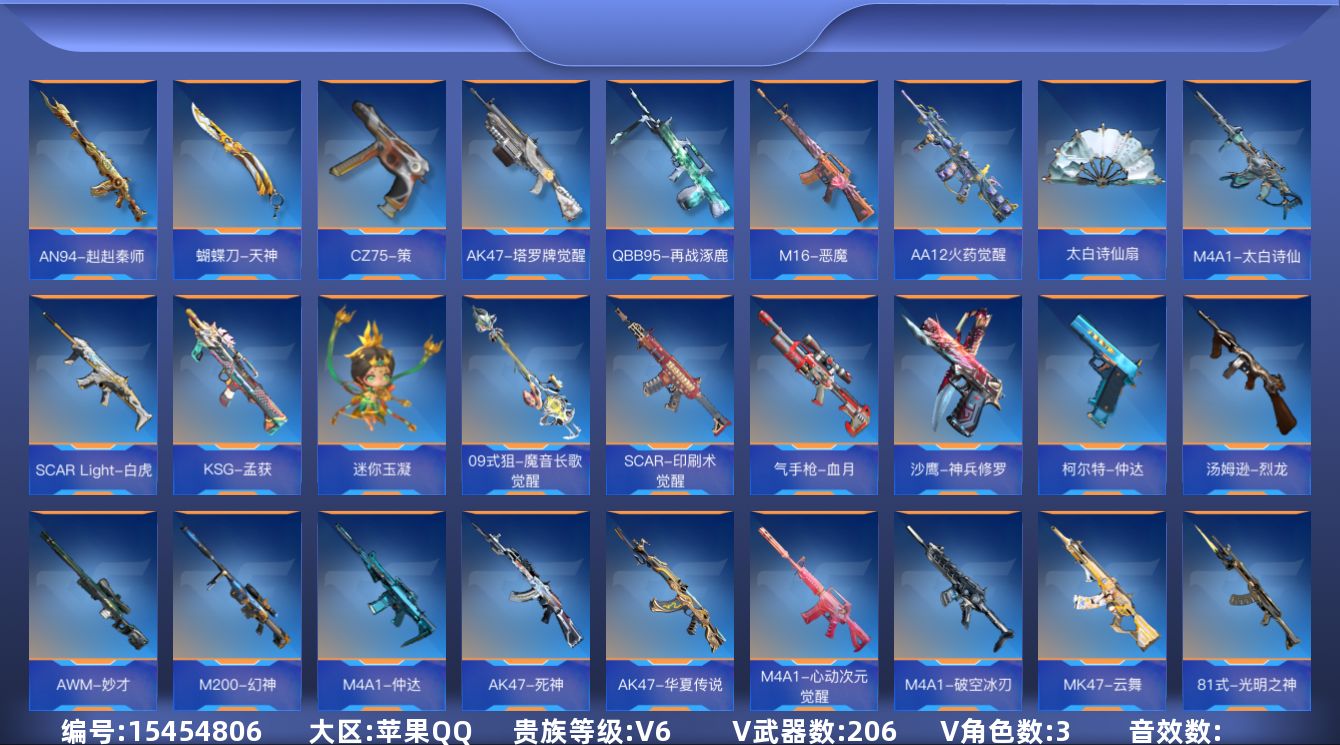 [15454806]【1】3英雄角色数-203英雄武器数 【王者系列】:王者之影,王者之心,王者之魂,王者之霆,王者之业 【热门武器】:KSG-孟获,81式-光明之神,M4A1-仲达,M200-幻神,AWM-妙才,VEPR12-宙斯,81式-阿波罗 【角色】:葵,夏日灵狐-X,零-新生 【英雄武器】:AK47-无影,AK47-猩红传说,AK47-燎天净火,AK47-血武士*2,AK47-华夏传说,AK47-死神,AK47-黑鲨,AK47-木兰,AK47-塔罗牌觉醒,AK47-谜城烟火,M4A1-雷神,M4A1-黑骑士,M4A1-死神,M4A1-仲达,M4A1-海骑士,M4A1-破空冰刃,M4A1-堕天神,M4A1-心动次元觉醒,M4A1-夏清,M4A1-太白诗仙,SCAR-幽暗骑士,SCAR Light-白虎,SCAR-探星者,SCAR-印刷术觉醒,SCAR-心动PICK*2,剑齿虎-炫彩,AN94-四凶觉醒,AN94-赳赳秦师*2,9A91-天神,M14EBR-天神,M14EBR-葫芦山庄,M16-恶魔,QBZ03-金色蔷薇*2,QBZ03-死神,81式-光明之神,MK47-云舞,G3A3-衍神兵,QBZ97-浩瀚征途,AWM-天龙*2,AWM-妙才,AWM-天使,AWM-指南针,巴雷特-毁灭*3,M200-幻神,09式狙-天神*4,09式狙-魔音长歌觉醒,98K-黑骑士,98K-星神,MR1-龙吟惊沧海,SR25-燃烧泰坦,VSK-94-金蚀,加特林-堡垒,QBB95-极光,QBB95-再战涿鹿,MK5-机械纪元,汤姆逊-烈龙*5,双持斯泰尔-天使,CZS2-善财童子,CZS2-血月,DDM4-PDW-星际宇航觉醒,VEPR12-宙斯,地狱火*2,地狱烈炎,AA12-火药觉醒,KSG-极光,KSG-孟获,KSG-钟馗觉醒,贝雷塔-力拔山河,USP-神罚,USP-机械迷城,沙鹰-修罗,沙鹰-无影,沙鹰-幻兽*2,气手枪-血月,沙鹰-神兵修罗,沙鹰-宇航兔兔,双持沙鹰-元让,蟒蛇-鼓龙,左轮-卧龙觉醒,双持GLOCK18-本初,QSZ92-华夏传说,柯尔特-仲达,柯尔特-伏刹山海觉醒,CZ75-穷奇,CZ75-策,白骨利刃,蝴蝶刀-天神,女皇利刃-铁胆虎魄*2,炽芒蝶刃,匕首-浩瀚征途,神罚战斧,手斧-机械迷城,秋逸觉醒,刑天战斧,气勇胆烈戟,屠龙*6,血月,尼泊尔-机械纪元*2,太