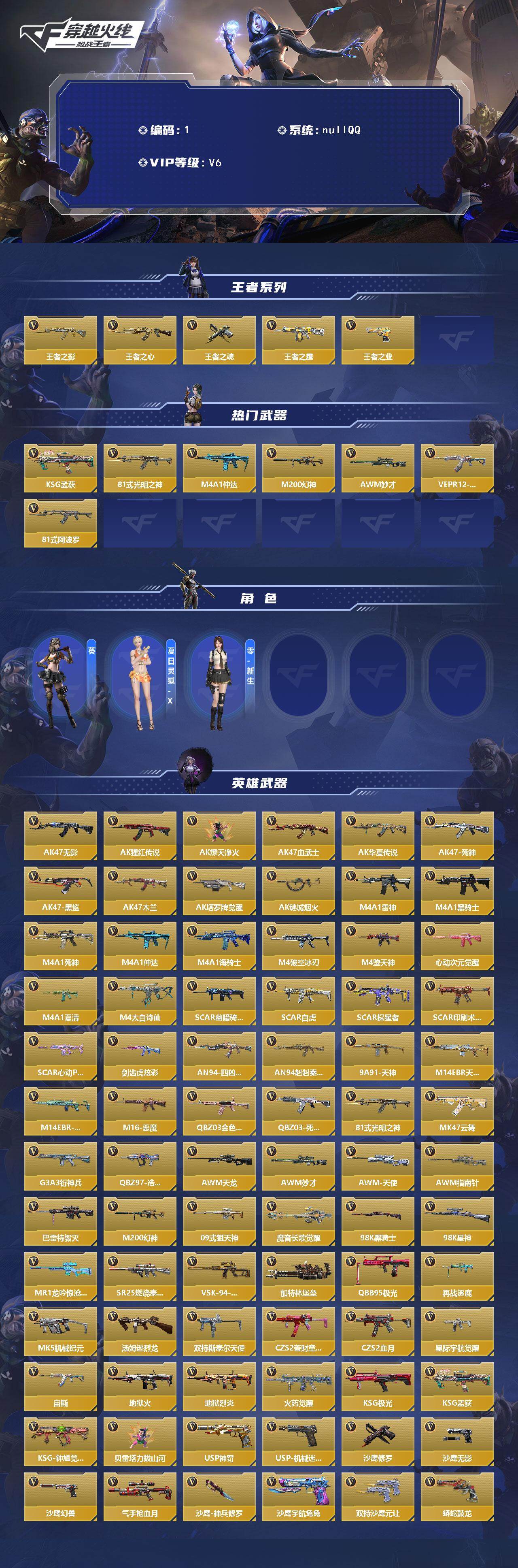 【英雄武器】:AK47-无影,AK47-猩红传说,AK47-燎天净火,AK47-血武士*2,AK47-华夏传说,AK47-死神,AK47-黑鲨,AK47-木兰,AK47-塔罗牌觉醒,AK47-谜城烟火,M4A1-雷神,M4A1-黑骑士,M4A1-死神,M4A1-仲达,M4A1-海骑士,M4A1-破空冰刃,M4A1-堕天神,M4A1-心动次元觉醒,M4A1-夏清,M4A1-太白诗仙,SCAR-幽暗骑士,SCAR Light-白虎,SCAR-探星者,SCAR-印刷术觉醒,SCAR-心动PICK*2,剑齿虎-炫彩,AN94-四凶觉醒,AN94-赳赳秦师*2,9A91-天神,M14EBR-天神,M14EBR-葫芦山庄,M16-恶魔,QBZ03-金色蔷薇*2,QBZ03-死神,81式-光明之神,MK47-云舞,G3A3-衍神兵,QBZ97-浩瀚征途,AWM-天龙*2,AWM-妙才,AWM-天使,AWM-指南针,巴雷特-毁灭*3,M200-幻神,09式狙-天神*4,09式狙-魔音长歌觉醒,98K-黑骑士,98K-星神,MR1-龙吟惊沧海,SR25-燃烧泰坦,VSK-94-金蚀,加特林-堡垒,QBB95-极光,QBB95-再战涿鹿,MK5-机械纪元,汤姆逊-烈龙*5,双持斯泰尔-天使,CZS2-善财童子,CZS2-血月,DDM4-PDW-星际宇航觉醒,VEPR12-宙斯,地狱火*2,地狱烈炎,AA12-火药觉醒,KSG-极光,KSG-孟获,KSG-钟馗觉醒,贝雷塔-力拔山河,USP-神罚,USP-机械迷城,沙鹰-修罗,沙鹰-无影,沙鹰-幻兽*2,气手枪-血月,沙鹰-神兵修罗,沙鹰-宇航兔兔,双持沙鹰-元让,蟒蛇-鼓龙,左轮-卧龙觉醒,双持GLOCK18-本初,QSZ92-华夏传说,柯尔特-仲达,柯尔特-伏刹山海觉醒,CZ75-穷奇,CZ75-策,白骨利刃,蝴蝶刀-天神,女皇利刃-铁胆虎魄*2,炽芒蝶刃,匕首-浩瀚征途,神罚战斧,手斧-机械迷城,秋逸觉醒,刑天战斧,气勇胆烈戟,屠龙*6,血月,尼泊尔-机械纪元*2,太