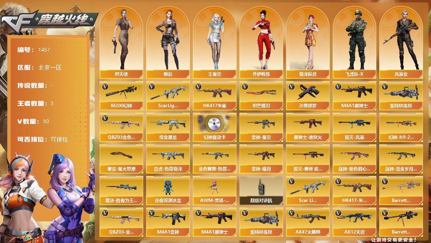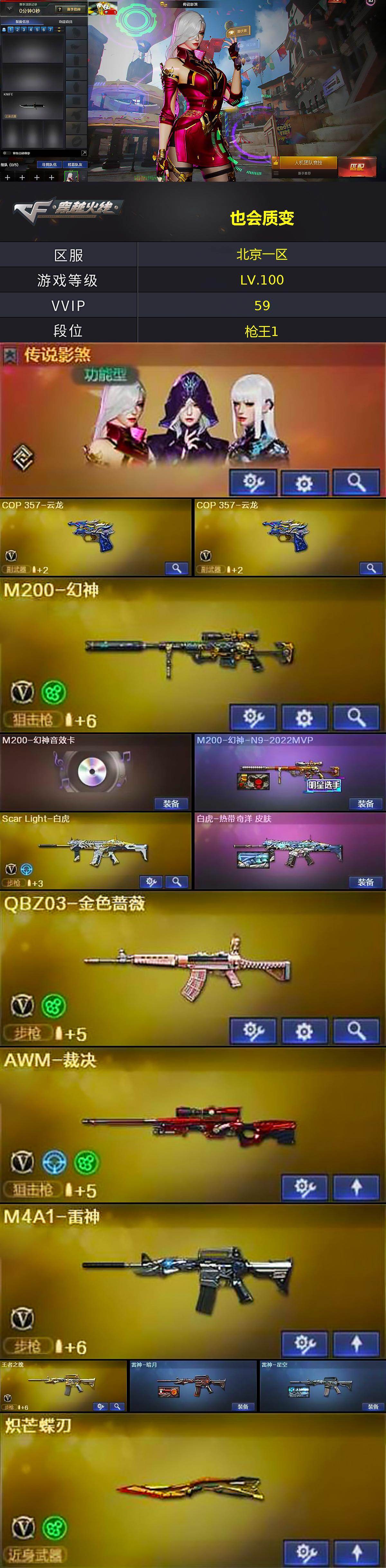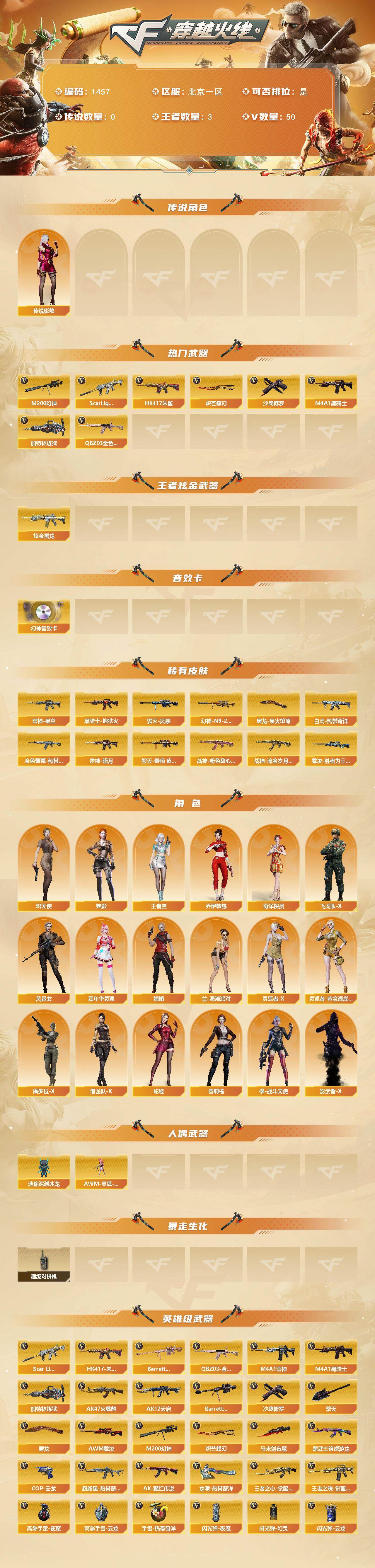 [15454902]北京一区-50V-3王者-1炫金 【传说角色】:传说影煞 【热门武器】:QBZ03-金色蔷薇,Scar Light-白虎,HK417-朱雀,M200-幻神,M4A1-黑骑士,加特林-炼狱,沙鹰-修罗*3,炽芒蝶刃 【王者炫金武器】:炫金黑龙 【音效卡】:M200-幻神音效卡 【皮肤】:M200-幻神-N9-2022MVP,白虎-热带奇洋 皮肤,金色蔷薇-热带奇洋 皮肤,裁决-胜者为王 皮肤,雷
