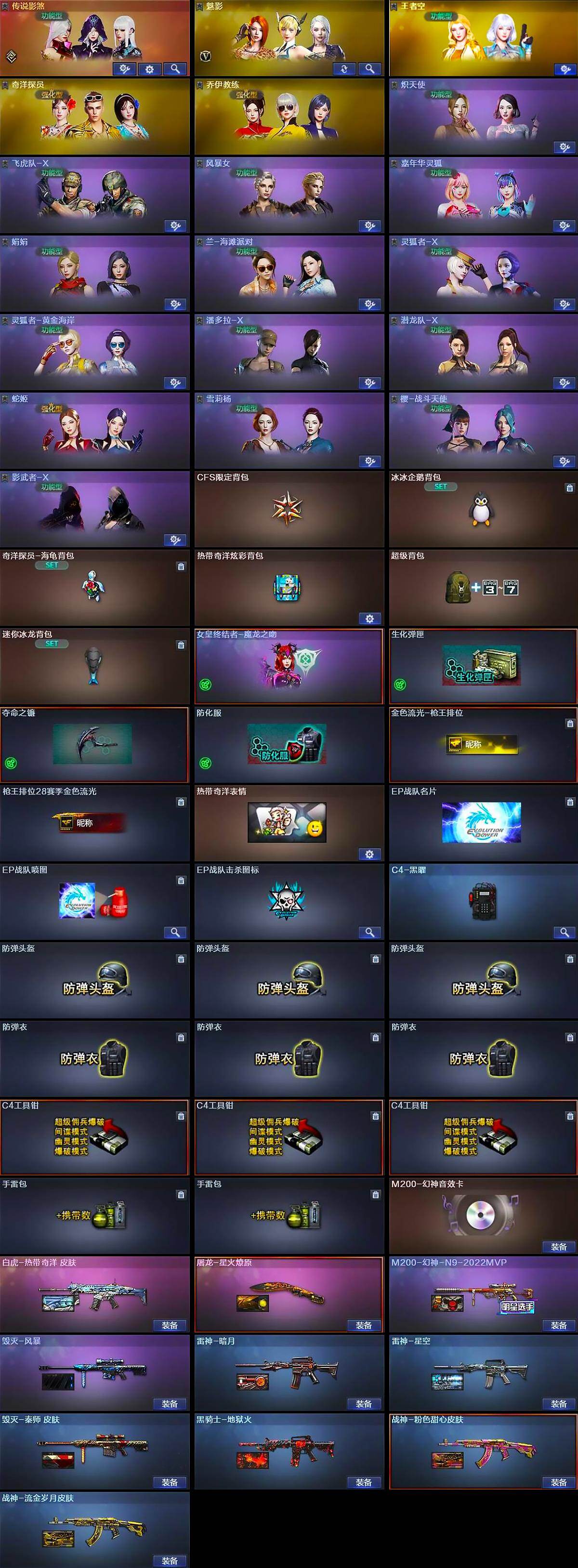 - [15385923]河北一区-28V-2王者-1炫金 【热门武器】:QBZ03-金色蔷薇,金色蔷薇-古蛇迷踪,修罗-古蛇迷踪,白虎-电玩蓝兔 【王者炫金武器】:王者森力,王者之锋,炫金黑龙 【音效卡】:AN94-超新星-热带奇洋音效卡,炼狱-百战金芒-庆典舞曲音效卡,死神-雪域霜狐-怀旧音效卡 【皮肤】:M4A1-再燃火线,雷神-神秘按键 皮肤,火麒麟-平天大圣,毁灭-百城浙江 皮肤,毁灭-虹光风暴 皮肤,战神-流金岁月皮肤,修罗耀金皮肤,轻型军用手斧-再燃火线 【角色】:战地猎狐,王者-零-国色天香,王者影豹,雪域霜狐,蛇隐宗,奇洋探员,乔伊教练,修道士,云海玲珑,暗夜-X,北极狐-X,电竞少女,飞虎队-X,风暴女,嘉年华灵狐,0号玩家,灵狐者-X,龙儿,麻雀,曼陀罗-X,潘多拉-X,潘多拉-甜心教官,蛇姬,斯沃特-X,蜀雪,铁骑荣耀,兔囡囡,新娜塔莎,雪莉杨,雪莉杨-摸金校尉,樱-战斗天使,影武者-X,游珑儿 【人偶武器】:AWM-灵狐-15周年嘉年华*4,迷你牛魔王,迷你波特博士,夺魂,生化手雷-机甲核心,迷你艾比 【暴走生化】:超级对讲机 【挑战大师】:AK47-冰龙粉碎者,激光毁灭者III,神圣爆裂者-末日III 【英雄级武器】:M4A1-千变,AK47-火麒麟*2,M4A1-雷神,无影-神兵利器,黑武士-锦绣游龙,超新星-热带奇洋,金色蔷薇-古蛇迷踪,死神-雪域霜狐,QBZ03-金色蔷薇,黑骑士-海王,白虎-电玩蓝兔,Barrett-毁灭,炼狱-百战金芒,烈龙-云海游龙,修罗-古蛇迷踪,擎天,擎天-云海游龙,龙啸-热带奇洋,麒麟刺-百战金芒,手雷-云海游龙,手雷-热带奇洋,高爆手雷-古蛇迷踪,烟雾弹-古蛇迷踪,M4A1-赤狱骑士,AWM-昌龙,Barrett-碧霄极光*2 【道具】:BS战队炫彩背包,CFS限定背包,云山科技背包,云海游龙炫彩背包,亚洲杯纪念炫彩背包,全能枪王背包,冰冰企鹅背包-猛男专用,冰冰企鹅背包,古蛇迷踪炫彩背包,奇洋探员-海龟背包,热带奇洋炫彩背包,百战金芒炫彩背包,超级背包,雪域霜狐炫彩背包,女皇终结者-魔龙之吻,救世主-黑桃战神,黄金生化钩,绿色巨人,灵魂忍者,变异宝贝,迷雾幽灵,生化弹匣,夺命之镰*2,防化服*3,金色流光-枪王排位*2,星辰流光-枪王排位,流光-鎏金之域,流光-再燃火线,枪王排位28赛季金色流光,枪王排位29赛季金色流光,语