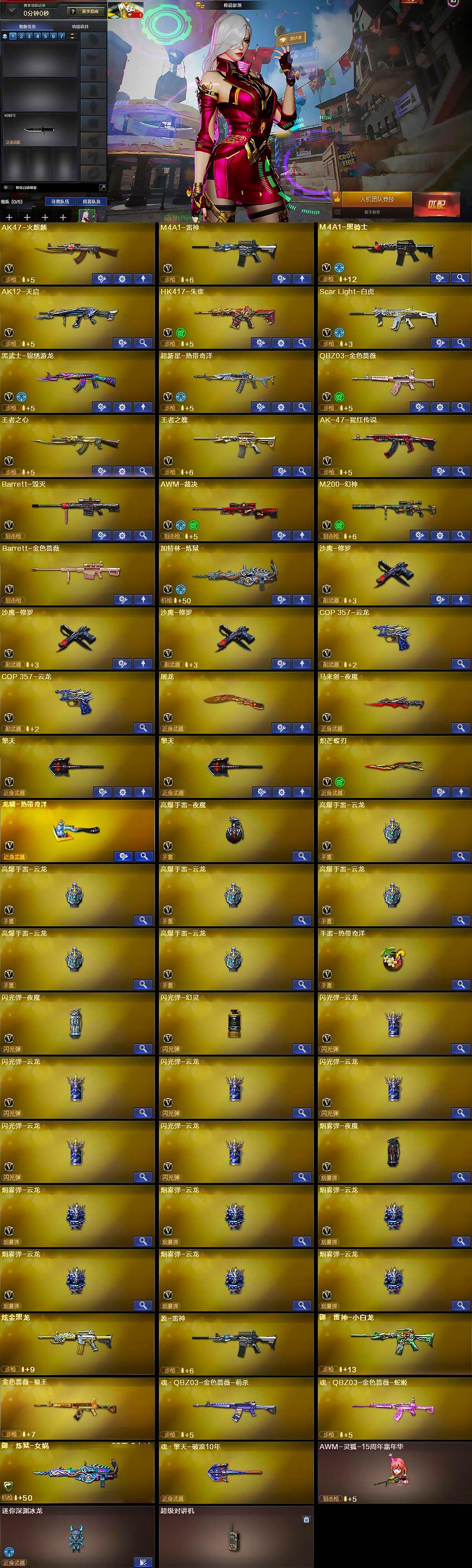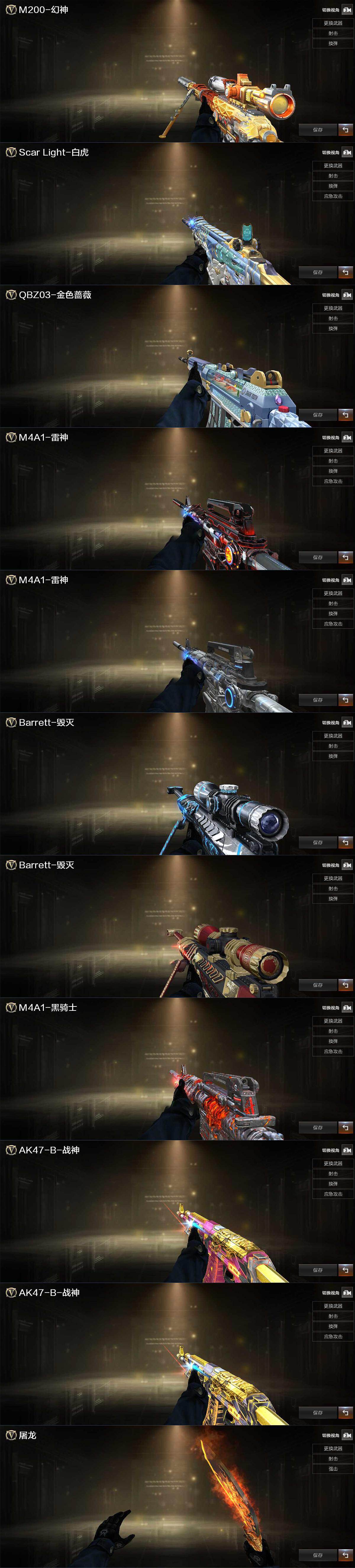 【热门武器】:QBZ03-金色蔷薇,Scar Light-白虎,HK417-朱雀,M200-幻神,M4A1-黑骑士,加特林-炼狱,沙鹰-修罗*3,炽芒蝶刃