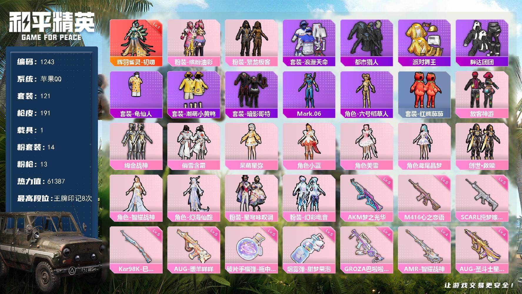 [12866802]【1243】苹果 手Q-1神装-14粉装-13特效枪-1载具-4粉色飞行器-61387热力值-8王牌印记-121套装-191枪皮