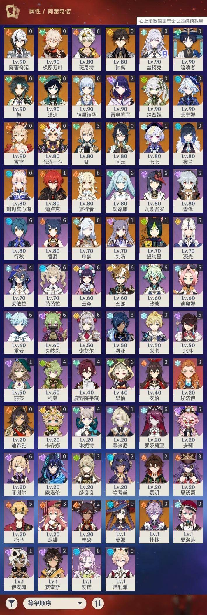 - [15563665]60级/81黄/女主/31个五星角色/26个五星武器 0命克洛琳德,0命阿蕾奇诺,0命闲云,0命娜维娅,0命芙宁娜,0命那维莱特,1命迪希雅,0命纳西妲,0命妮露,1命提纳里,3命夜兰,0命八重神子,0命优菈,2命雷电将军,0命枫原万叶,0命钟离,0命胡桃,0命甘雨,0命宵宫,0命珊瑚宫心海,0命刻晴,3命七七,满命琴,4命莫娜,1命迪卢克,0命希诺宁,0命梦见月瑞希,0命瓦雷莎,0命丝柯克,0命菈乌玛,0命杜林,精1赤月之形,精1裁断,精1碧落之珑,精1苇海信标,精1裁叶萃光,精3千夜浮梦,精1赤沙之杖,精1若水,精1不灭月华,精1薙草之稻光,精1雾切之回光,精1护摩之杖,精1四风原典,精1天空之脊,精1天空之翼,精2阿莫斯之弓,精1斫峰之刃,精1天空之卷,精1风鹰剑,精1狼的末路,精1冲浪时光,精1黑蚀