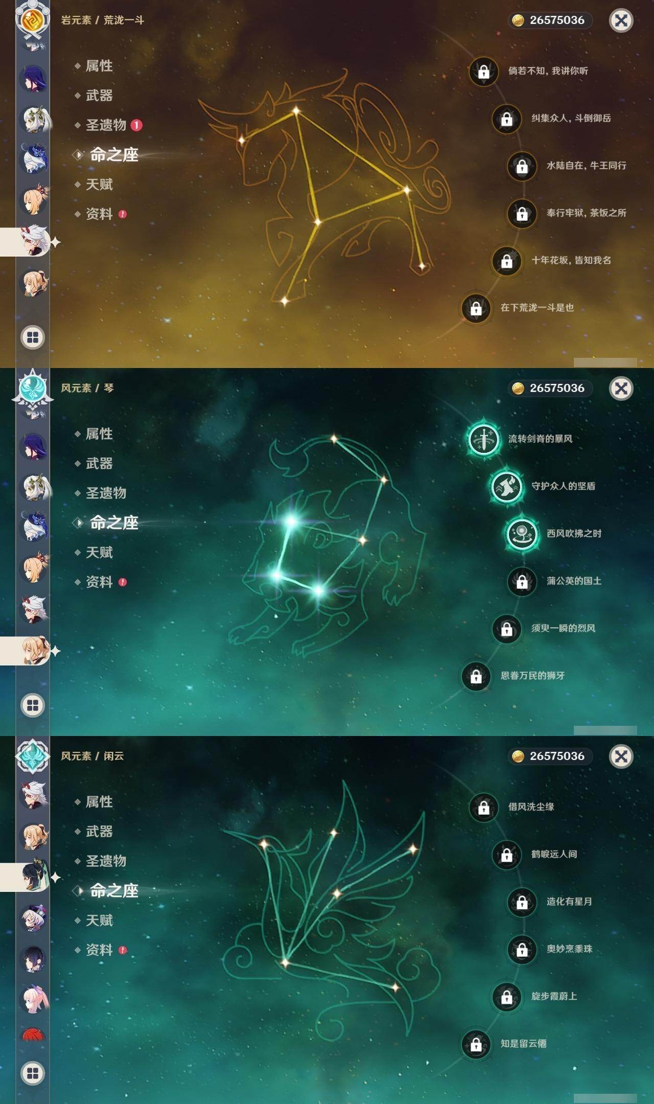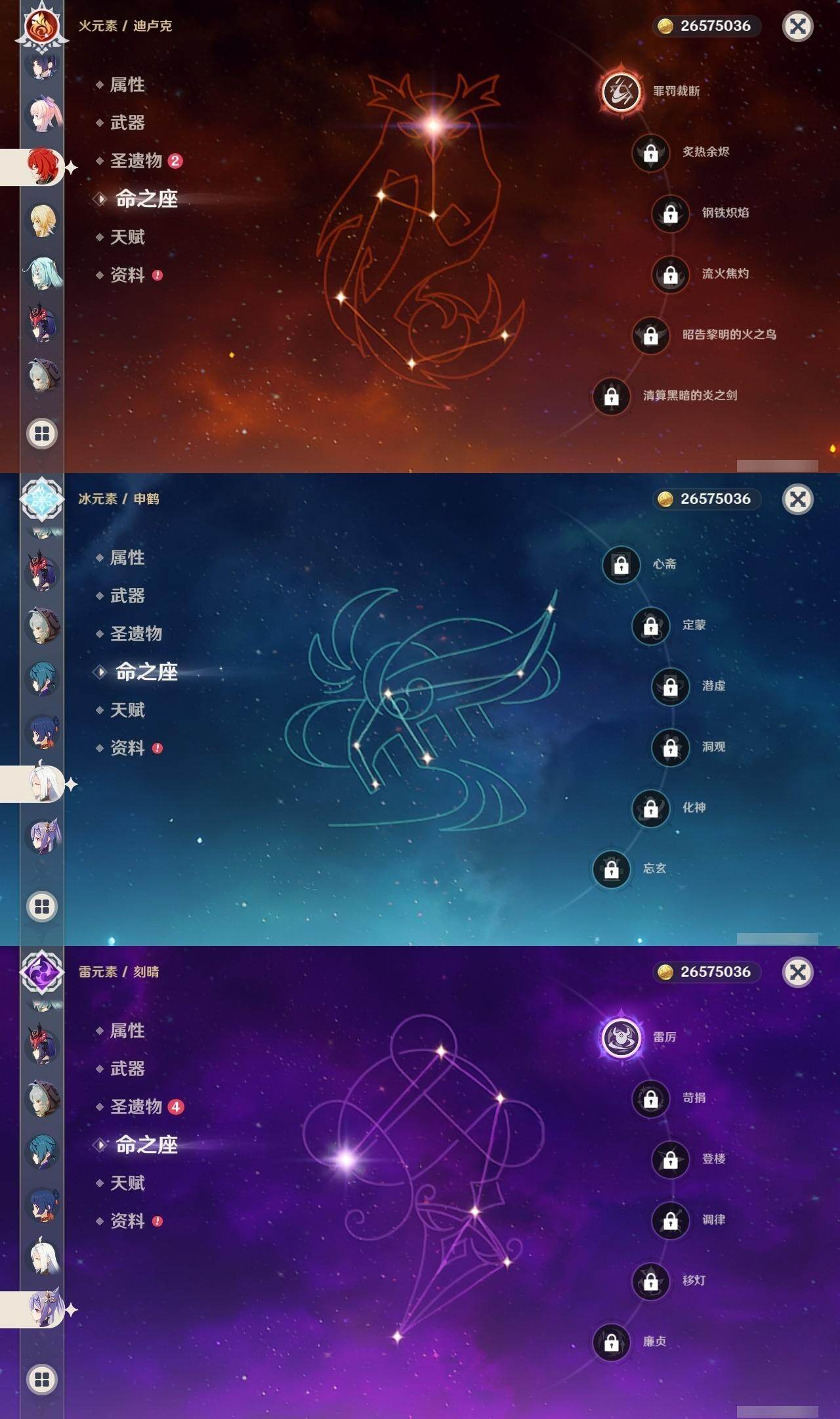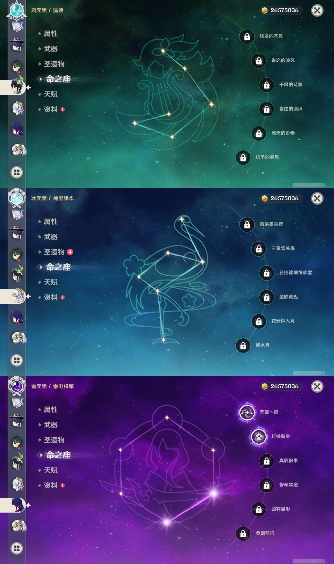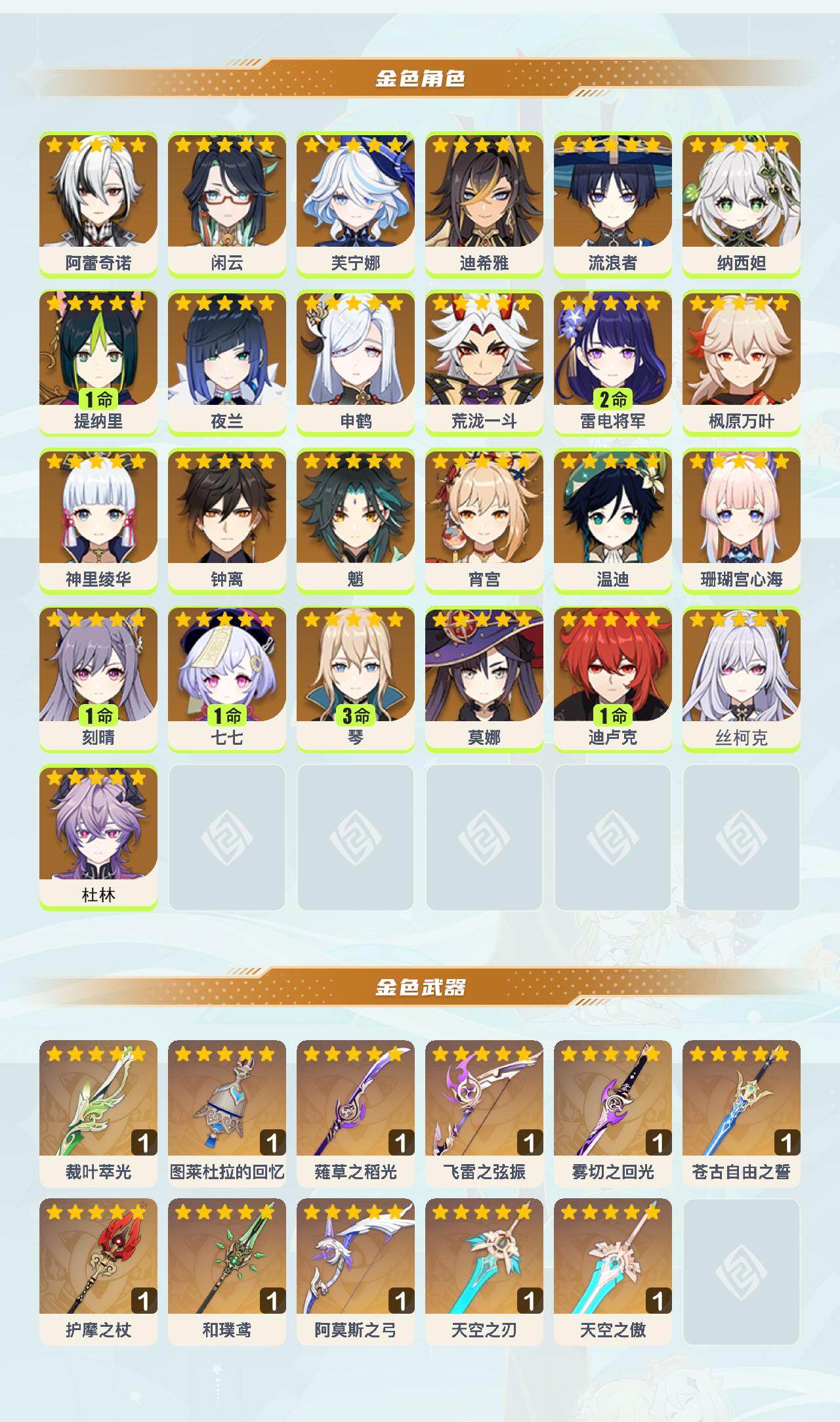 0命阿蕾奇诺,0命闲云,0命芙宁娜,0命迪希雅,0命流浪者,0命纳西妲,1命提纳里,0命夜兰,0命申鹤,0命荒泷一斗,2命雷电将军,0命枫原万叶,0命神里绫华,0命钟离,0命魈,0命宵宫,0命温迪,0命珊瑚宫心海,1命刻晴,1命七七,3命琴,0命莫娜,1命迪卢克,0命丝柯克,0命杜林,精1裁叶萃光,精1图莱杜拉的回忆,精1薙草之稻光,精1飞雷之弦振,精1雾切之回光,精1苍古自由之誓,精1护摩之杖,精1和璞鸢,精1阿莫斯之弓,精1天空之刃,精1天空之傲