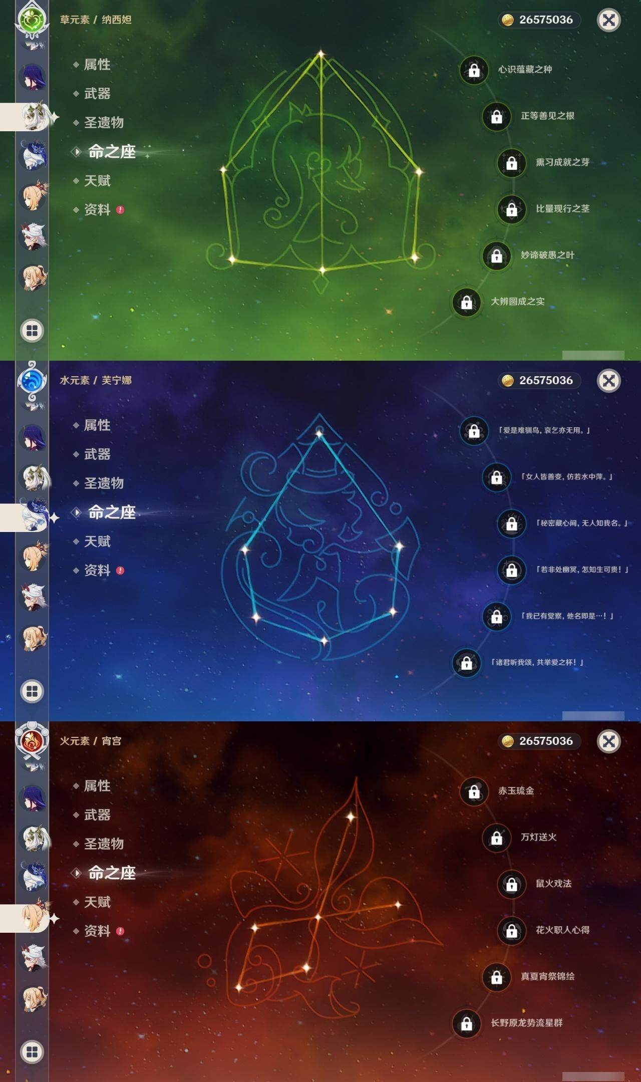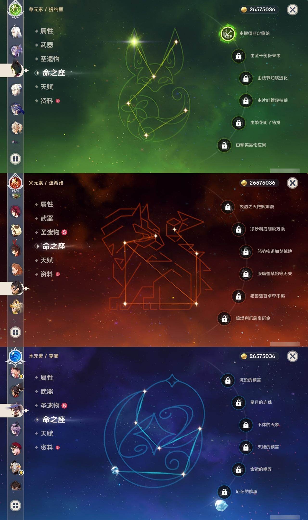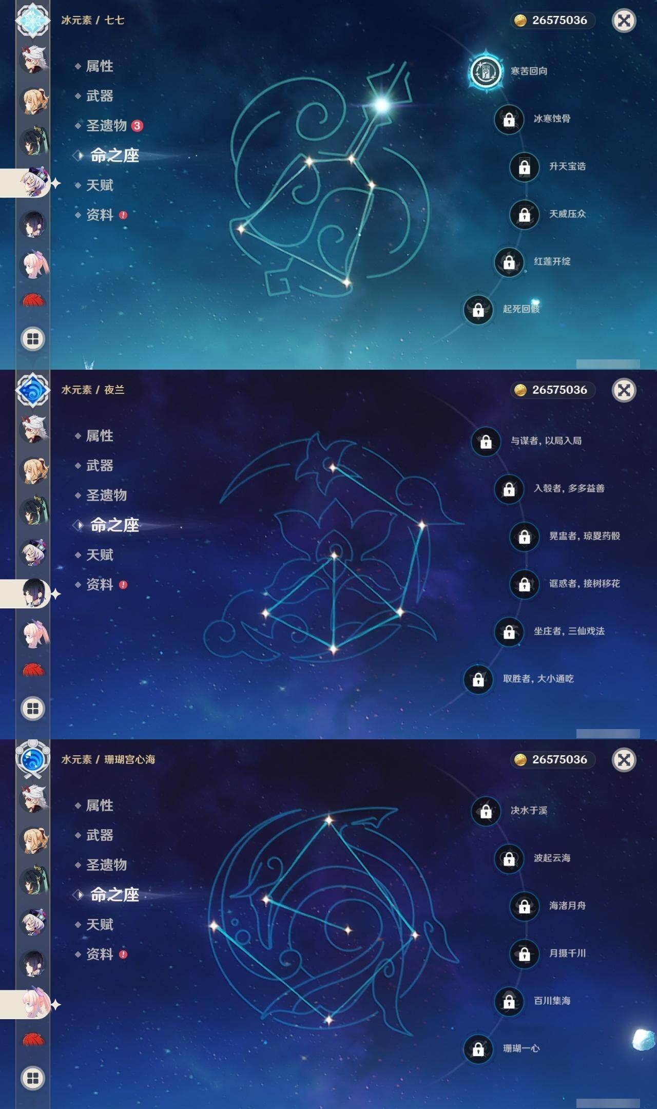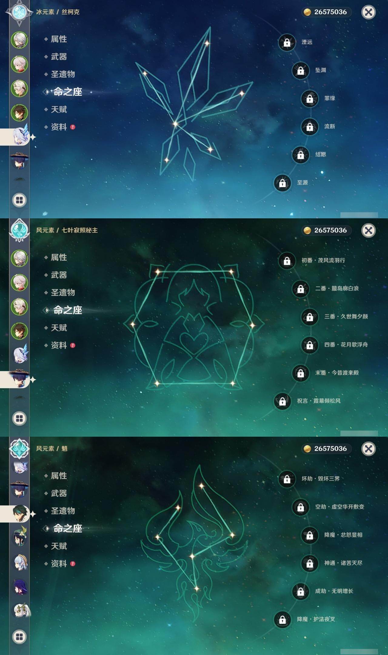 0命阿蕾奇诺,0命闲云,0命芙宁娜,0命迪希雅,0命流浪者,0命纳西妲,1命提纳里,0命夜兰,0命申鹤,0命荒泷一斗,2命雷电将军,0命枫原万叶,0命神里绫华,0命钟离,0命魈,0命宵宫,0命温迪,0命珊瑚宫心海,1命刻晴,1命七七,3命琴,0命莫娜,1命迪卢克,0命丝柯克,0命杜林,精1裁叶萃光,精1图莱杜拉的回忆,精1薙草之稻光,精1飞雷之弦振,精1雾切之回光,精1苍古自由之誓,精1护摩之杖,精1和璞鸢,精1阿莫斯之弓,精1天空之刃,精1天空之傲