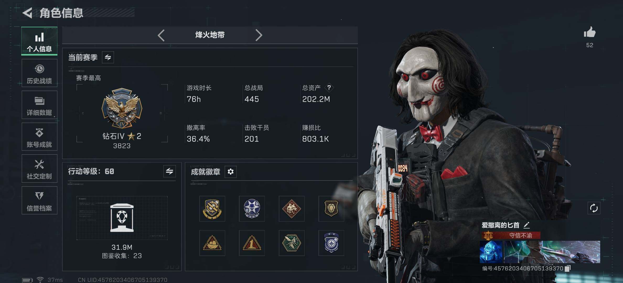[15456182]【特价出售/店主推荐】202m总资产-5752k哈伏币-60烽火等级-钻石-19战场等级-列兵