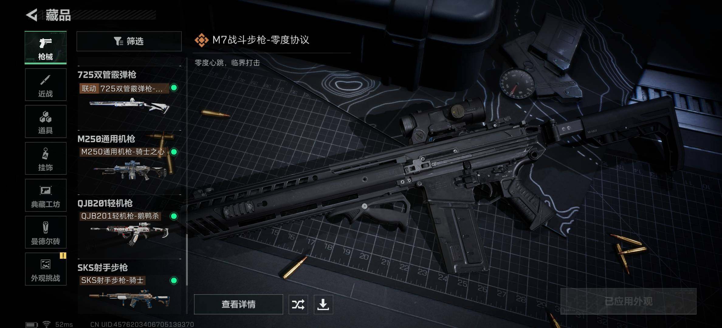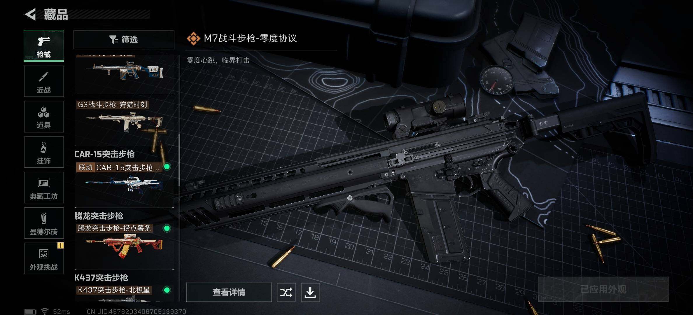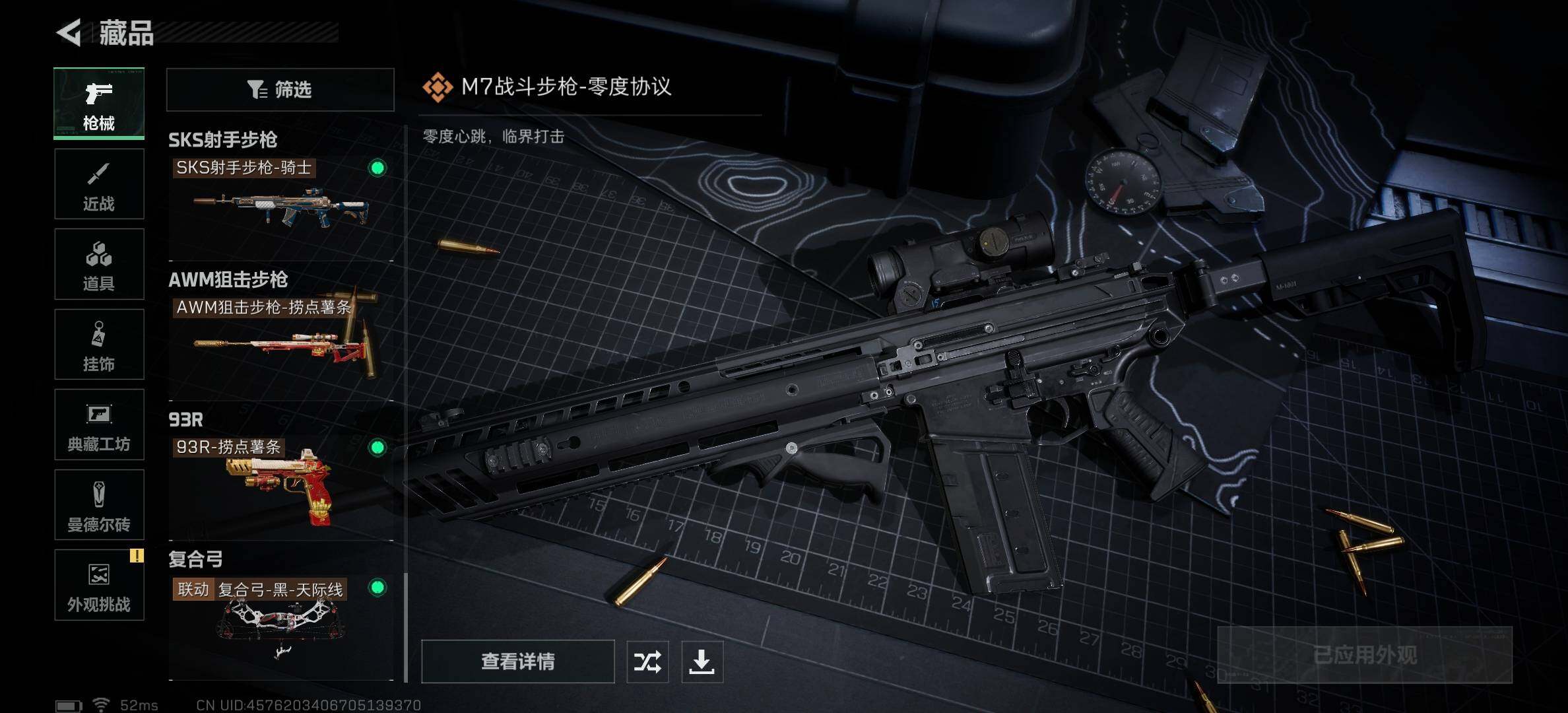 【传说外观】:M4A1突击步枪-蚀金玫瑰,M4A1突击步枪-阿米娅,ASh-12战斗步枪-鹅鸭杀,M16A4突击步枪-狩猎时刻,M7战斗步枪-零度协议,SG552突击步枪-运动员,SCAR-H战斗步枪-启航,G3战斗步枪-狩猎时刻,G3战斗步枪-骑士,CAR-15突击步枪-阿米娅,腾龙突击步枪-捞点薯条,K437突击步枪-北极星,KC17突击步枪-电锯惊魂,Vector冲锋枪-狩猎时刻,勇士冲锋枪-能天使-午夜邮差,QCQ171冲锋枪-北极星,QCQ171冲锋枪-鹅鸭杀,725双管霰弹枪-送葬人-无题密令,M250通用机枪-骑士之心,QJB201轻机枪-鹅鸭杀,AWM狙击步枪-捞点薯条,93R-捞点薯条,复合弓-黑·天际线