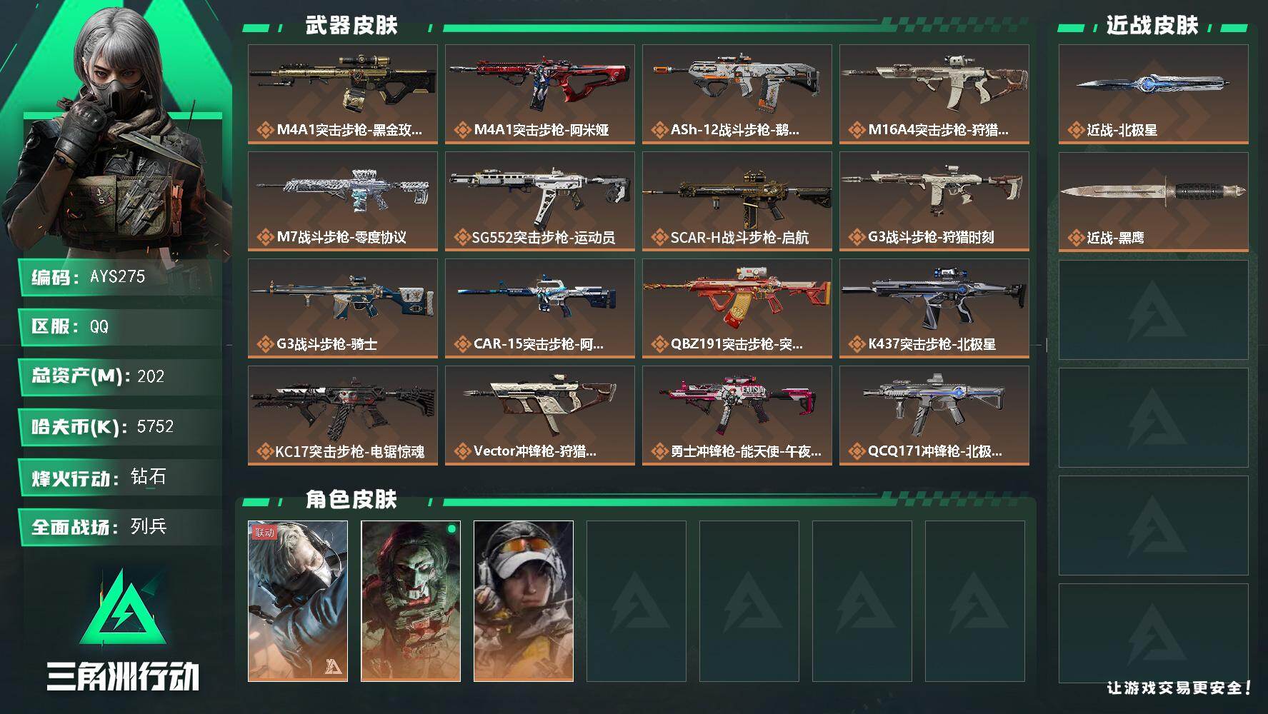 [15456182]【特价出售/店主推荐】202m总资产-5752k哈伏币-60烽火等级-钻石-19战场等级-列兵 【干员外观】:蜂医-送葬人·无题密令,红狼-电锯惊魂,露娜-金牌射手 【近战皮肤】:近战-北极星,近战-黑鹰 【传说外观】:M4A1突击步枪-蚀金玫瑰,M4A1突击步枪-阿米娅,ASh-12战斗步枪-鹅鸭杀,M16A4突击步枪-狩猎时刻,M7战斗步枪-零度协议,SG552突击步枪-运动员,SCAR-H战斗步枪-启航,G3战斗步枪-狩猎时刻,G3战斗步枪-骑士,CAR-15突击步枪-阿米娅,腾龙突击步枪-捞点薯条,K437突击步枪-北极星,KC17突击步枪-电锯惊魂,Vector冲锋枪-狩猎时刻,勇士冲锋枪-能天使-午夜邮差,QCQ171冲锋枪-北极星,QCQ171冲锋枪-鹅鸭杀,725双管霰弹枪-送葬人-无题密令,M250通用机枪-骑士之心,QJB201轻机枪-鹅鸭杀,AWM狙击步枪-捞点薯条,93R-捞点薯条,复合弓-黑·天际线 【史诗外观】:AKM突击步枪-林中猎手,ASh-12战斗步枪-无极限,AUG突击步枪-蝮蛇,M7战斗步枪-百步穿杨,SG552突击步枪-深海恐惧,SCAR-H战斗步枪-囚徒,G3战斗步枪-流沙送葬,AS Val突击步枪-百步穿杨,腾龙突击步枪-无垢,腾龙突击步枪-猎鳄行动,K437突击步枪-守护者,MP5冲锋枪-深海恐惧,MP5冲锋枪-战术竞备,MP5冲锋枪-竞技风,Vector冲锋枪-猎鳄行动,Vector冲锋枪-百步穿杨,SR-3M紧凑突击步枪-荒野求生,SR-3M紧凑突击步枪-战术竞备,勇士冲锋枪-深海恐惧,勇士冲锋枪-工业狂潮,MP7冲锋枪-无垢,MP7冲锋枪-守护者,M1014霰弹枪-林中猎手,PKM通用机枪-蝮蛇,PKM通用机枪-荒野求生,Mini-14射手步枪-守护者,SVD狙击步枪-暗夜猎手,SVD狙击步枪-荒野求生,PSG-1射手步枪-无垢,SV-98狙击步枪-林中猎手,SV-98狙击步枪-囚徒,M700狙击步枪-蝮蛇,M700狙击步枪-百步穿杨,AWM狙击步枪-无极限,AWM狙击步枪-流沙送葬,沙漠之鹰-曙光,复合弓-守护者 【稀有外观】:野牛冲锋枪-黑潮,M4A1突击步枪-繁盛,AKM突击步枪-战术演练,AKM突击步枪-肃杀,QBZ95-1突击步枪-公平竞技,ASh-12战斗步枪-繁盛,K416突击步枪-虎啸,M7战斗步