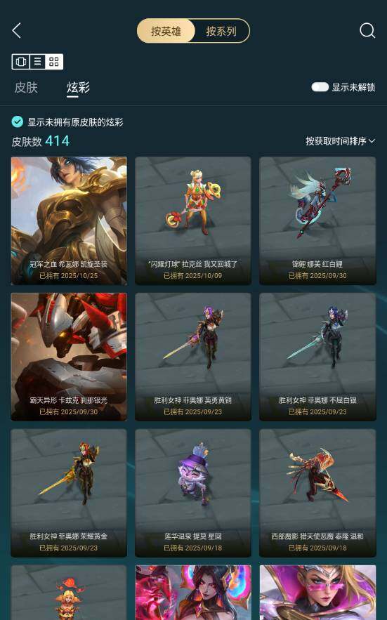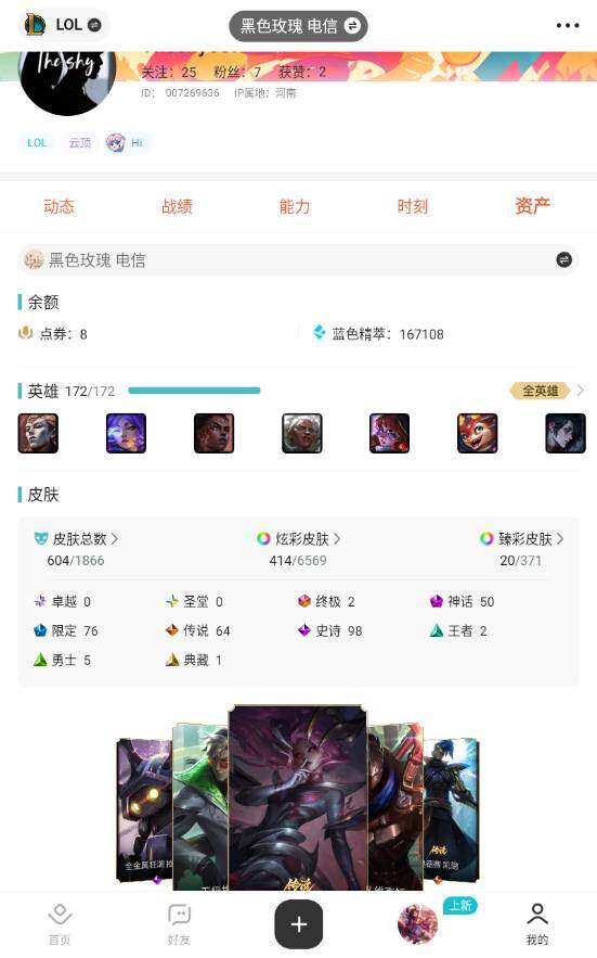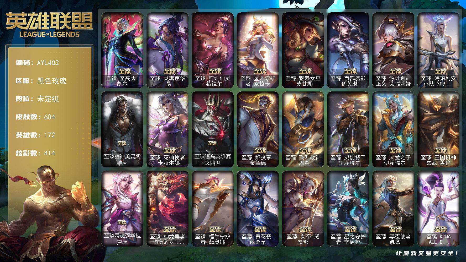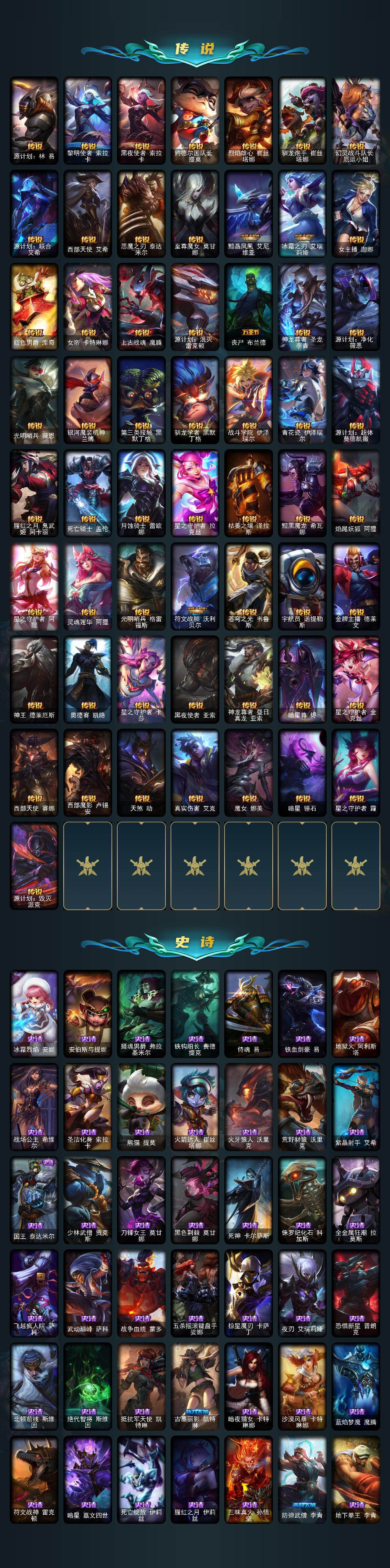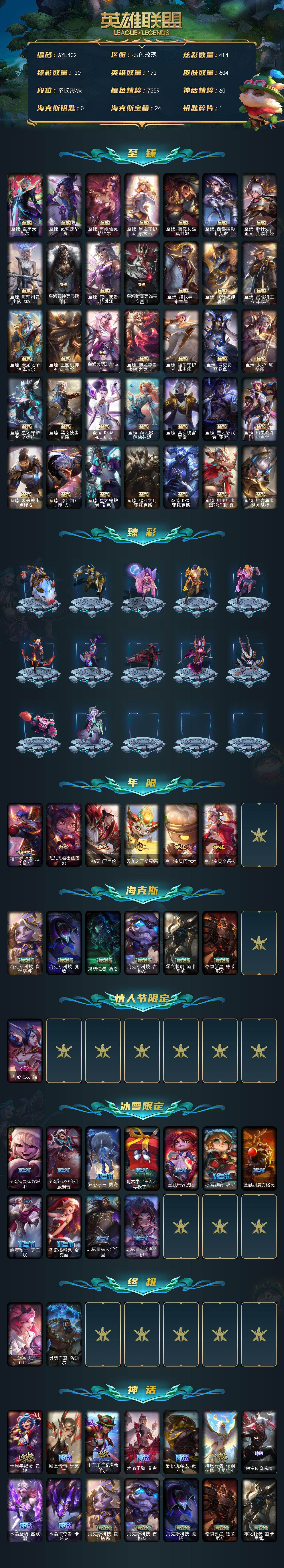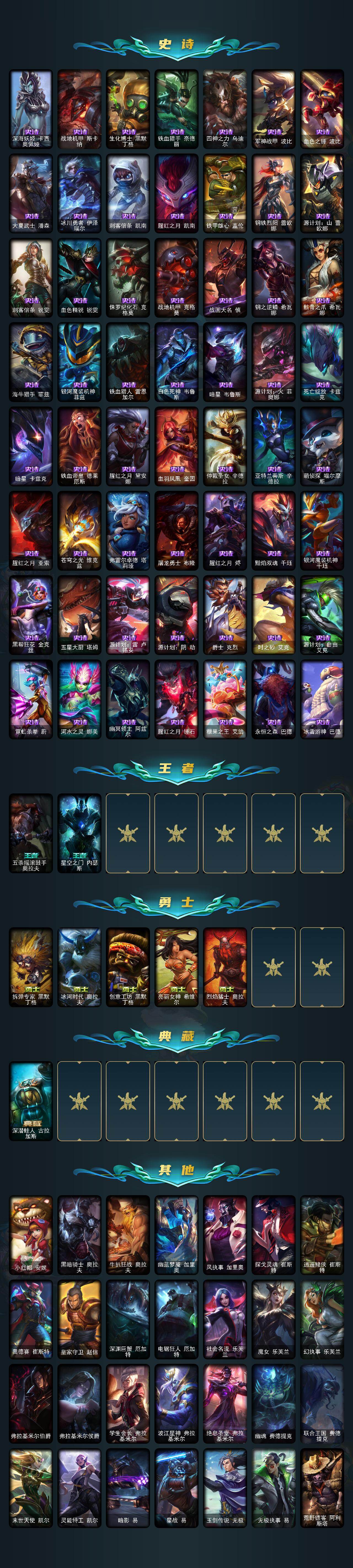未定级段位-172英雄-604皮肤-414炫彩-4终极-50神话-76限定-64传说-98史诗