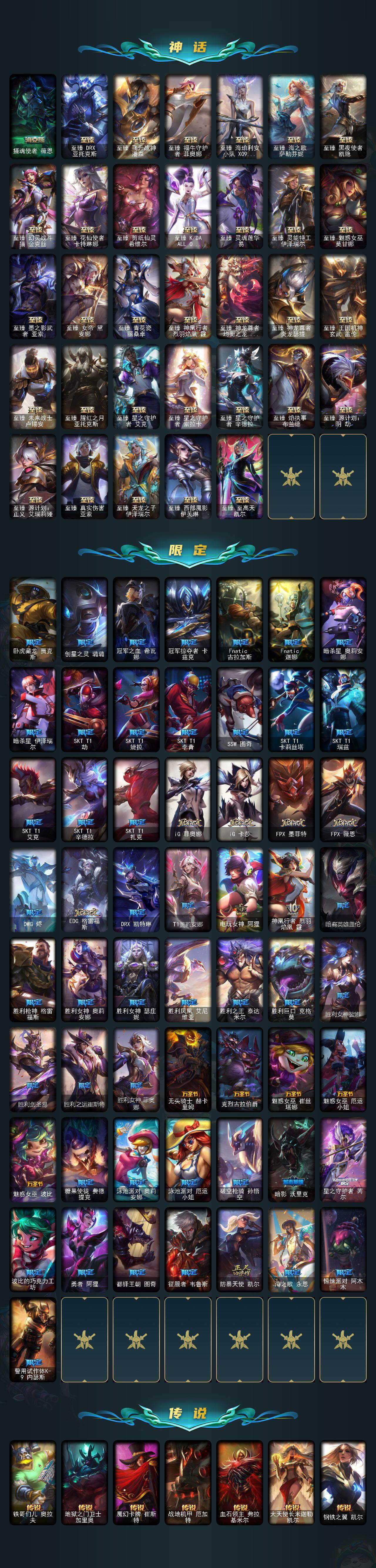 【神话皮肤】:十周年纪念安妮,殿堂传奇乐芙兰,十五周年纪念希维尔,水晶圣骑艾希,新卧虎藏龙贾克斯,神凰行者瑞羽圣凰艾尼维亚,殿堂传奇薇恩,水晶圣骑蕾欧娜,水晶掠夺者