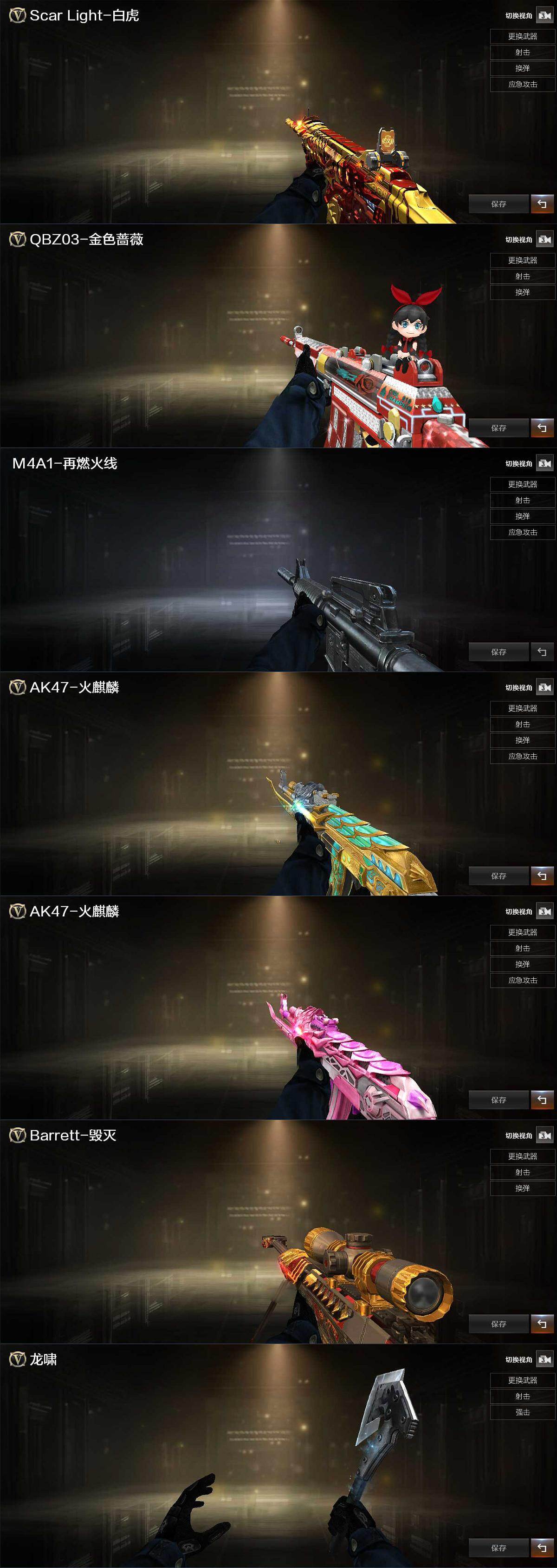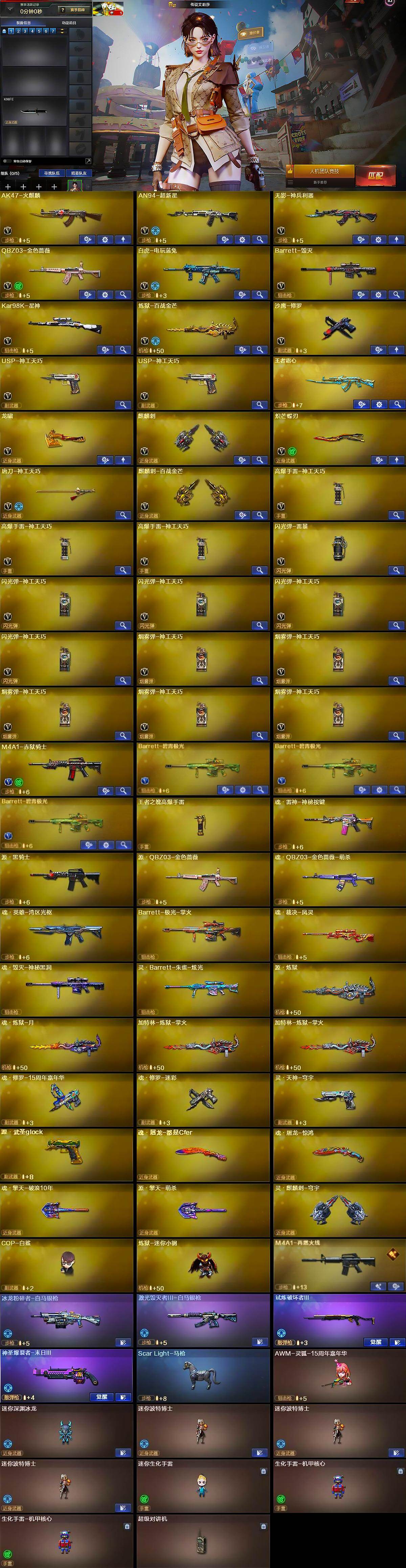 【英雄级武器】:AK47-火麒麟,AN94-超新星,无影-神兵利器,QBZ03-金色蔷薇,白虎-电玩蓝兔,Barrett-毁灭,Kar98K-星神,炼狱-百战金芒,沙鹰-修罗,USP-神工天巧*2,龙啸,麒麟刺,炽芒蝶刃,唐刀-神工天巧,麒麟刺-百战金芒,高爆手雷-神工天巧*3,闪光弹-雷暴,闪光弹-神工天巧*4,烟雾弹-神工天巧*5,M4A1-赤狱骑士,Barrett-碧霄极光*3