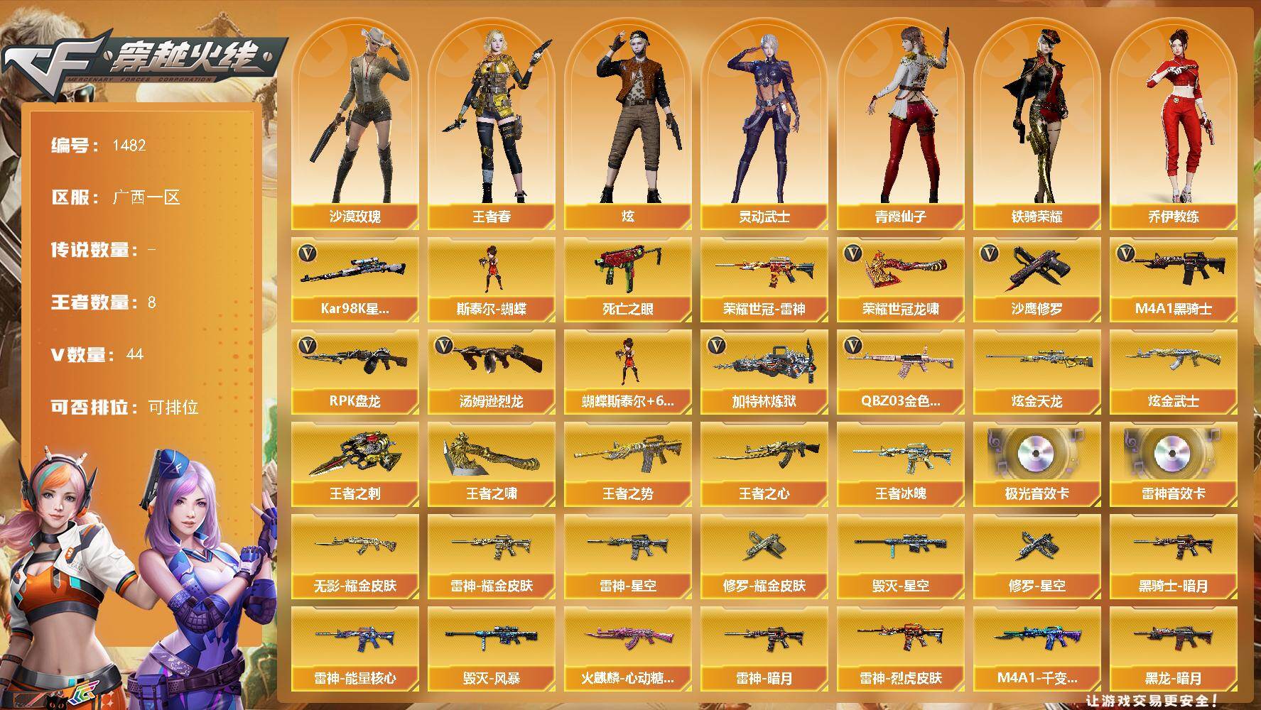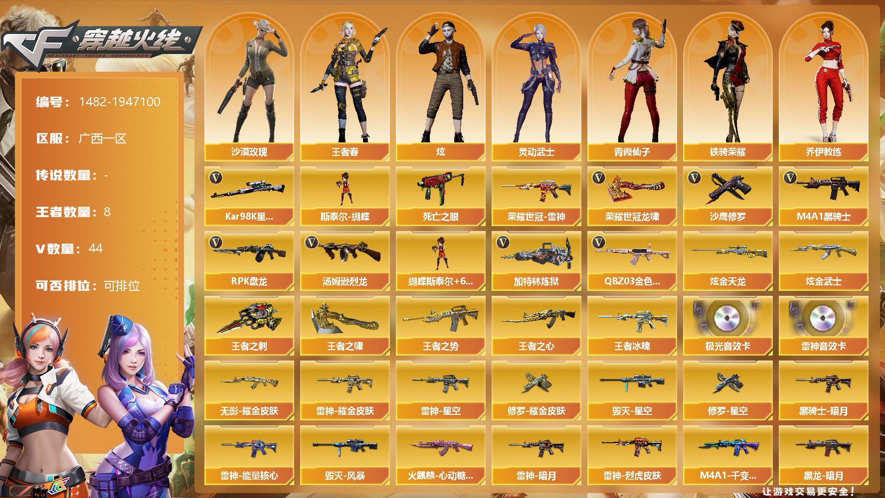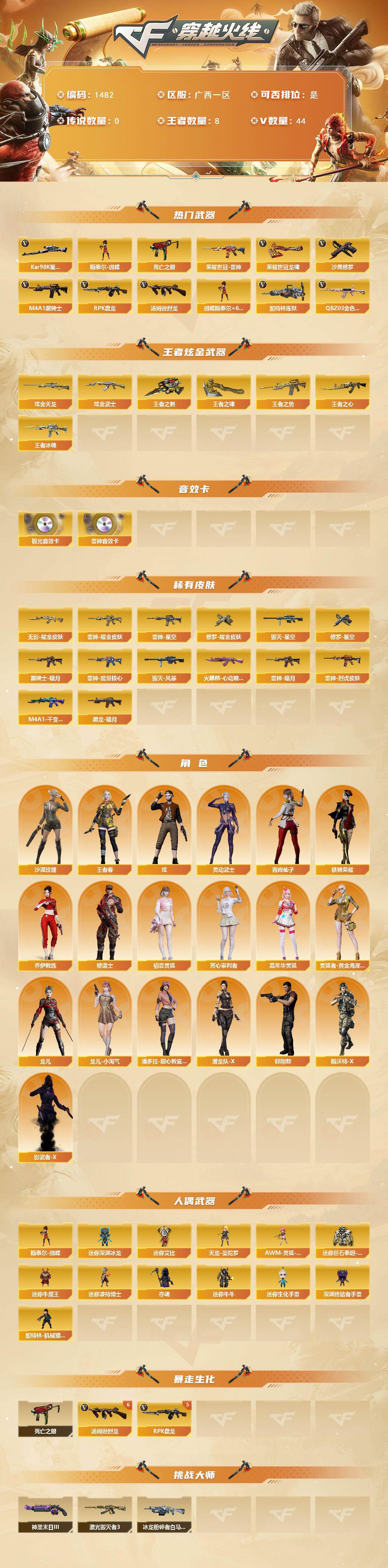 [15459122]广西一区-44V-8王者-4炫金 【热门武器】:QBZ03-金色蔷薇*2,死亡之眼,荣耀世冠-雷神,Kar98K-星神,M4A1-黑骑士,汤姆逊-烈龙*6,RPK-盘龙*5,加特林-炼狱,斯泰尔-蝴蝶,沙鹰-修罗*3,荣耀世冠-龙啸 【王者炫金武器】:王者冰魄,王者之势,王者之心,王者之刺,王者之啸,炫金武士,炫金天龙*3 【音效卡】:M4A1-雷神音效卡,Barrett-极光音效卡 【皮肤】