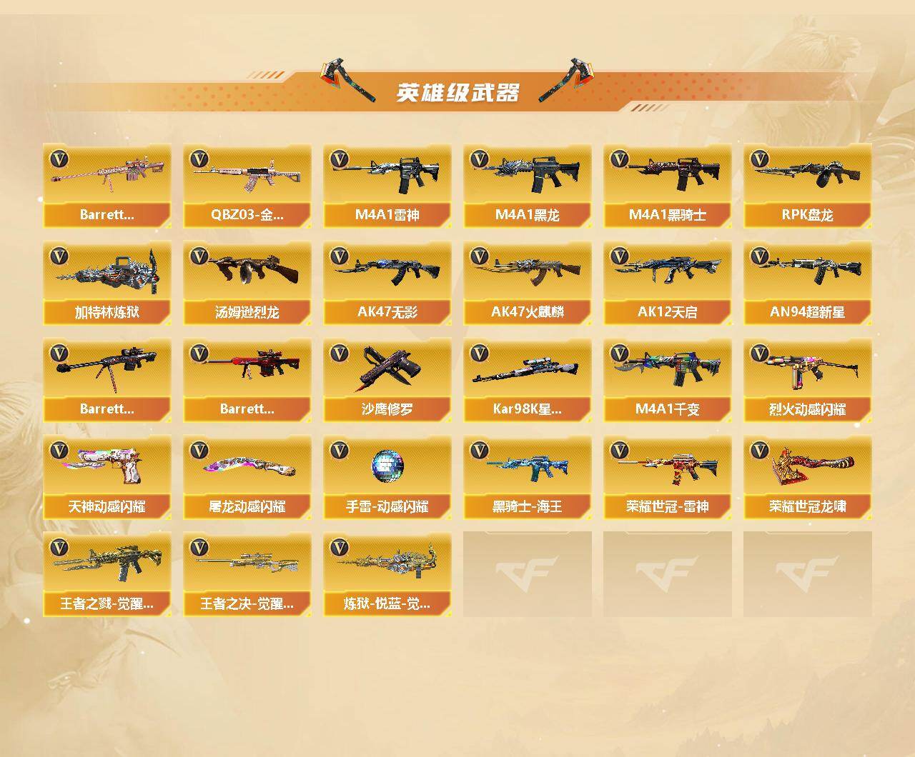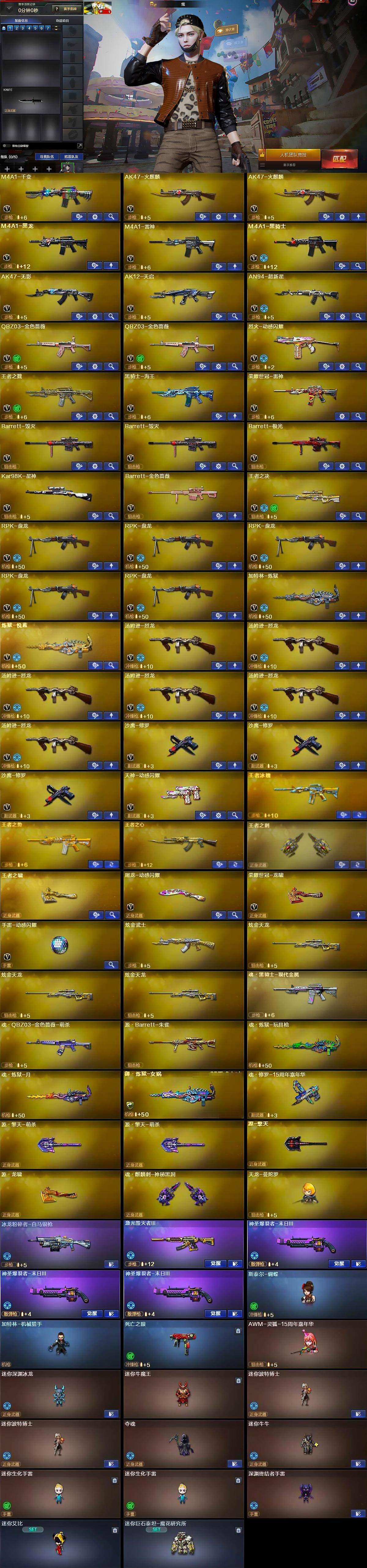 【热门武器】:QBZ03-金色蔷薇*2,死亡之眼,荣耀世冠-雷神,Kar98K-星神,M4A1-黑骑士,汤姆逊-烈龙*6,RPK-盘龙*5,加特林-炼狱,斯泰尔-蝴蝶,沙鹰-修罗*3,荣耀世冠-龙啸