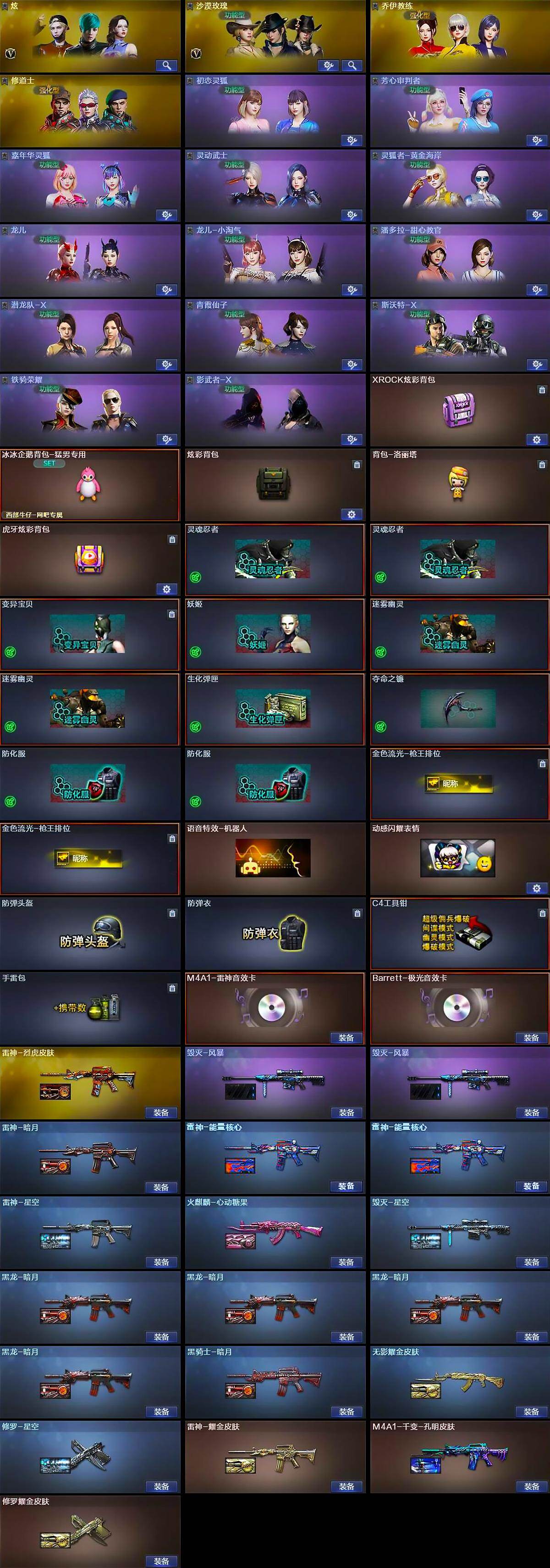 - [13757373]云南一区-44V-12王者-1炫金 【热门武器】:M200-幻神,死亡之眼,M4A1-黑骑士,汤姆逊-烈龙*2,加特林-炼狱,沙鹰-修罗*3 【王者炫金武器】:王者之戮,王者之翼,王者之势,王者之怒,王者之力*2,王者之啸,王者之击,王者之锋,炫金雷神 【音效卡】:AK47-火麒麟音效卡,M4A1-黑骑士音效卡,Barrett-毁灭音效卡 【皮肤】:雷神-暗月,雷神-能量核心,火麒麟-心动糖果,毁灭-星空,M4A1-千变-孔明皮肤,AK47-黑武士-361,战神-紫绶金章皮肤,战神-流金岁月皮肤,AK47-B-常胜将军-刘备,天龙-能量核心,极光-能量核心 【角色】:审判者,风暴女,嘉年华灵狐,娟娟,麻雀,曼陀罗-X,潘多拉-X,潜龙队-X,青霞仙子,斯沃特-X 【人偶武器】:AWM-灵狐-15周年嘉年华,灵狐娃娃手雷 【暴走生化】:死亡之眼 【挑战大师】:冰龙粉碎者-白马银枪,阐释者III 【英雄级武器】:AK47-火麒麟*3,M4A1-雷神*2,M4A1-黑骑士,M4A1-死神,AK47-黑武士,M4A1-武圣,AK47-黑鲨,M4A1-龙血*4,王者之武-觉醒版,王者之魄-觉醒版,AK-47-猩红传说,AWM-天龙,Barrett-毁灭*2,Barrett-极光,AWM-裁决,M200-幻神,Barrett-金色蔷薇,加特林-炼狱,汤姆逊-烈龙*2,沙鹰-修罗*3,沙鹰-天神*2,屠龙,龙啸,麒麟刺-堕天神,擎天,麒麟刺*3,王者之击-觉醒版,高爆手雷-堕天神,闪光弹-堕天神,烟雾弹-堕天神 【道具】:超级背包,夺命之镰,防化服,金色流光-枪王排位*2,星辰流光-枪王排位,巅峰赛先锋-金色流光,枪王排位28赛季金色流光,防弹头盔,防弹衣*2,C4工具钳,手雷包 【特殊枪械】:1黑骑士,2烈龙,1炼狱