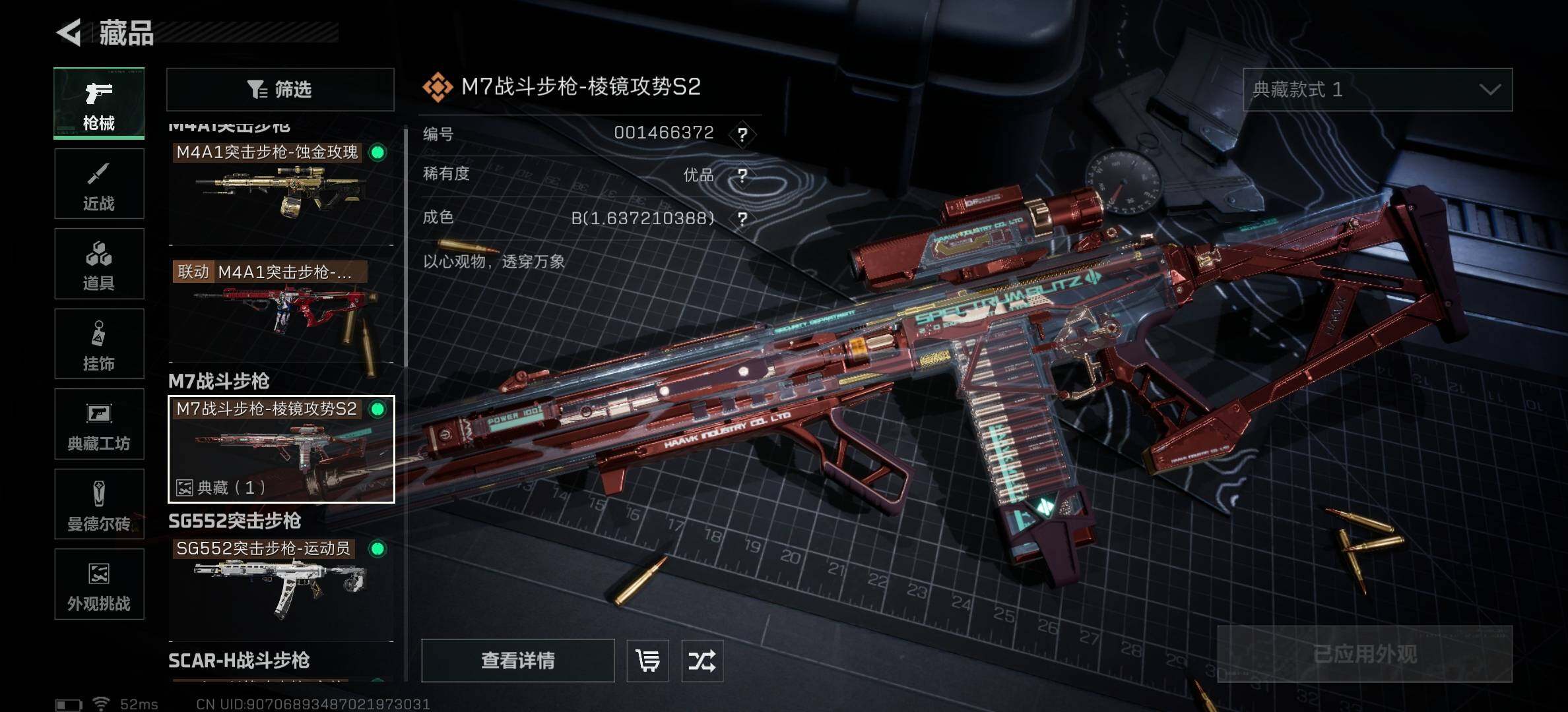 【稀有外观】:M4A1突击步枪-繁盛,AKM突击步枪-战术演练,AKM突击步枪-肃杀,QBZ95-1突击步枪-公平竞技,ASh-12战斗步枪-繁盛,M7战斗步枪-精英联盟,M7战斗步枪-捣蛋鬼,SCAR-H战斗步枪-黄昏,G3战斗步枪-战术演练,G3战斗步枪-主宰,腾龙突击步枪-冰天雪地,MP5冲锋枪-弄臣,MP5冲锋枪-哈夫克卫队,P90冲锋枪-黄昏,P90冲锋枪-捣蛋鬼,UZI冲锋枪-亚特兰蒂斯,SMG-45-行动开启,勇士冲锋枪-主宰,勇士冲锋枪-冰天雪地,M1014霰弹枪-幻影结构,S12K霰弹枪-战术演练,QJB201轻机枪-黄昏,QJB201轻机枪-哈夫克卫队,Mini-14射手步枪-荣耀列队,SR9射手步枪-肃杀,PSG-1射手步枪-主宰,AWM狙击步枪-精英联盟