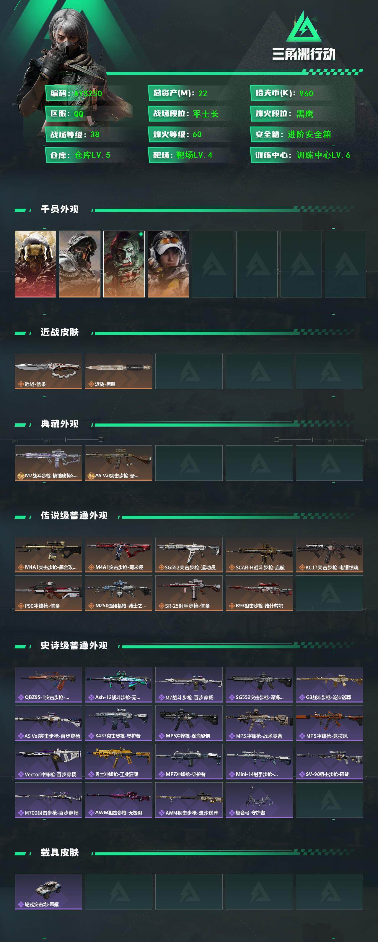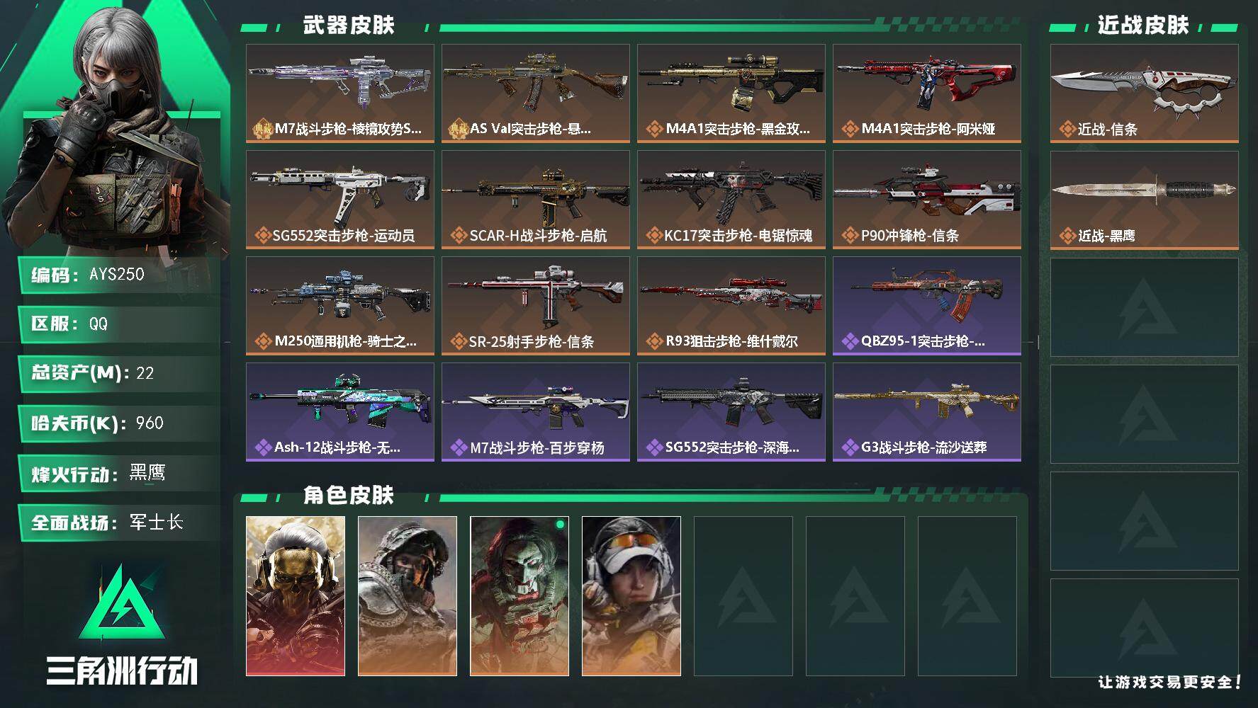 [15459613]【店主推荐捡漏号!可直接换绑】22m总资产-960k哈伏币-60烽火等级-黑鹰-38战场等级-军士长 【干员外观】:红狼-蚀金玫瑰,深蓝-不破誓约,红狼-电锯惊魂,露娜-金牌射手 【近战皮肤】:近战-信条,近战-黑鹰 【典藏外观】:M7战斗步枪-棱镜攻势S2,AS Val突击步枪-悬赏令 【传说外观】:M4A1突击步枪-蚀金玫瑰,M4A1突击步枪-阿米娅,SG552突击步枪-运动员,SCAR-H战斗步枪-启航,KC17突击步枪-电锯惊魂,P90冲锋枪-信条,M250通用机枪-骑士之心,SR-25射手步枪-信条,R93狙击步枪-维什戴尔 【史诗外观】:QBZ95-1突击步枪-曙光,ASh-12战斗步枪-无极限,M7战斗步枪-百步穿杨,SG552突击步枪-深海恐惧,G3战斗步枪-流沙送葬,AS Val突击步枪-百步穿杨,K437突击步枪-守护者,MP5冲锋枪-深海恐惧,MP5冲锋枪-战术竞备,MP5冲锋枪-竞技风,Vector冲锋枪-百步穿杨,勇士冲锋枪-工业狂潮,MP7冲锋枪-守护者,Mini-14射手步枪-守护者,SV-98狙击步枪-囚徒,M700狙击步枪-百步穿杨,AWM狙击步枪-无极限,AWM狙击步枪-流沙送葬,复合弓-守护者 【稀有外观】:M4A1突击步枪-繁盛,AKM突击步枪-战术演练,AKM突击步枪-肃杀,QBZ95-1突击步枪-公平竞技,ASh-12战斗步枪-繁盛,M7战斗步枪-精英联盟,M7战斗步枪-捣蛋鬼,SCAR-H战斗步枪-黄昏,G3战斗步枪-战术演练,G3战斗步枪-主宰,腾龙突击步枪-冰天雪地,MP5冲锋枪-弄臣,MP5冲锋枪-哈夫克卫队,P90冲锋枪-黄昏,P90冲锋枪-捣蛋鬼,UZI冲锋枪-亚特兰蒂斯,SMG-45-行动开启,勇士冲锋枪-主宰,勇士冲锋枪-冰天雪地,M1014霰弹枪-幻影结构,S12K霰弹枪-战术演练,QJB201轻机枪-黄昏,QJB201轻机枪-哈夫克卫队,Mini-14射手步枪-荣耀列队,SR9射手步枪-肃杀,PSG-1射手步枪-主宰,AWM狙击步枪-精英联盟 【普通外观】:M4A1突击步枪-粉色涂装,M4A1突击步枪-高雅黑,M4A1突击步枪-海色,QBZ95-1突击步枪-高雅黑,QBZ95-1突击步枪-海色,QBZ191突击步枪-三角洲力量,K416突击步枪-几何迷彩,K416突击步枪-高雅黑,M16A4突击步枪-