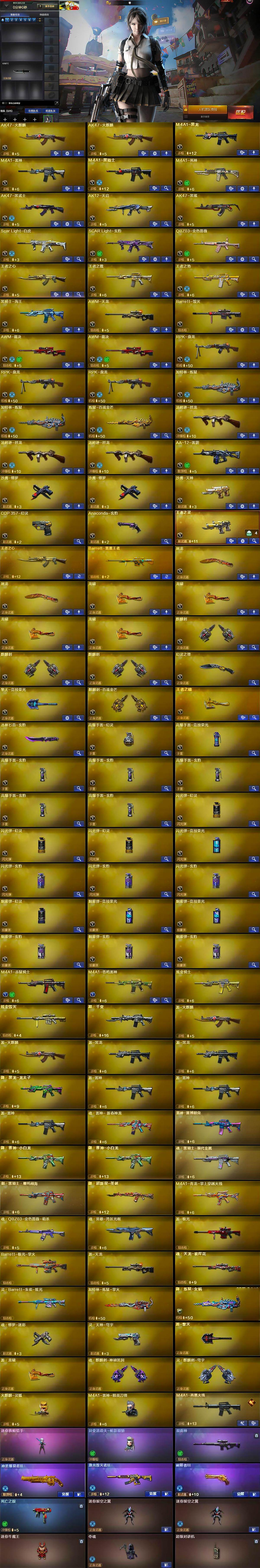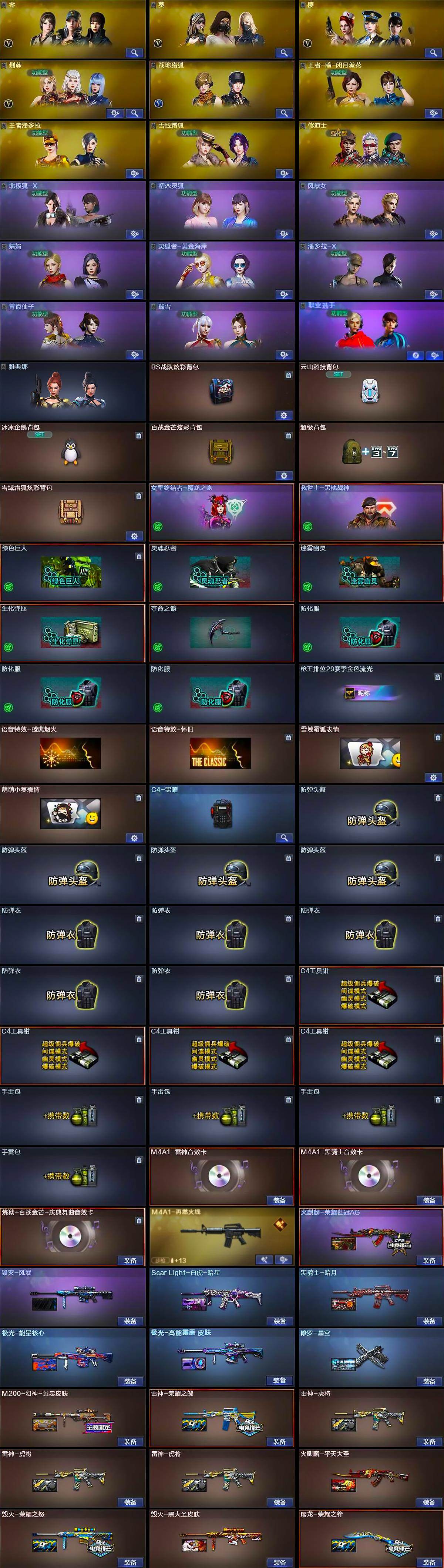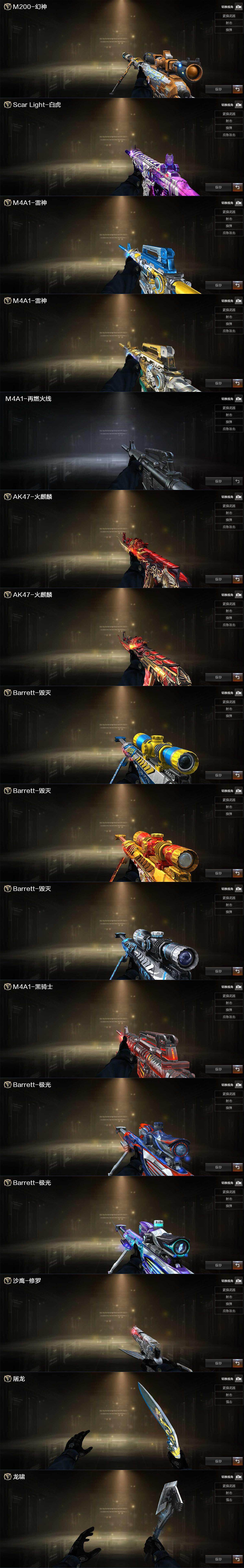 【英雄级武器】:AK47-火麒麟*2,M4A1-黑龙,M4A1-雷神,M4A1-黑骑士,M4A1-死神,AK47-黑武士,AK12-天启,AK47-黑鲨,Scar Light-白虎,SCAR Light-玄豹,QBZ03-金色蔷薇,王者之心-觉醒版,王者之魄-觉醒版,王者之势-觉醒版,黑骑士-海王,AWM-天龙,Barrett-毁灭,AWM-裁决*2,RPK-盘龙*3,加特林-炼狱*2,炼狱-百战金芒,汤姆逊-烈龙*3,AA-12-雷霆,沙鹰-修罗*2,沙鹰-天神,COP 357-幻灵,Anaconda-玄豹,王者之灵-觉醒版,屠龙*2,龙啸*4,麒麟刺*3,幻灵之锋,擎天-竞技荣光,麒麟刺-百战金芒,王者之啸-觉醒版,丛林匕首-玄豹,高爆手雷-幻灵,高爆手雷-竞技荣光,高爆手雷-玄豹*5,闪光弹-幻灵*3,闪光弹-竞技荣光,闪光弹-玄豹*3,烟雾弹-幻灵,烟雾弹-竞技荣光*2,烟雾弹-玄豹*3,M4A1-赤狱骑士,M4A1-苍鸣雷神